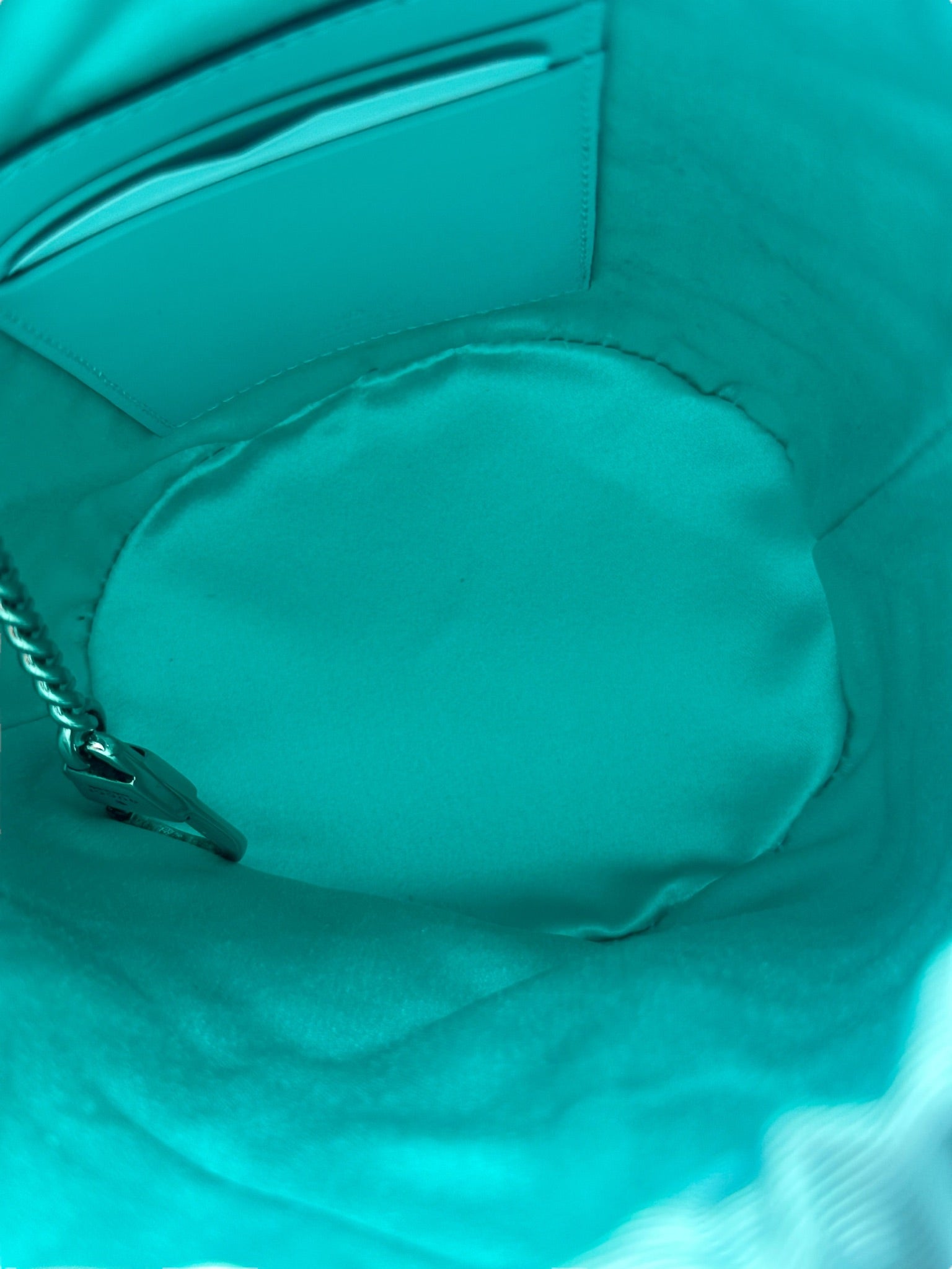Experience luxury and style with this Pre-Owned Gucci Moire Fabric Calfskin Crystal Matelasse Bucket Bag. Featuring sleek silver toned hardware, this bag adds a touch of sophistication to any outfit. Elevate your look and make a statement with this iconic piece. Dimensions: H 6.25'' x W 4.25''