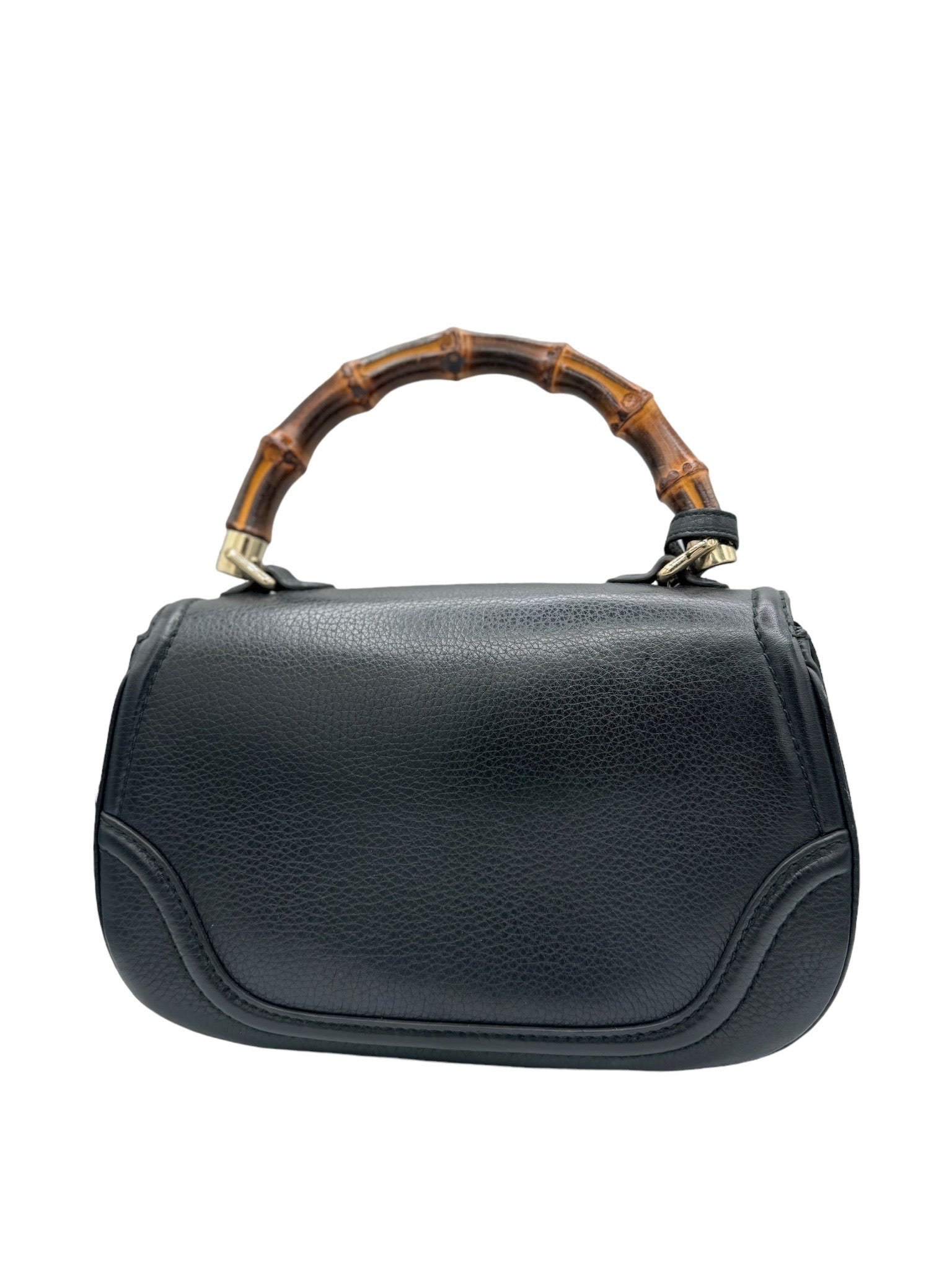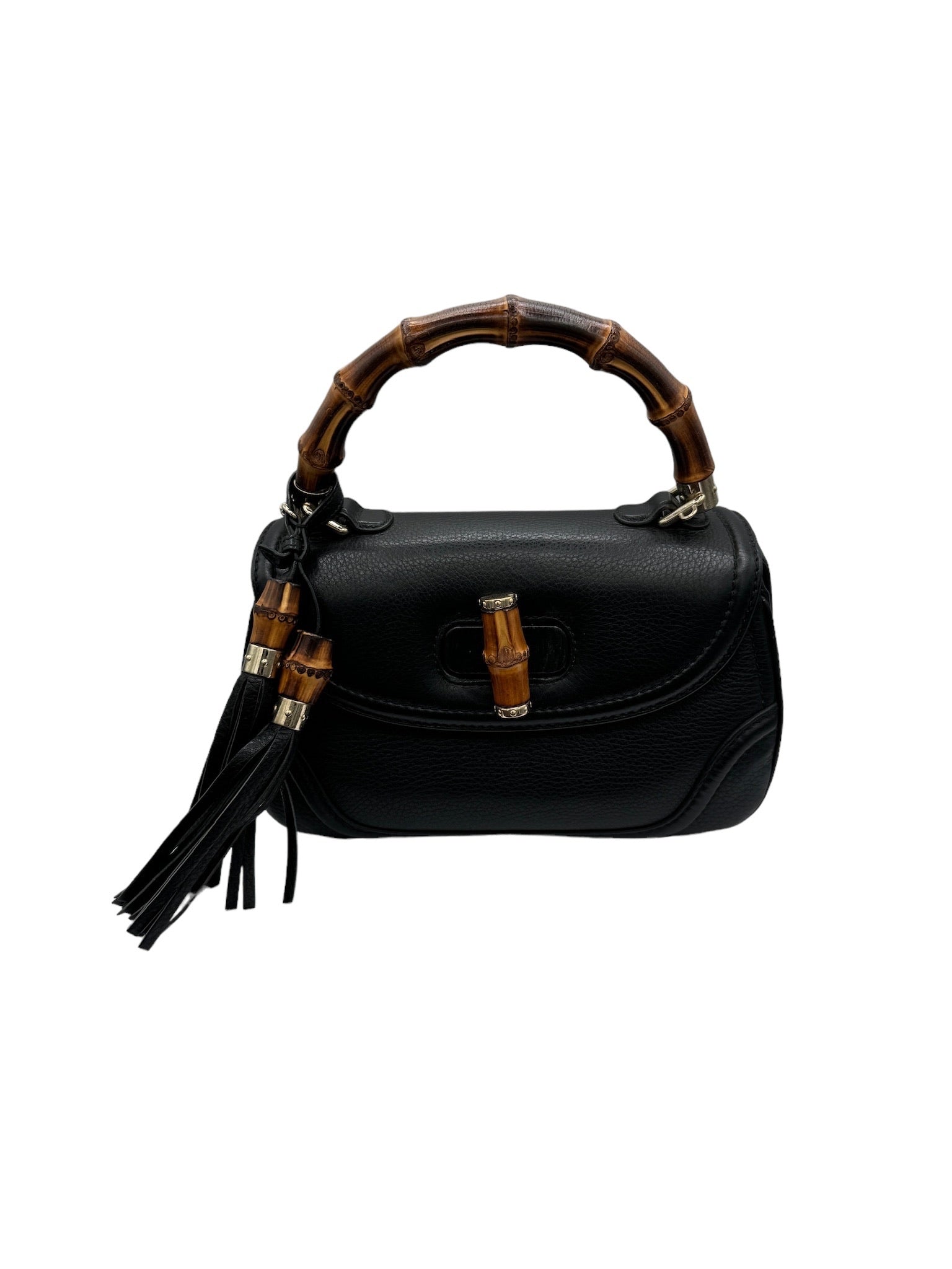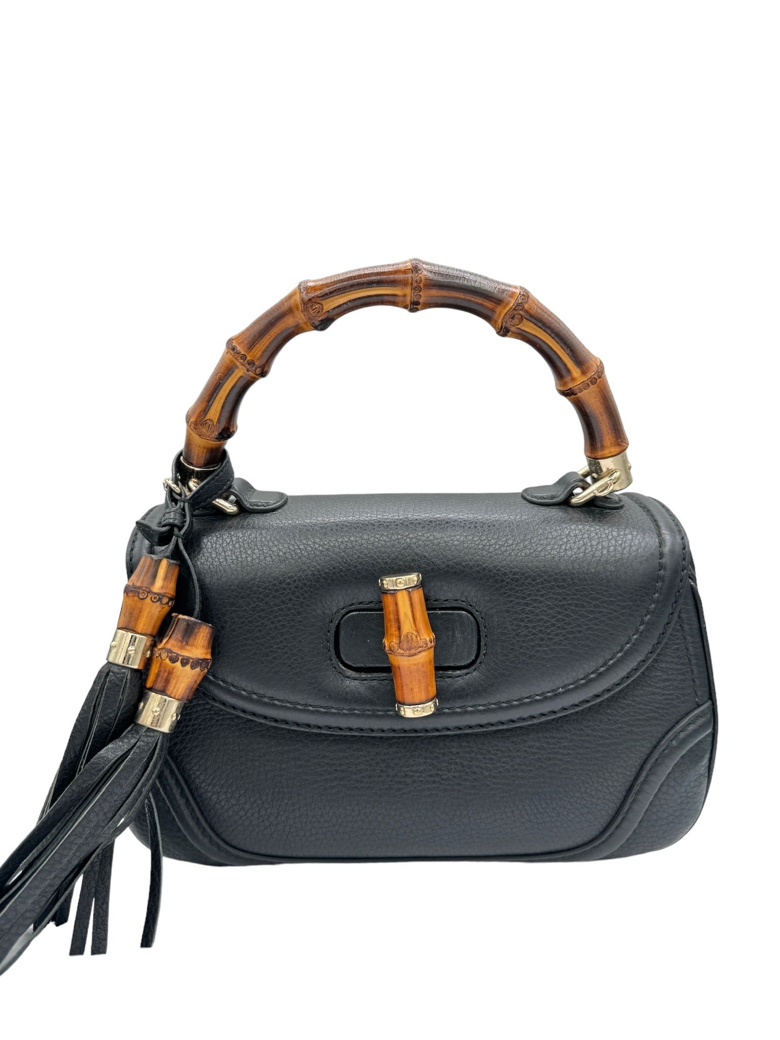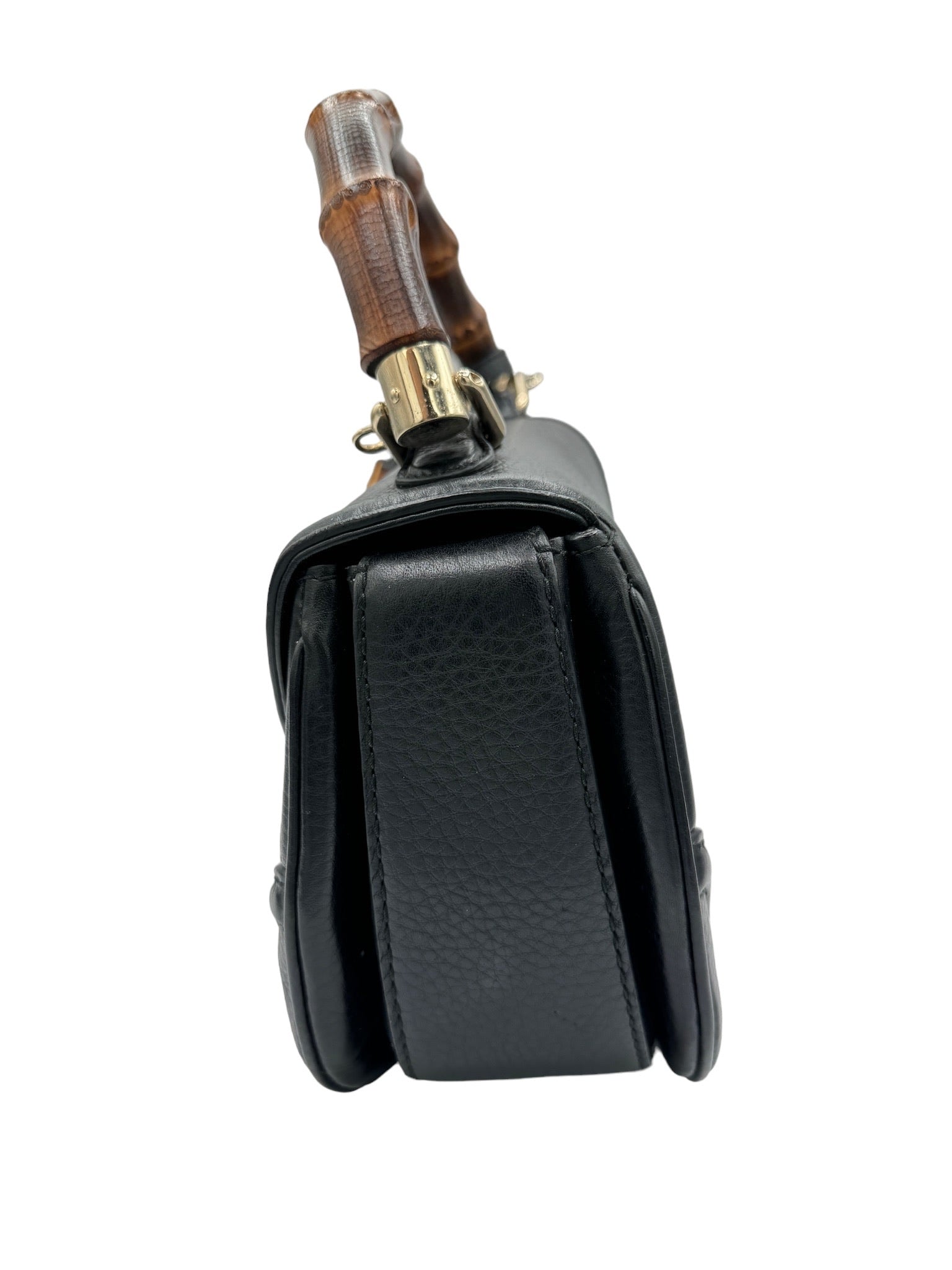 This pre-owned GUCCI New Bamboo Handbag in black leather is a small leather good that will elevate any outfit. Its top handle design is both classic and timeless.