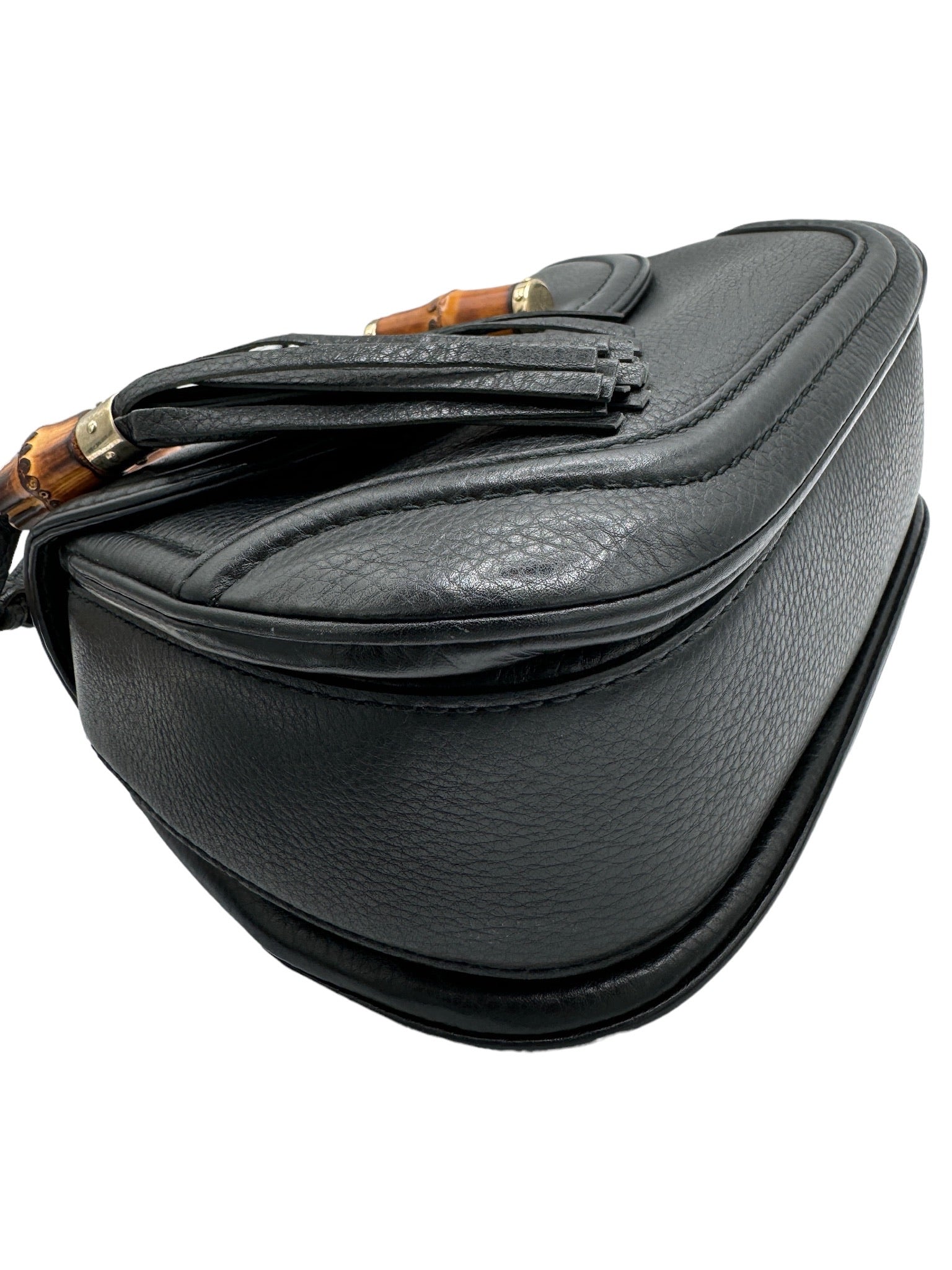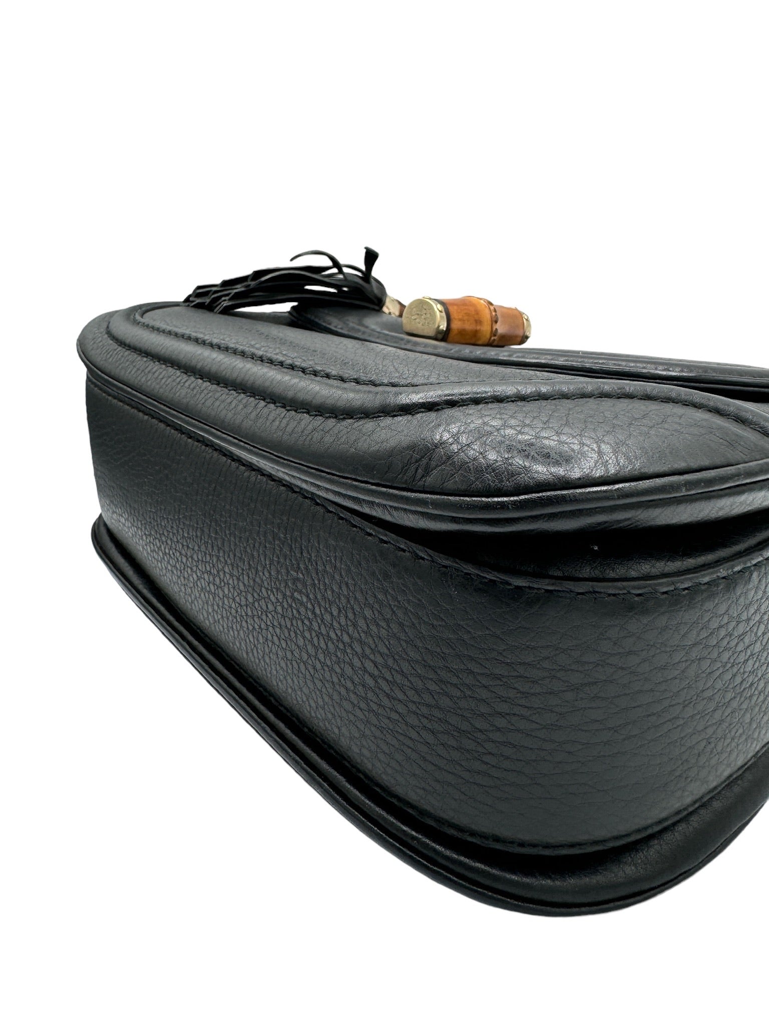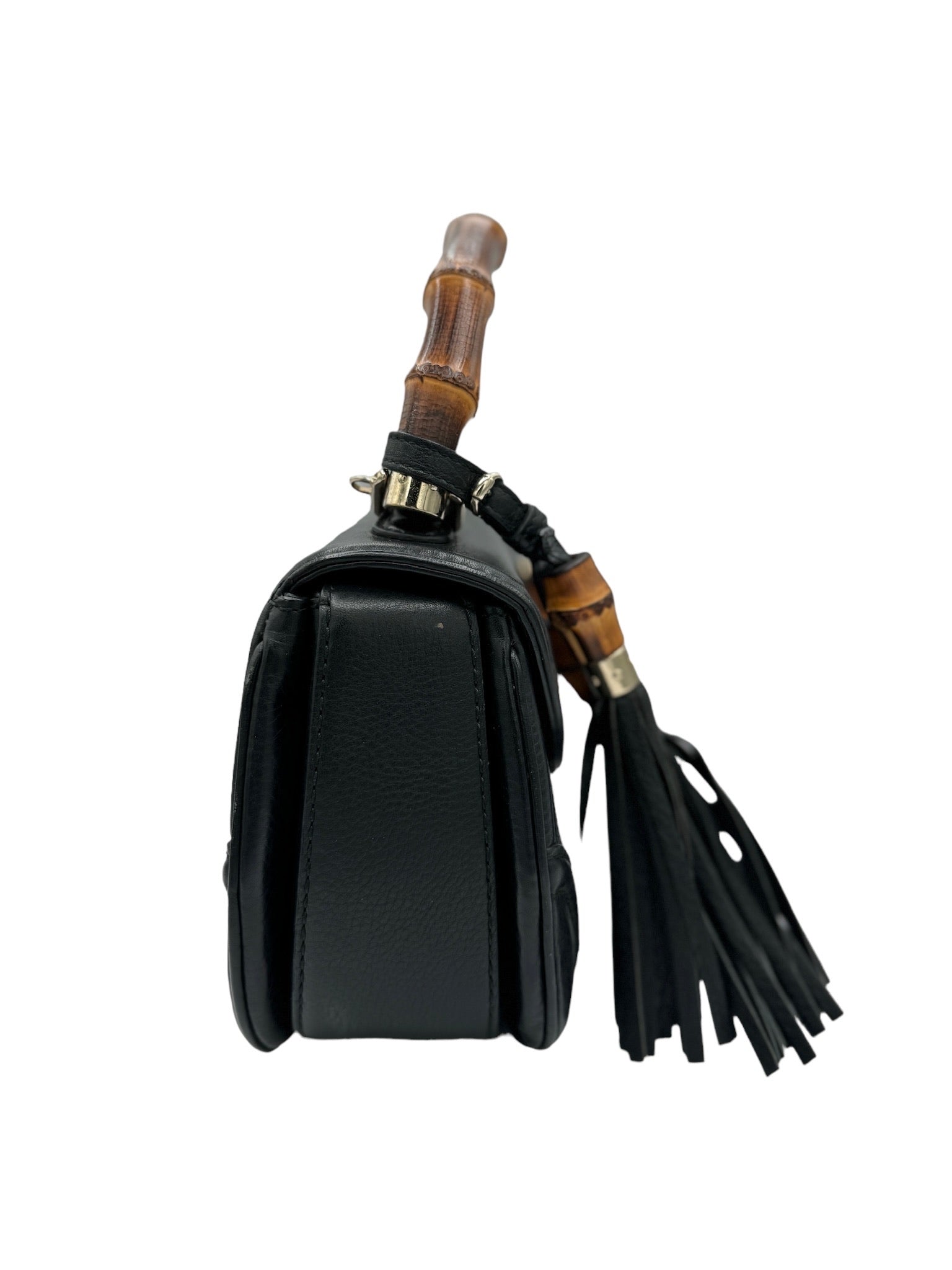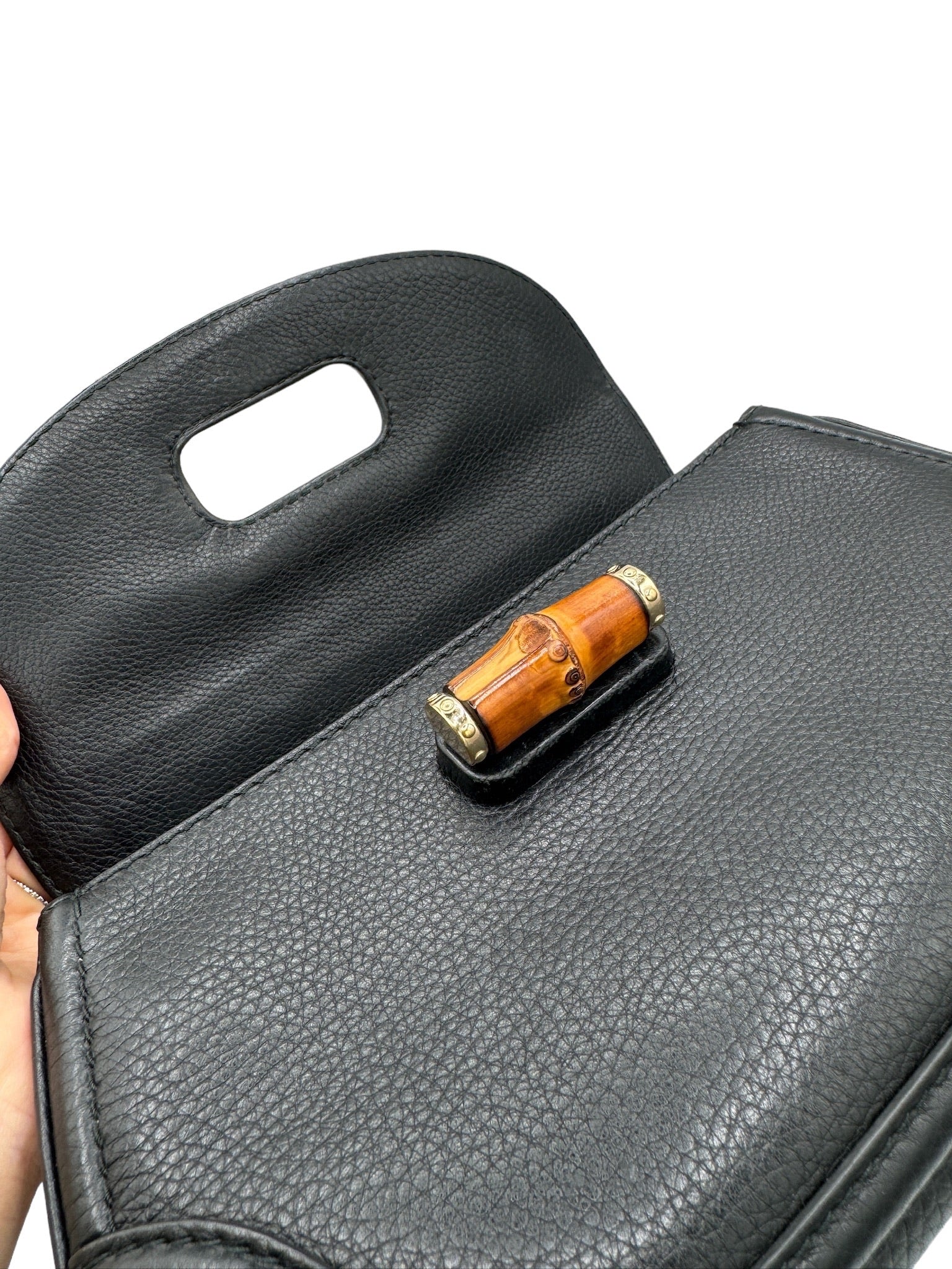 This pre-owned GUCCI New Bamboo Handbag in black leather is a small leather good that will elevate any outfit. Its top handle design is both classic and timeless.