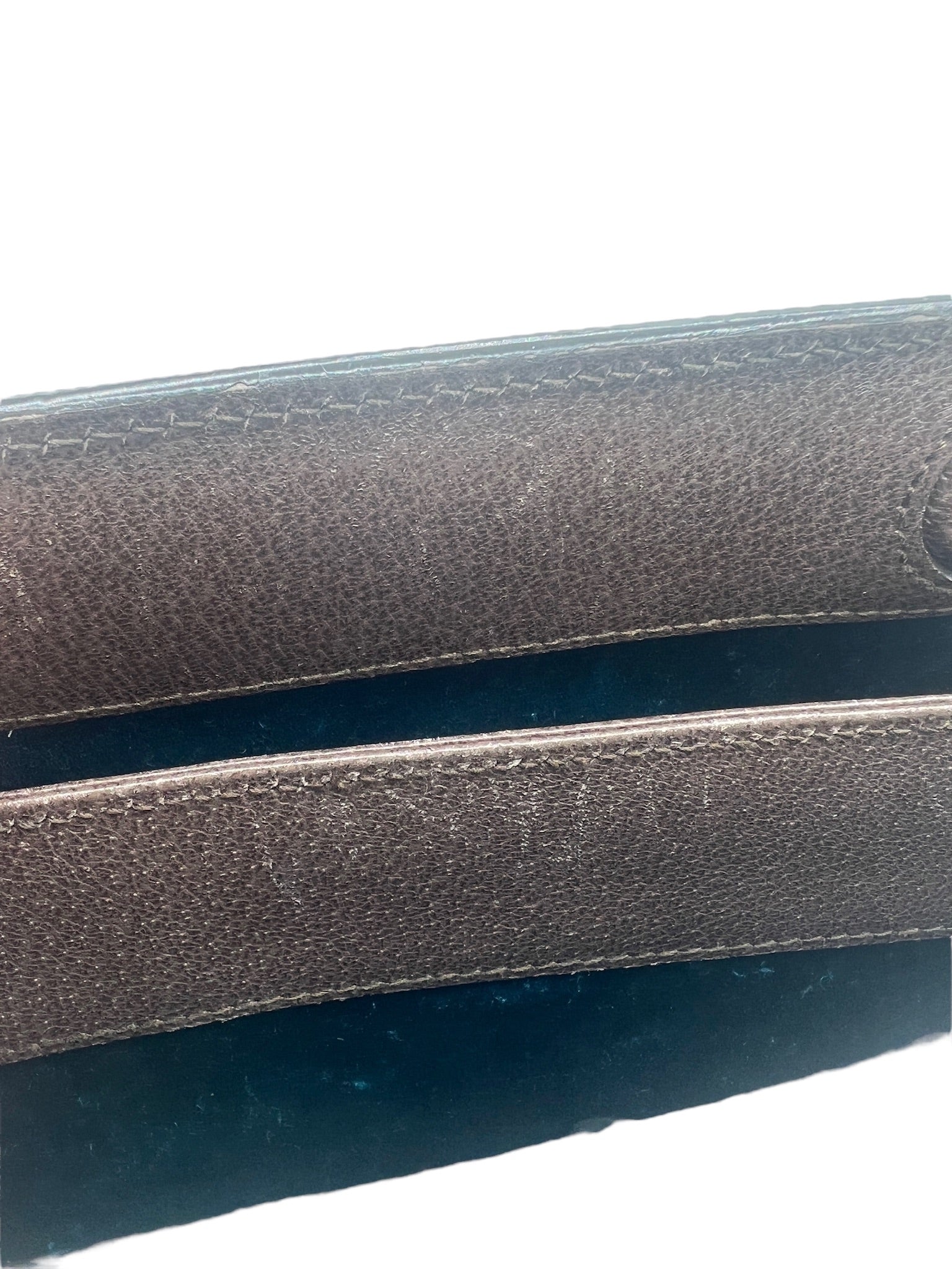 Overall: a few small scratches on the leather, some small dirt marks, slightly misshaped, metal coating peeling. Bottom: slight wear on corners. Main opening: slight wear on corners