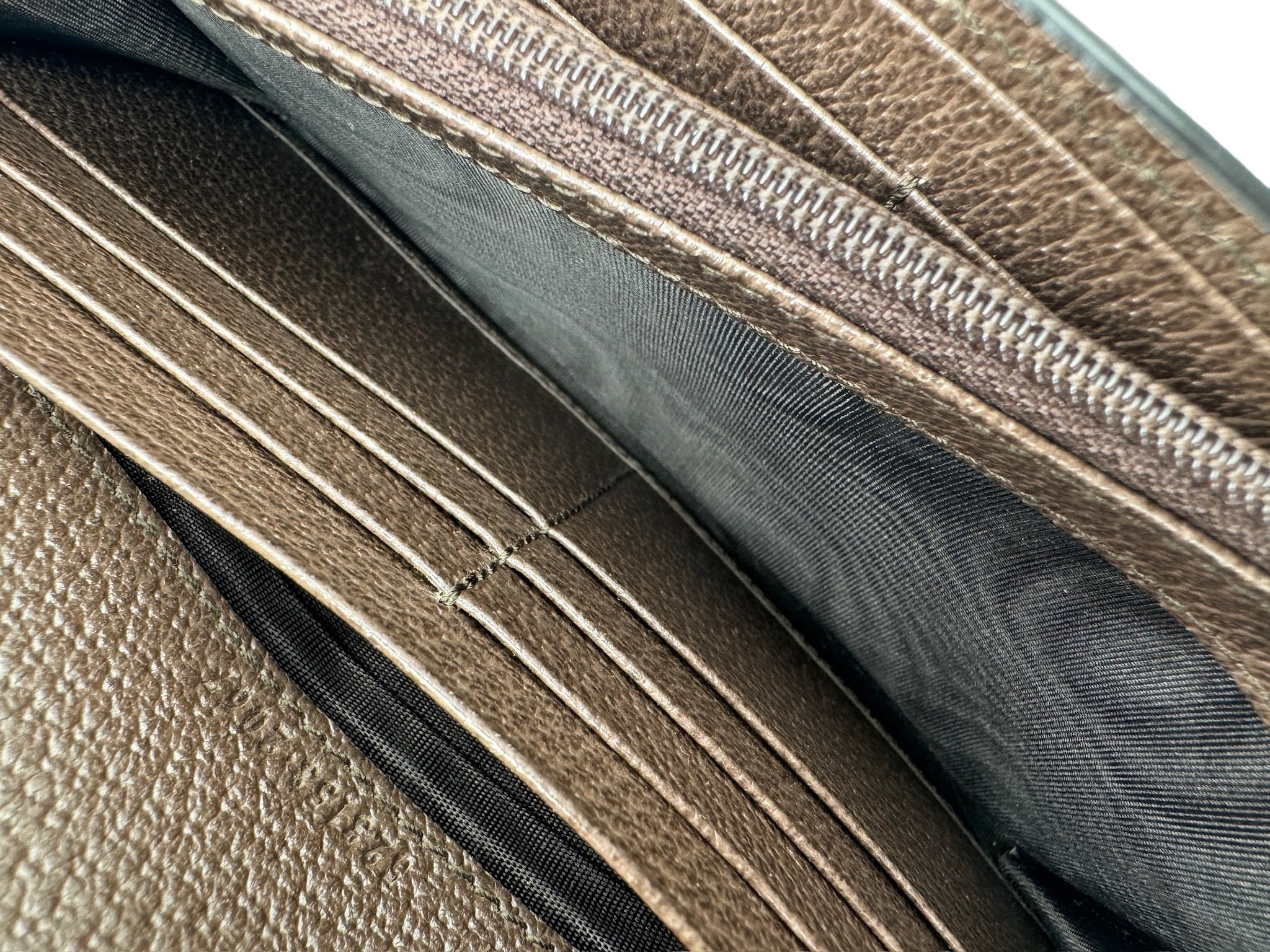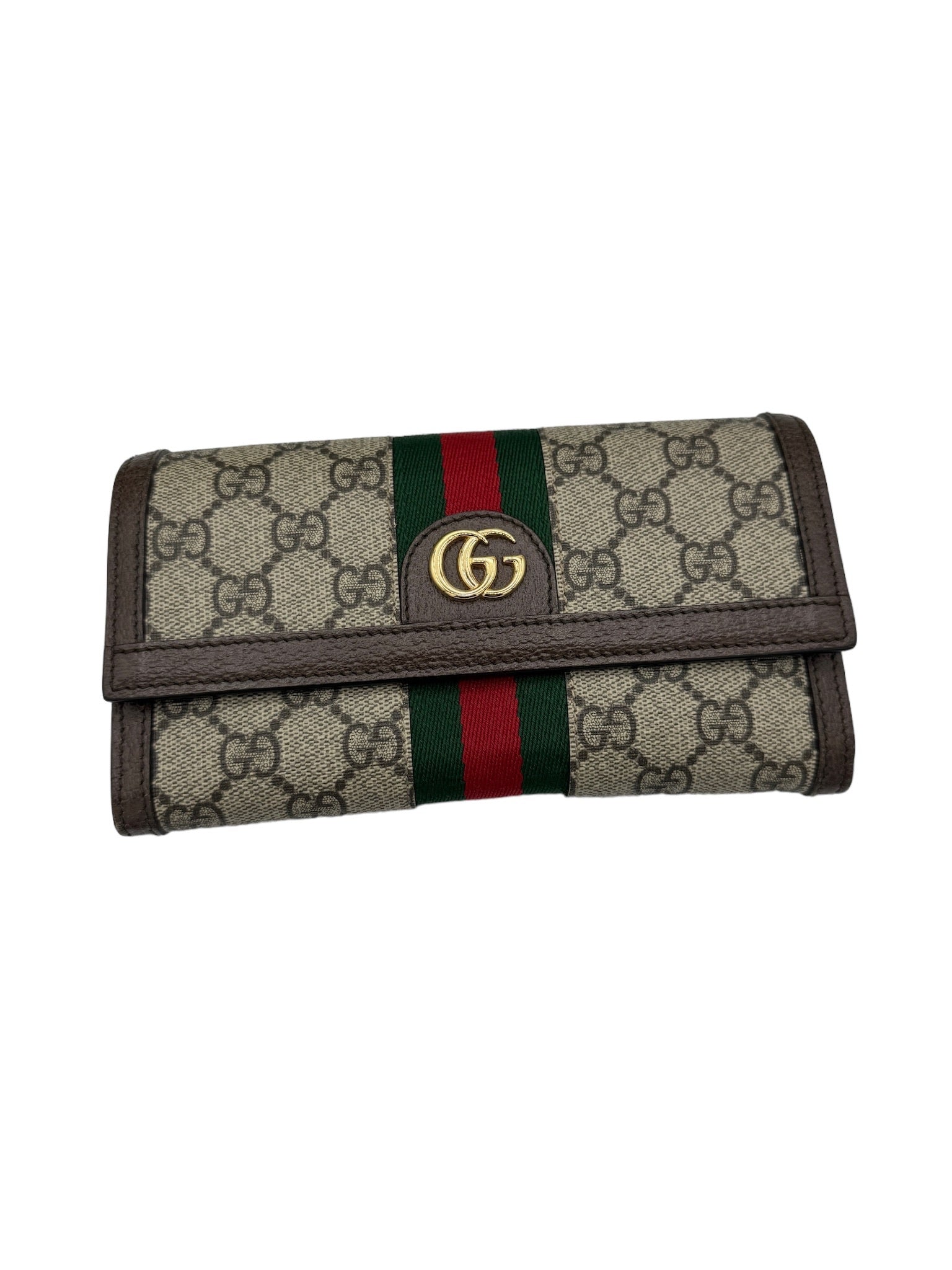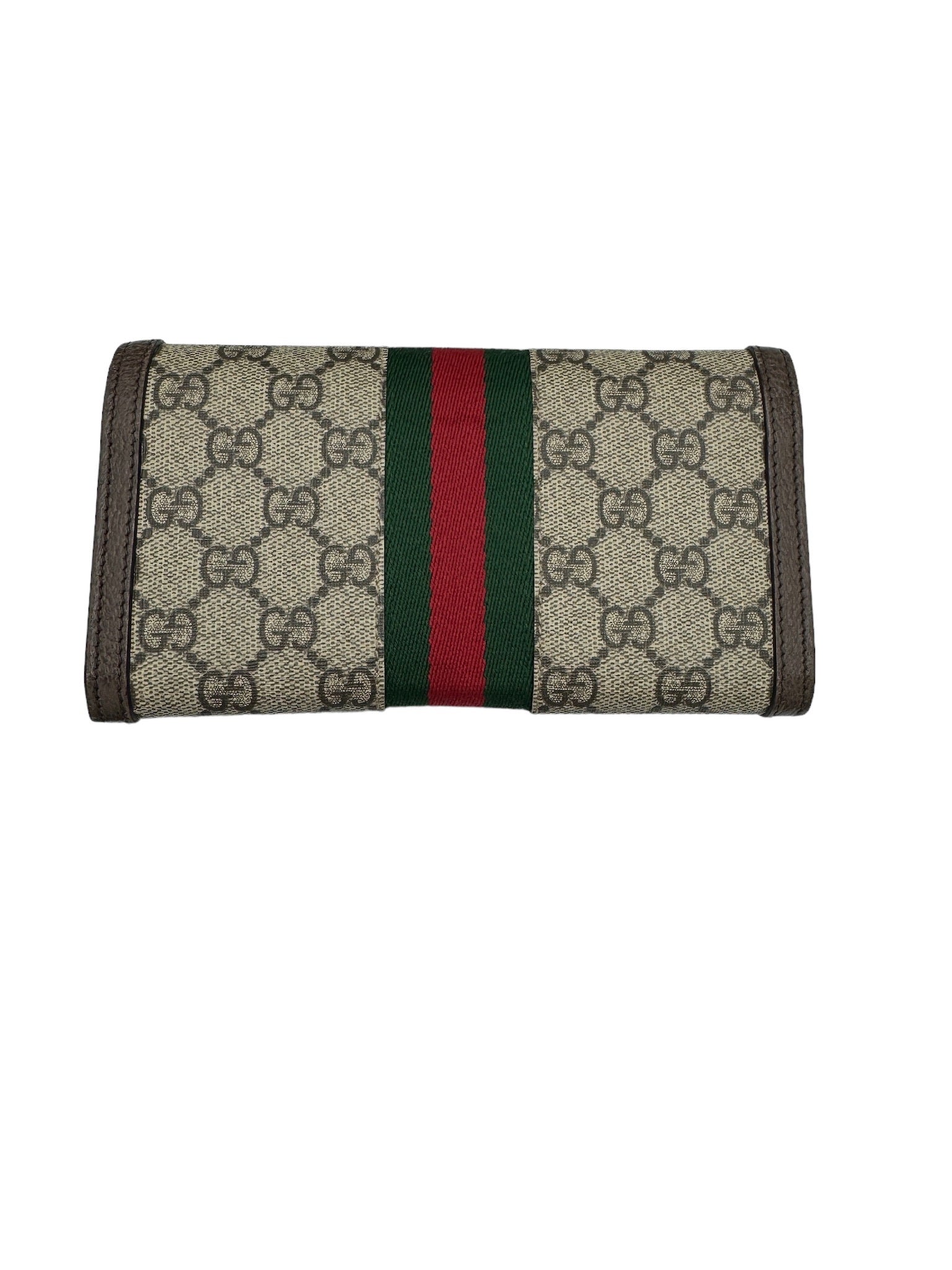 This Pre-Owned GUCCI Ophidia Long Wallet in Dark Beige Canvas is a Small Leather Goods item that has a classic and timeless appearance.