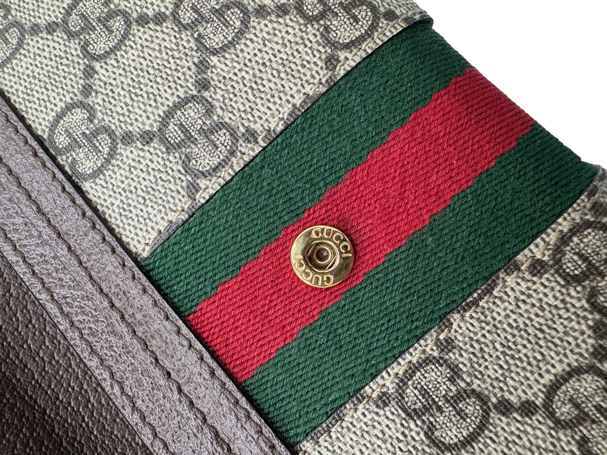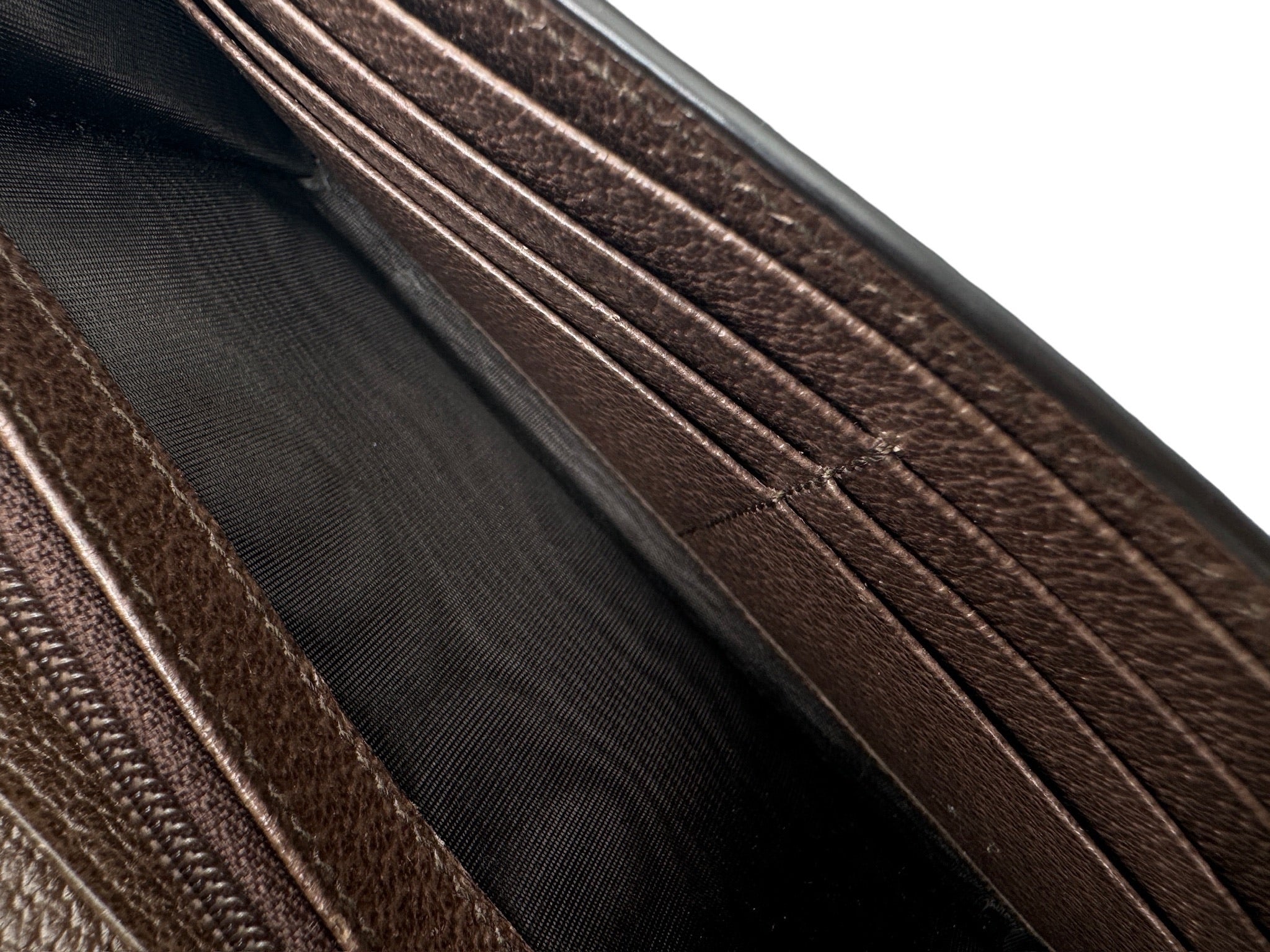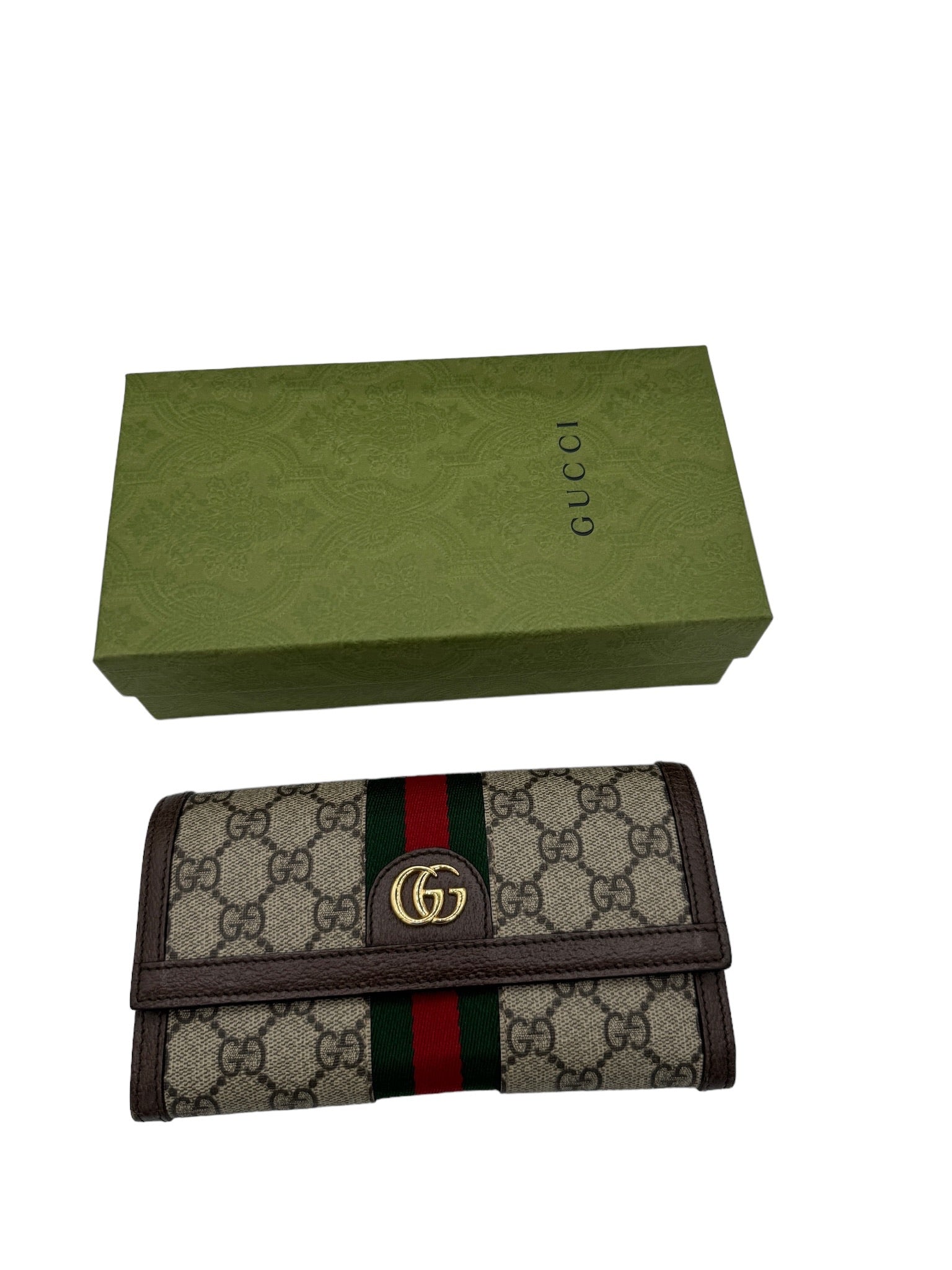 This Pre-Owned GUCCI Ophidia Long Wallet in Dark Beige Canvas is a Small Leather Goods item that has a classic and timeless appearance.