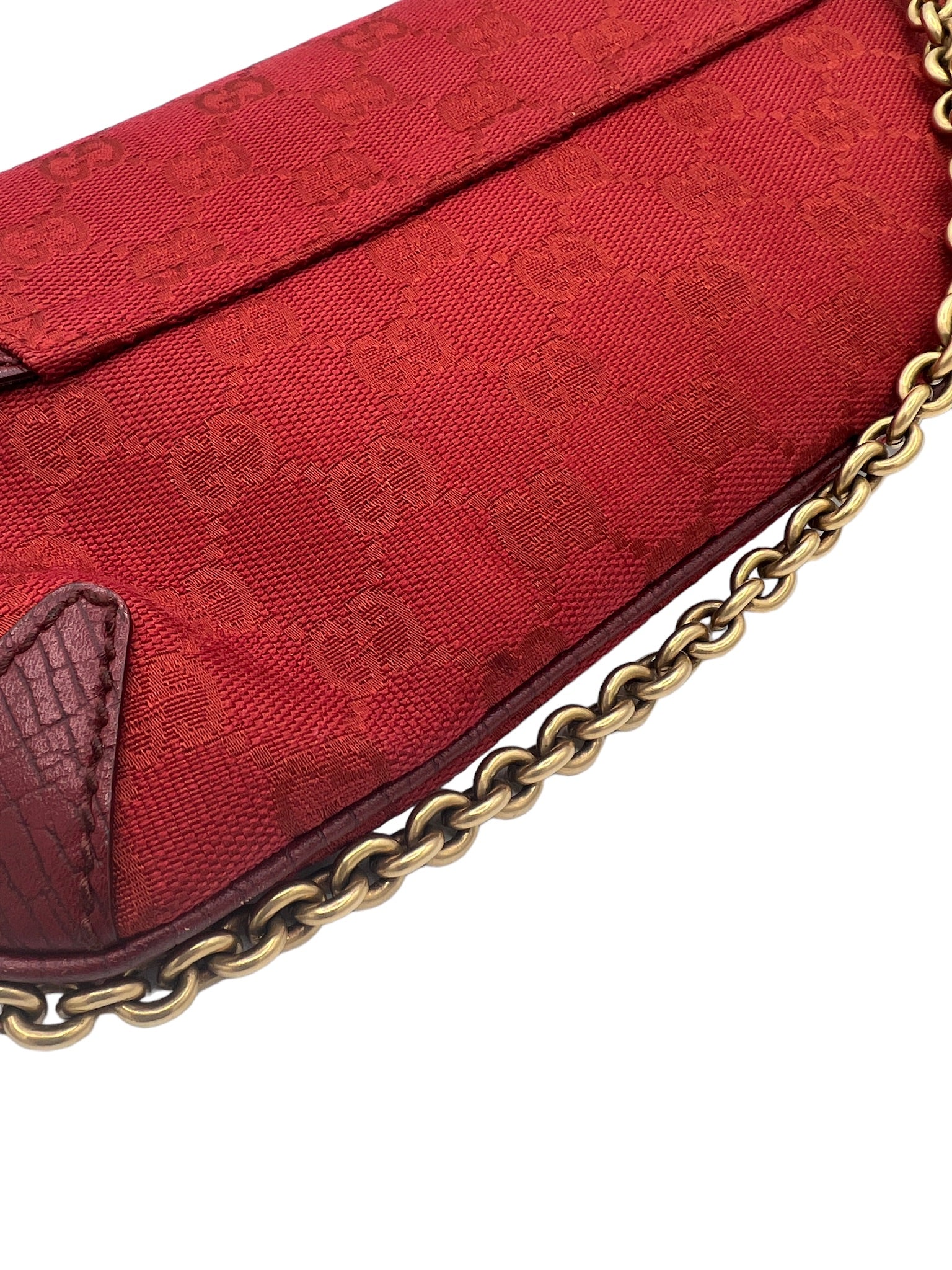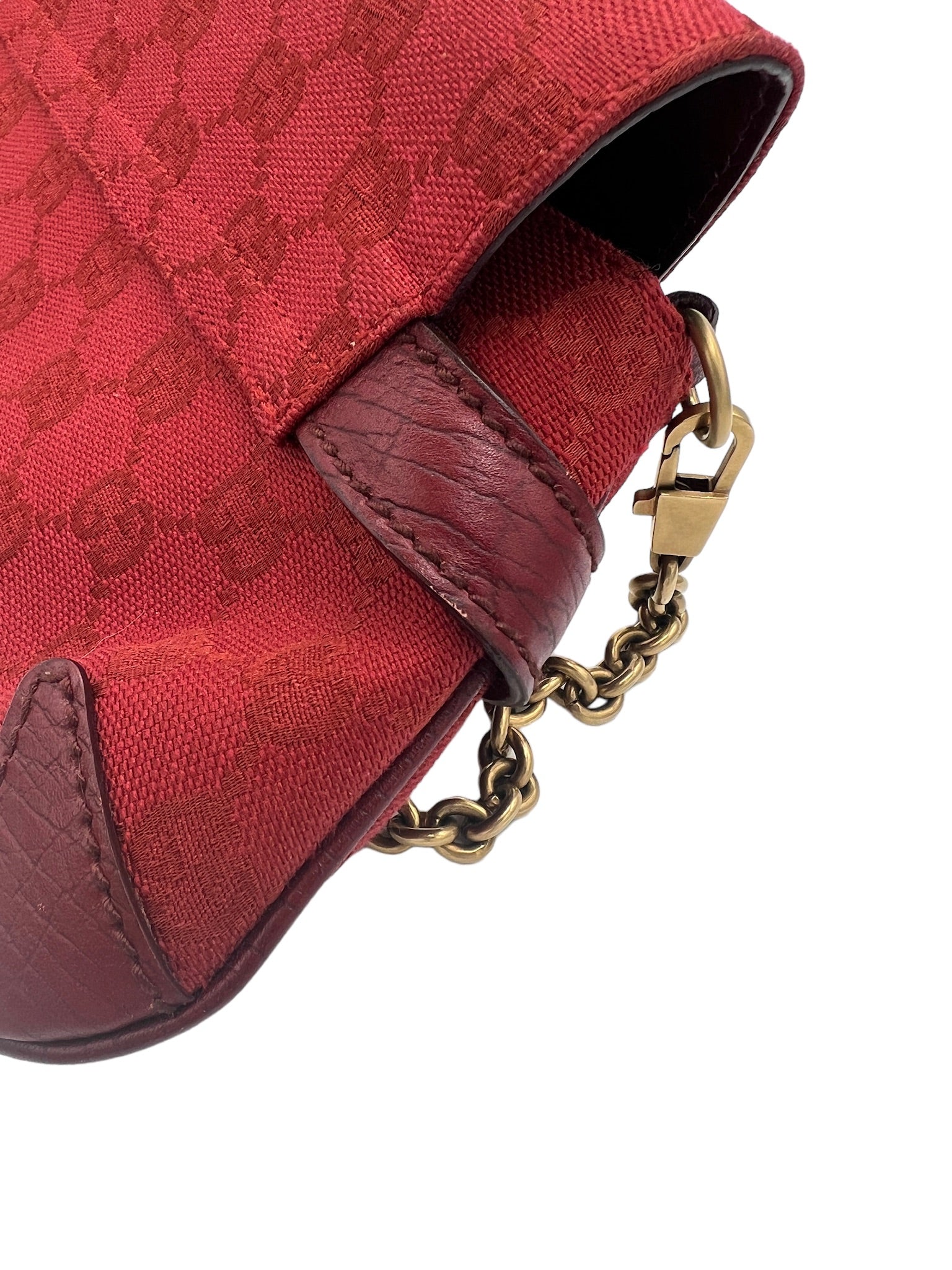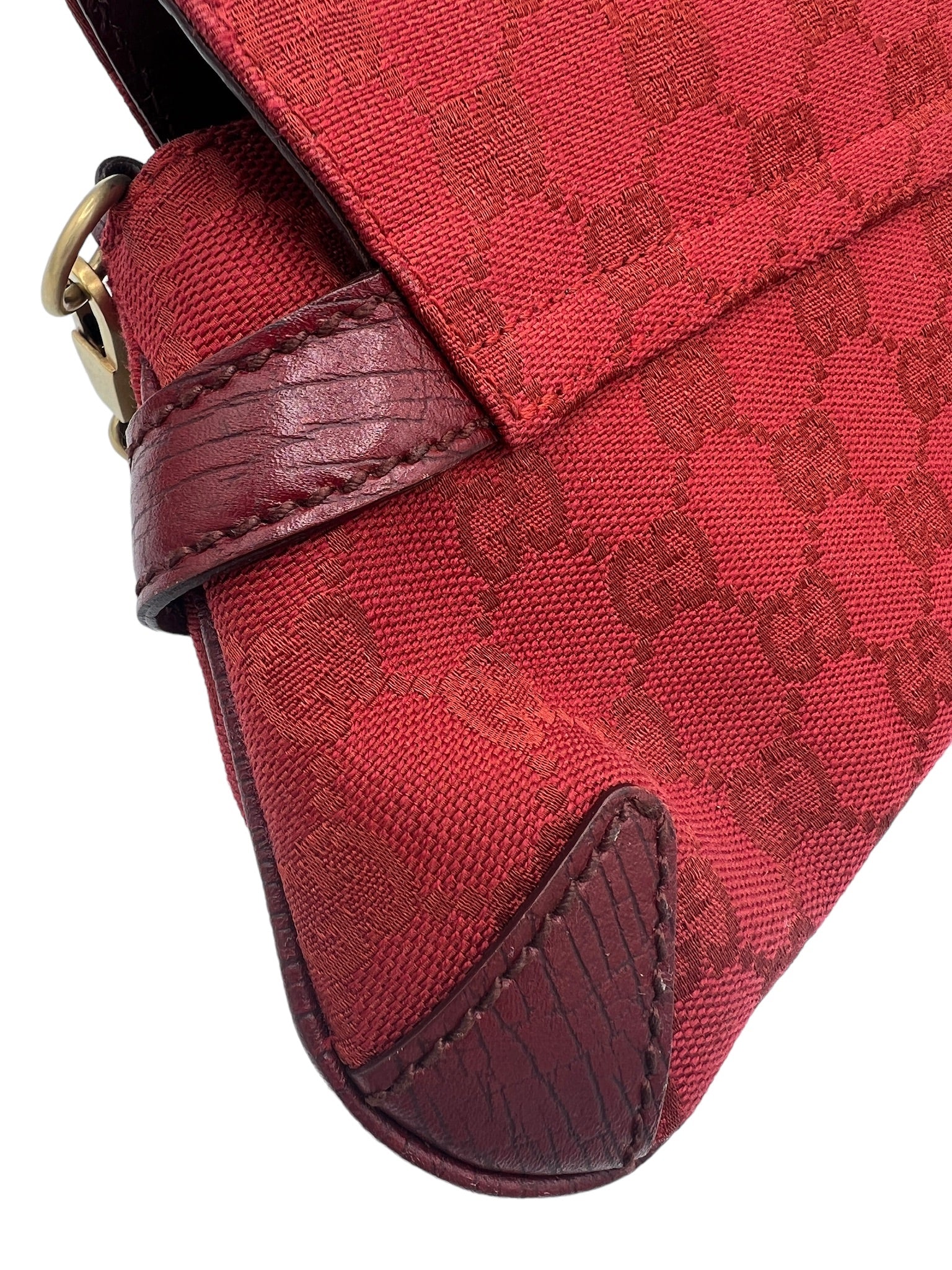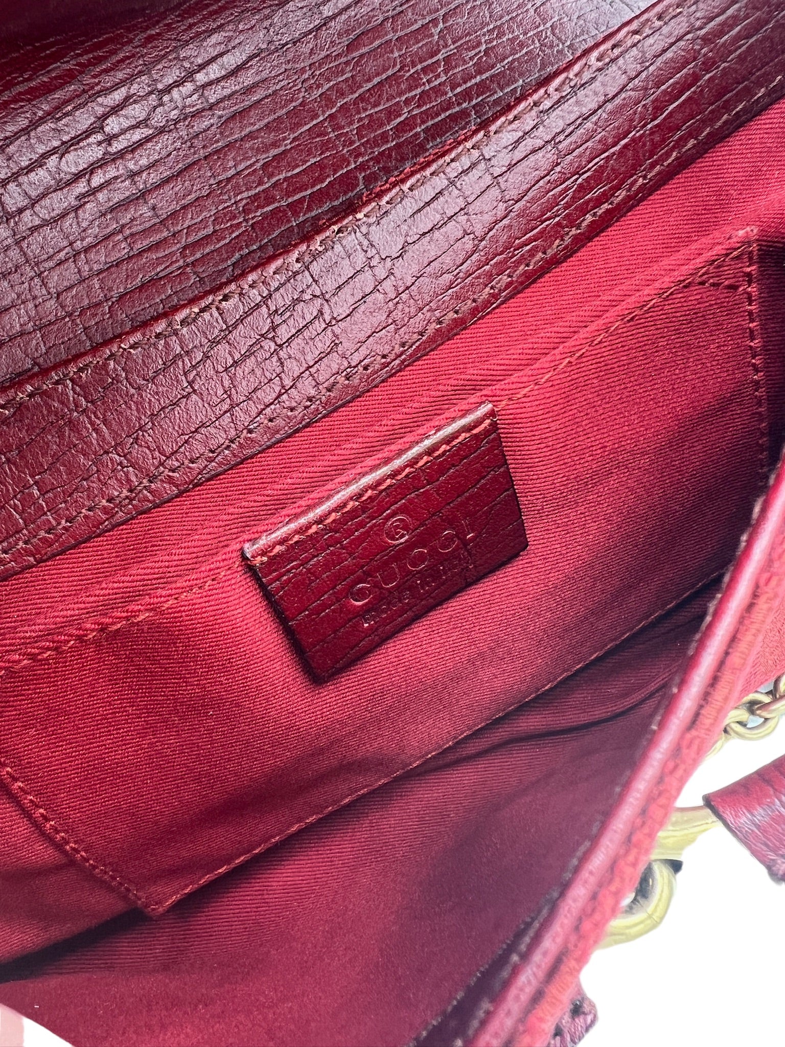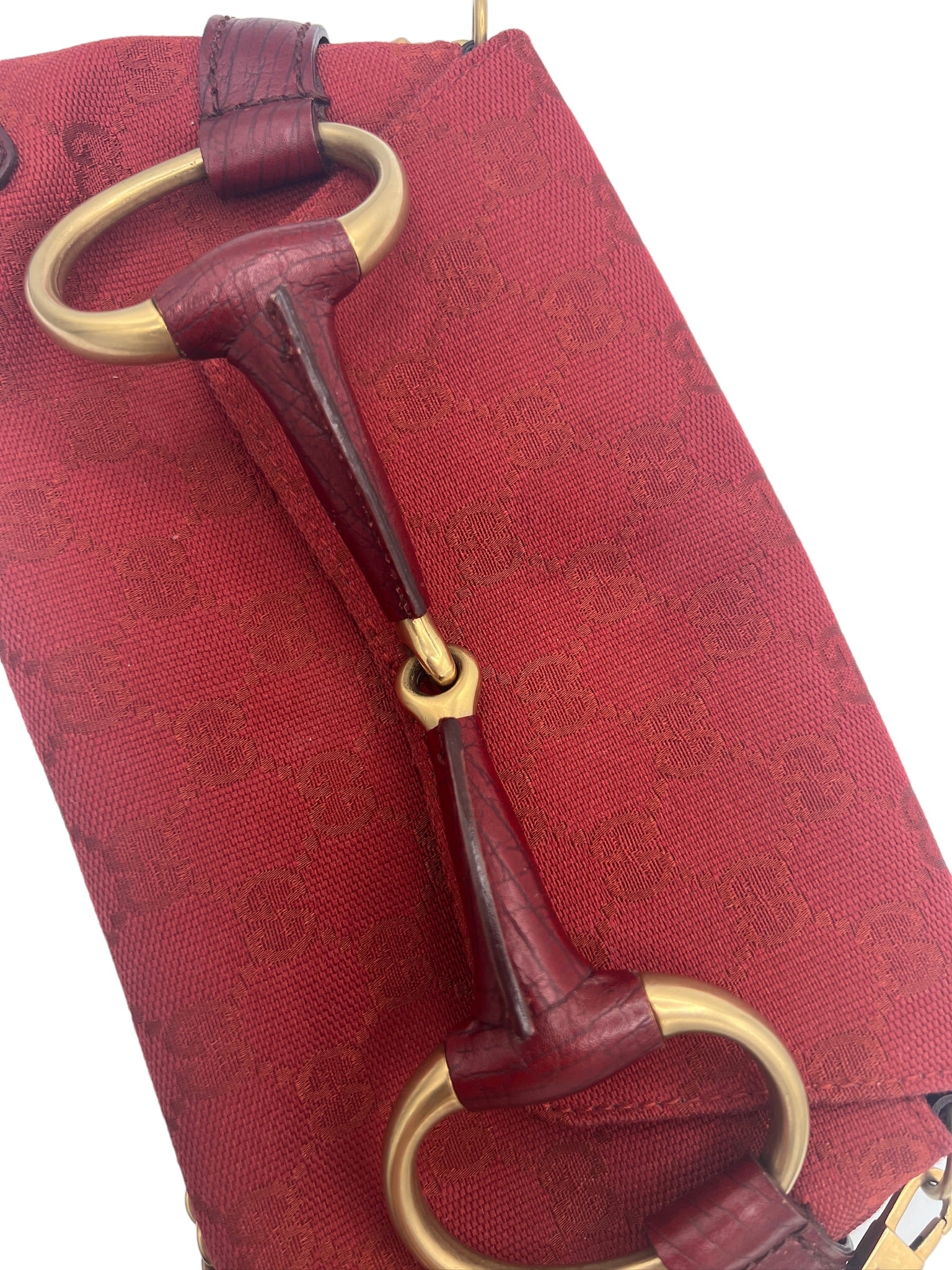 This Pre-owned GUCCI Wine Horsebit Pochette Bag is perfect for those who love to make a statement with their accessories. With its gorgeous red color and elegant top handle, this bag is sure to turn heads wherever you go.