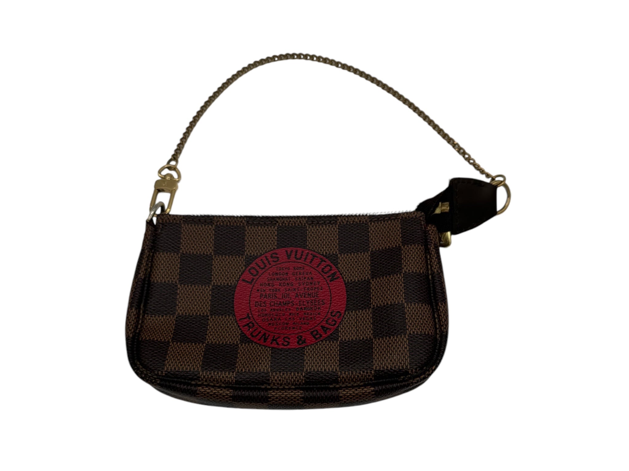 Experience luxury with the LOUIS VUITTON 2008 Damier Ebene Canvas Mini Pochette Accessoires Trunks & Bags. With its golden toned hardware and vibrant red lining, this compact bag exudes elegance and sophistication. The top zip fastening ensures your belongings are secure while you turn heads with this iconic accessory.