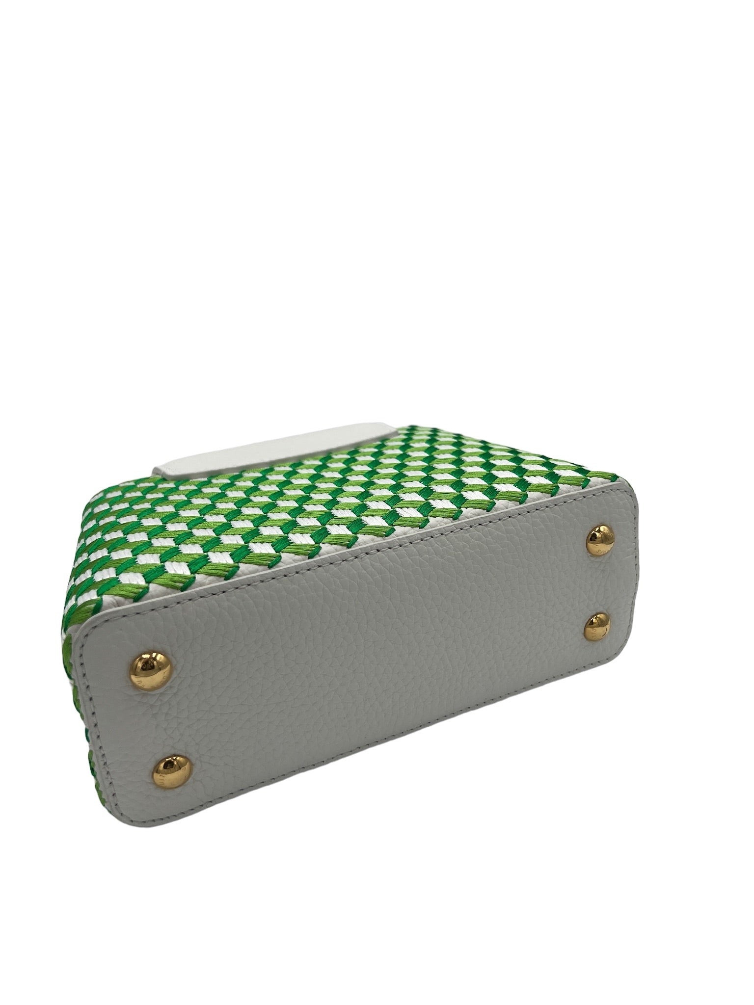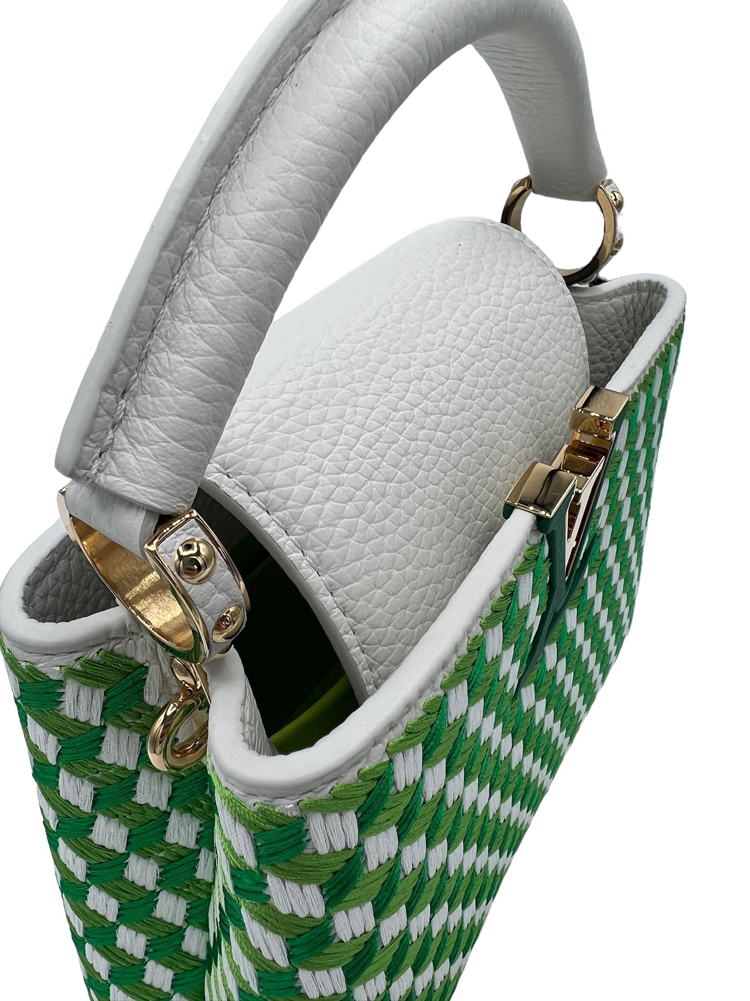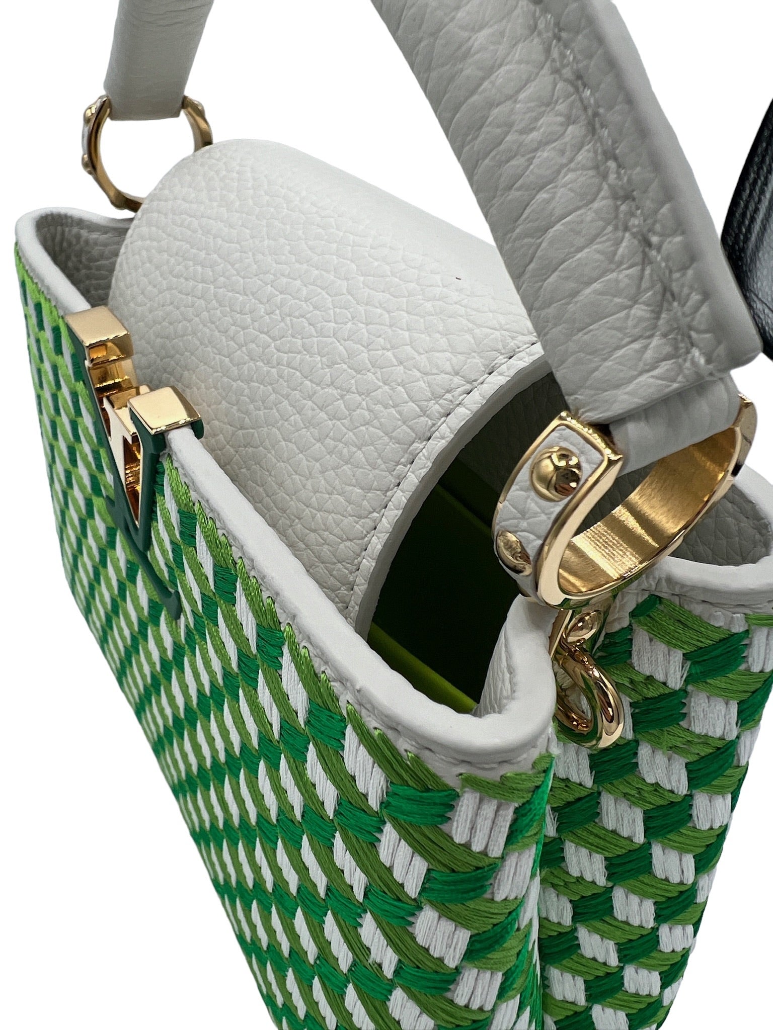 This pre-owned Louis Vuitton Blanc Vert Capucines Mini Capucines Handbag is the perfect addition to any fashion-forward wardrobe. Crafted from high-quality Taurillon leather and textile, this top handle bag is both stylish and durable.