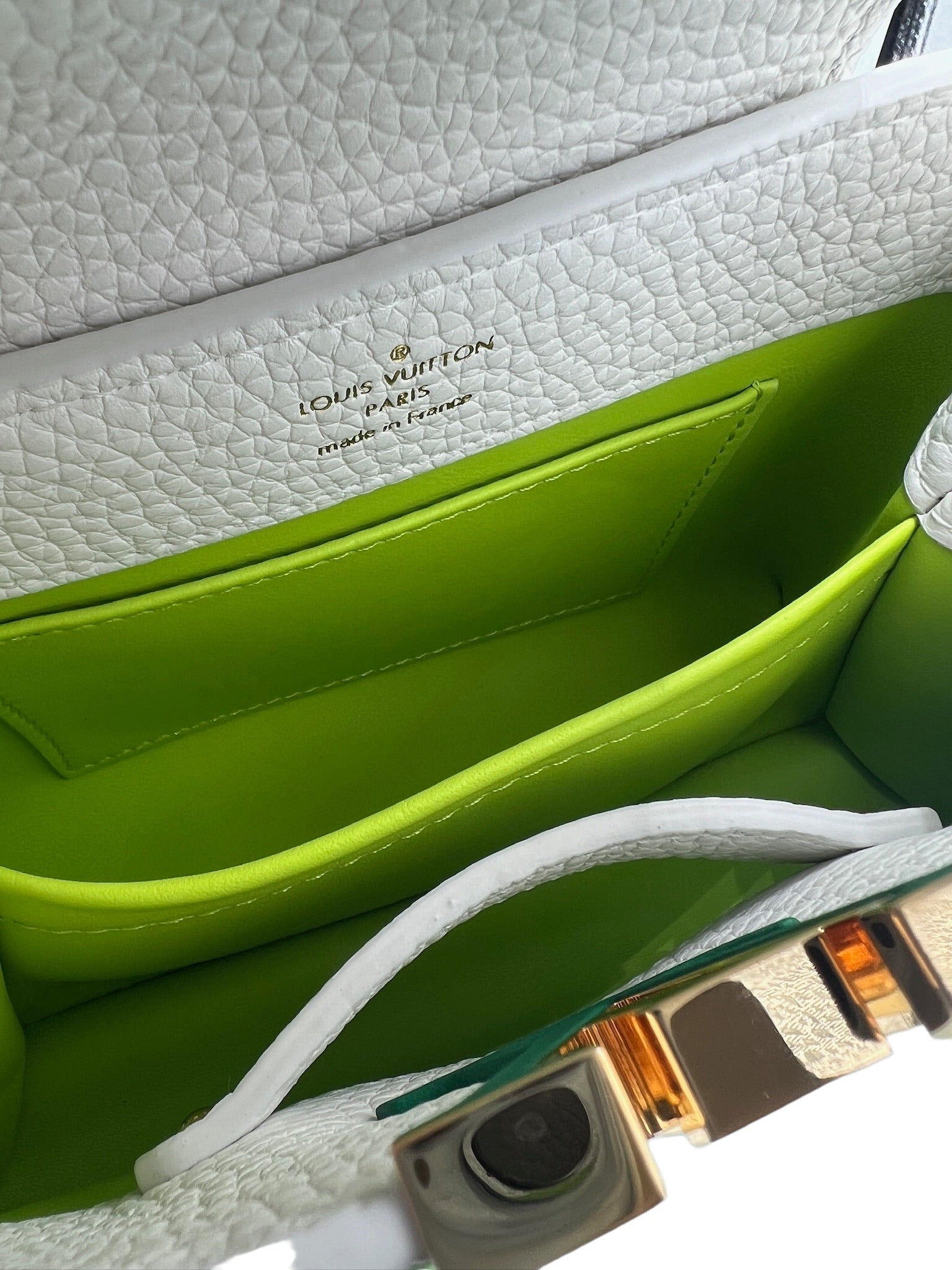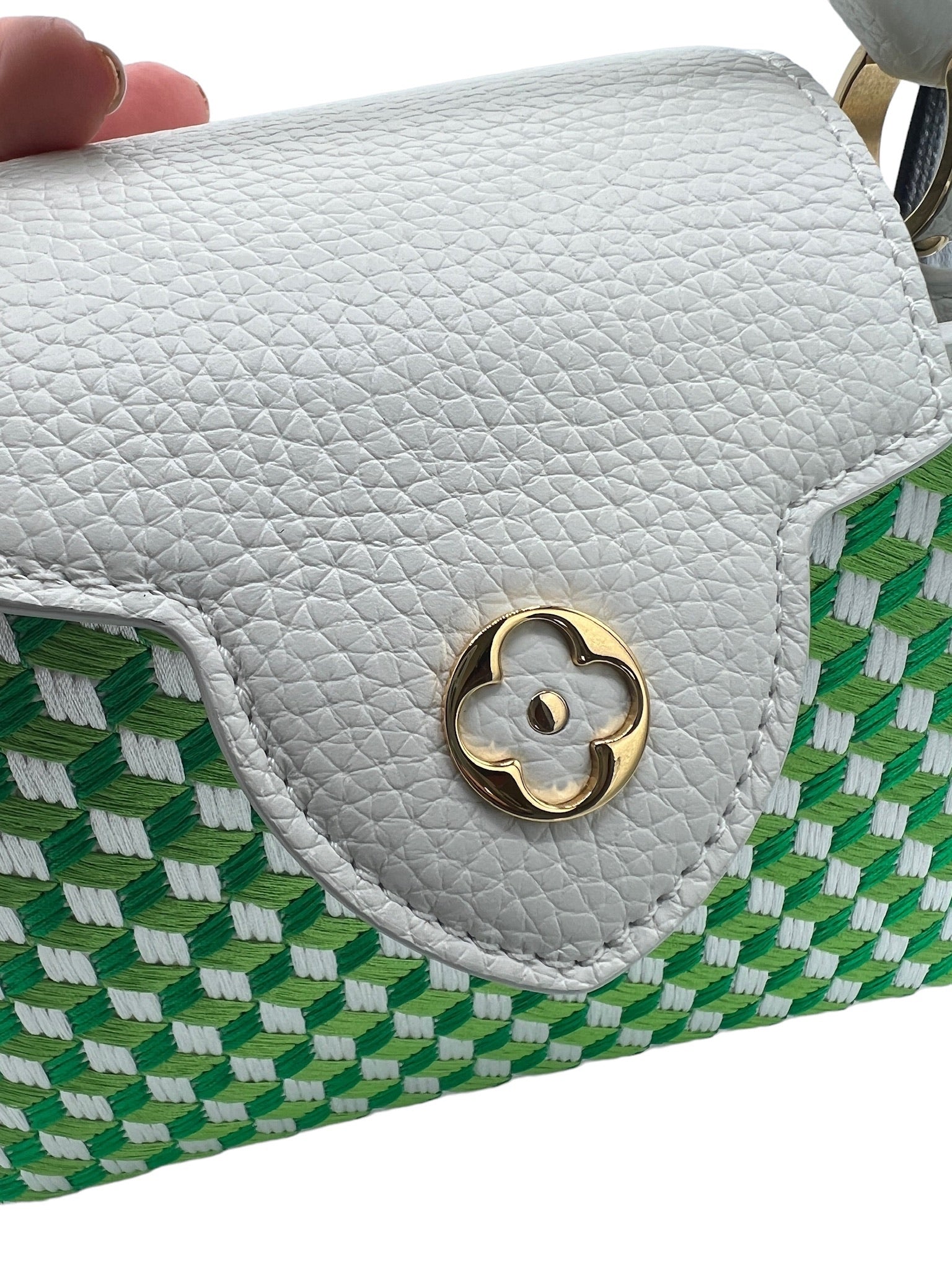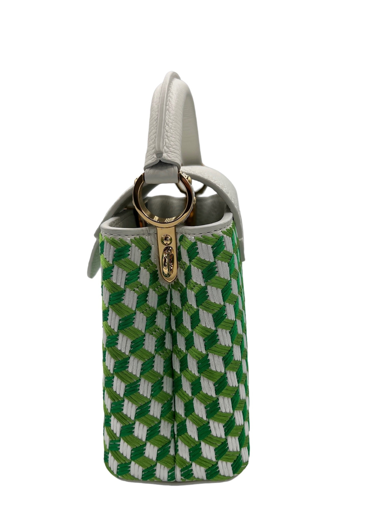 This pre-owned Louis Vuitton Blanc Vert Capucines Mini Capucines Handbag is the perfect addition to any fashion-forward wardrobe. Crafted from high-quality Taurillon leather and textile, this top handle bag is both stylish and durable.