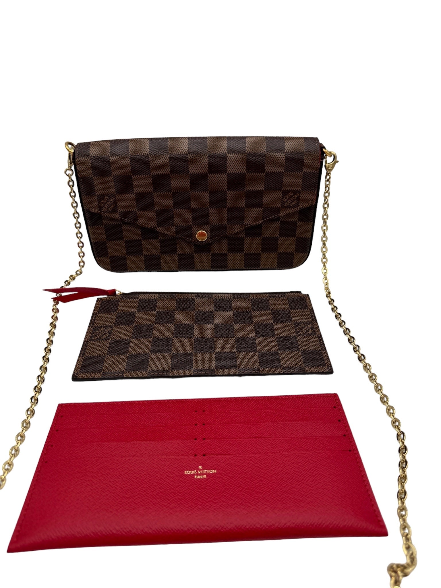 Elevate your style with this LOUIS VUITTON Damier Ebene Canvas Felicie Pochette Crossbody Bag. This pre-owned crossbody bag comes in excellent condition, authenticated by entrupy.