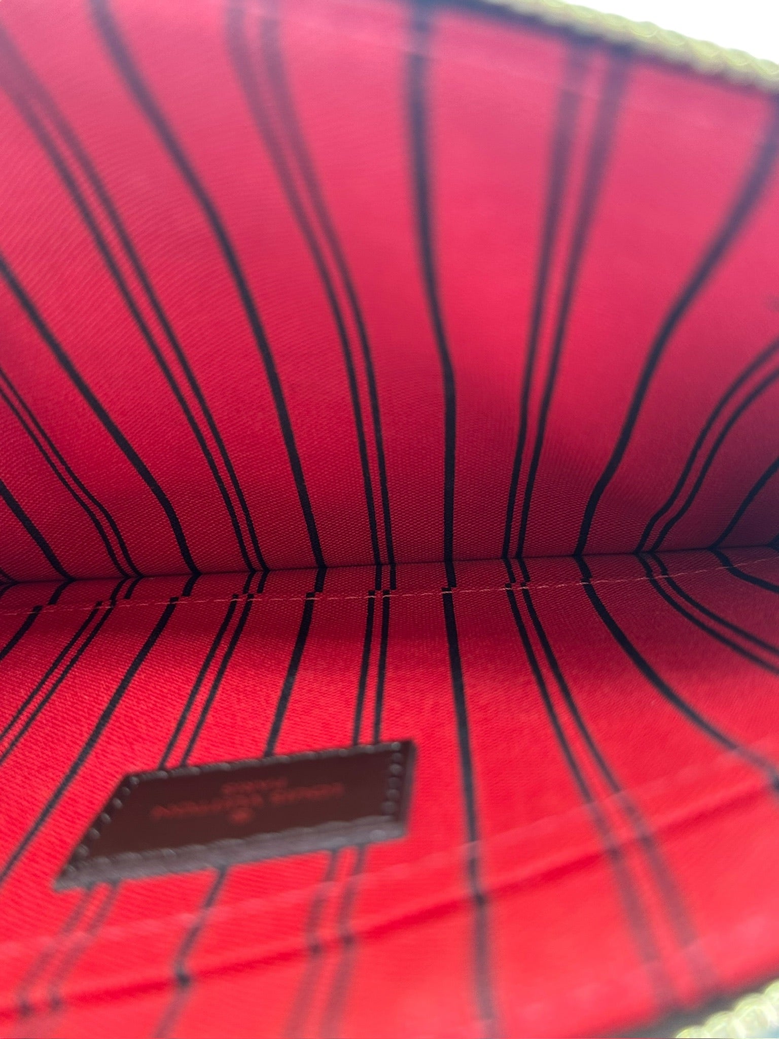 Indulge in luxury with the LOUIS VUITTON Neverfull Pouch. Featuring golden hardware and a bold red lining, this beautiful pouch is both stylish and practical. Keep your essentials organized and easily accessible, while adding a touch of elegance to any outfit.
