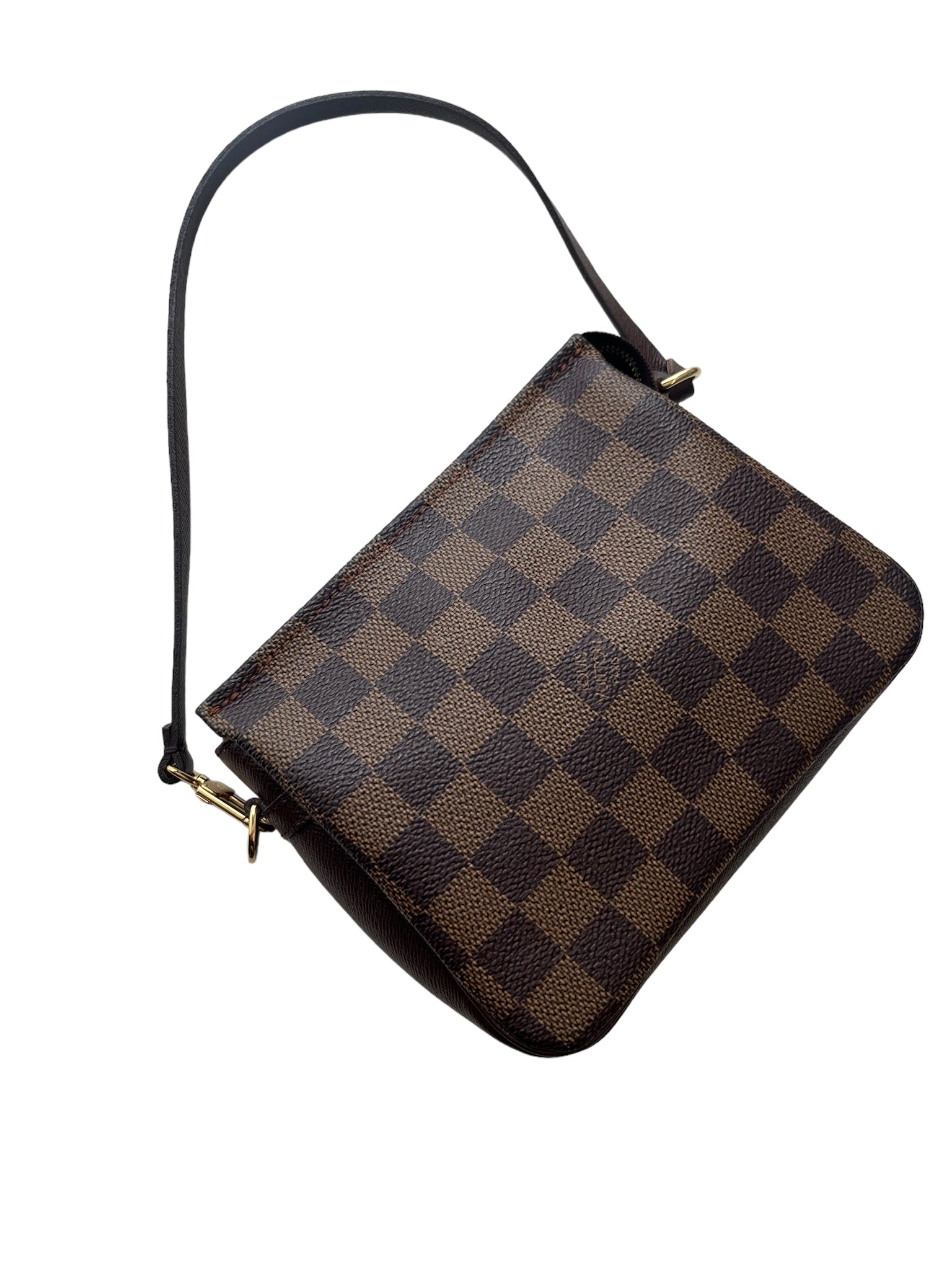 Elevate your style with the LOUIS VUITTON Pochette. Featuring luxurious golden toned hardware, this Damier Ebene Canvas Trousse Pochette is both elegant and functional. Perfect for organizing your essentials on the go, it is the perfect accessory for the modern and sophisticated individual. Add a touch of luxury to your daily routine!