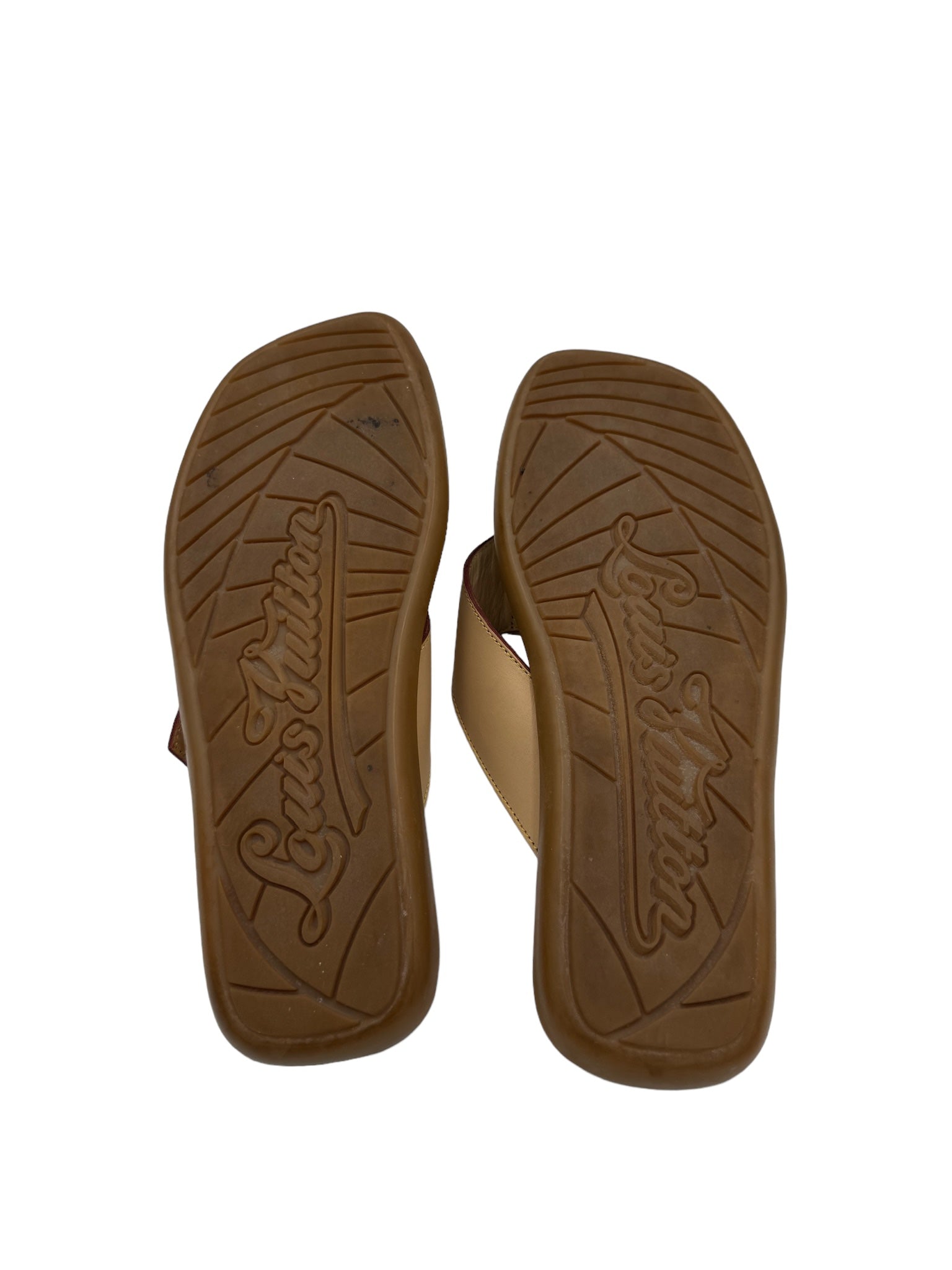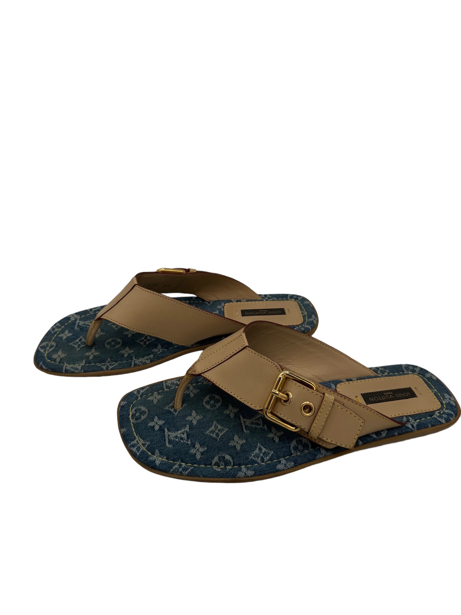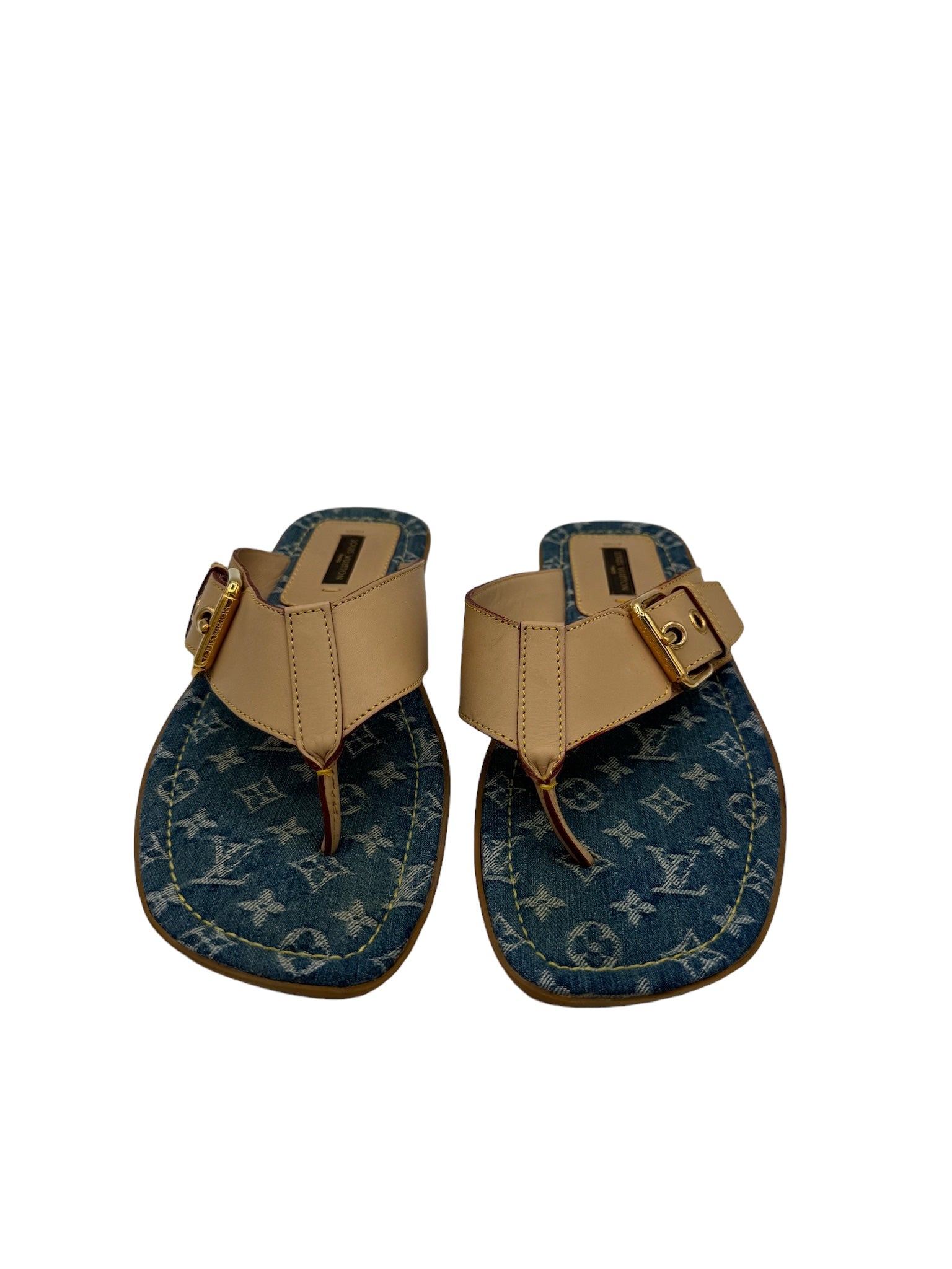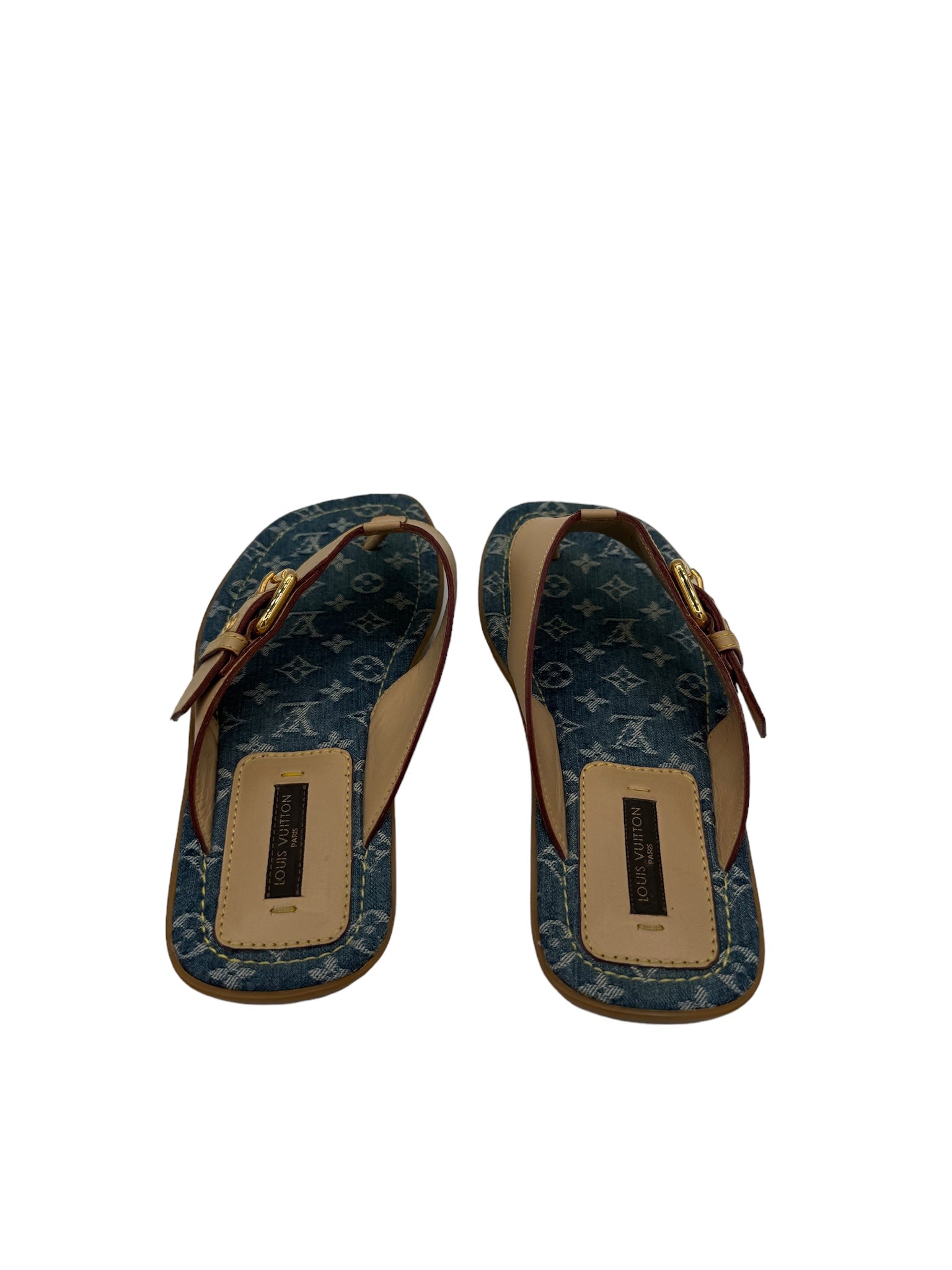Elevate your summer style with LOUIS VUITTON's Denim Monogram Sandals! Featuring a comfortable 0.39 inch heel and a stylish denim monogram print, these sandals will add a touch of luxury to any outfit. Available in size 36 (Approx US#5.5), with a 9.25 inch insole for the perfect fit.