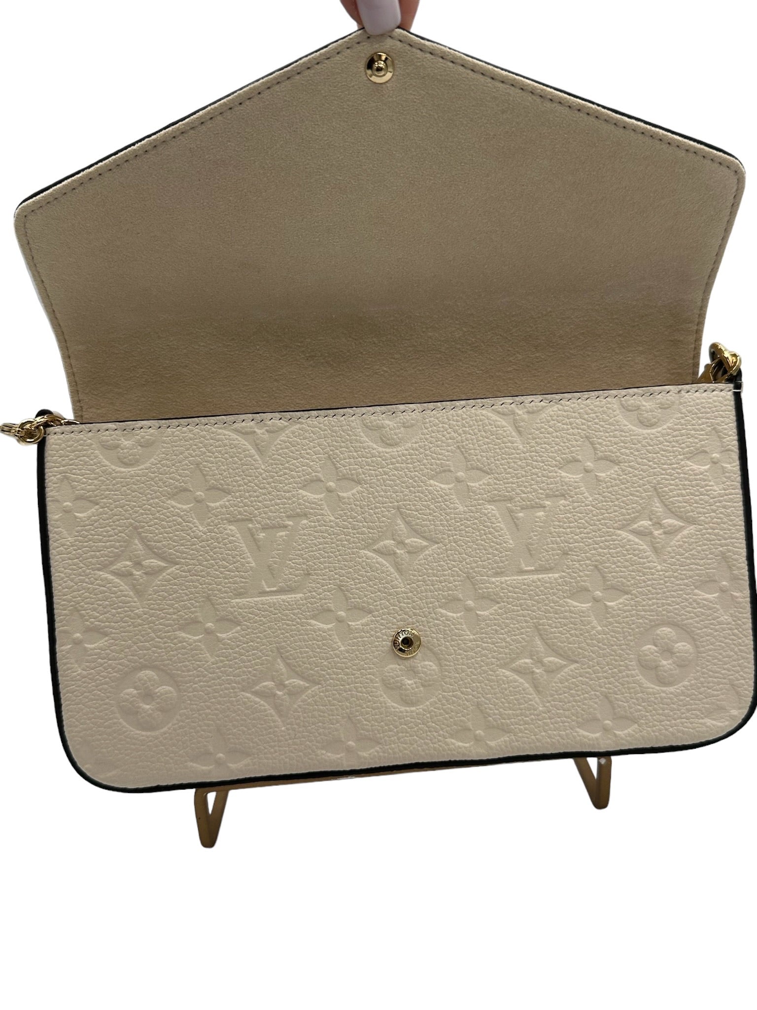 This pre-owned LOUIS VUITTON Felicie Crossbody Bag is a luxurious accessory in very good condition, showing only small signs of wear. Crafted from elegant cream monogram empreinte leather, this bag exudes sophistication and style.