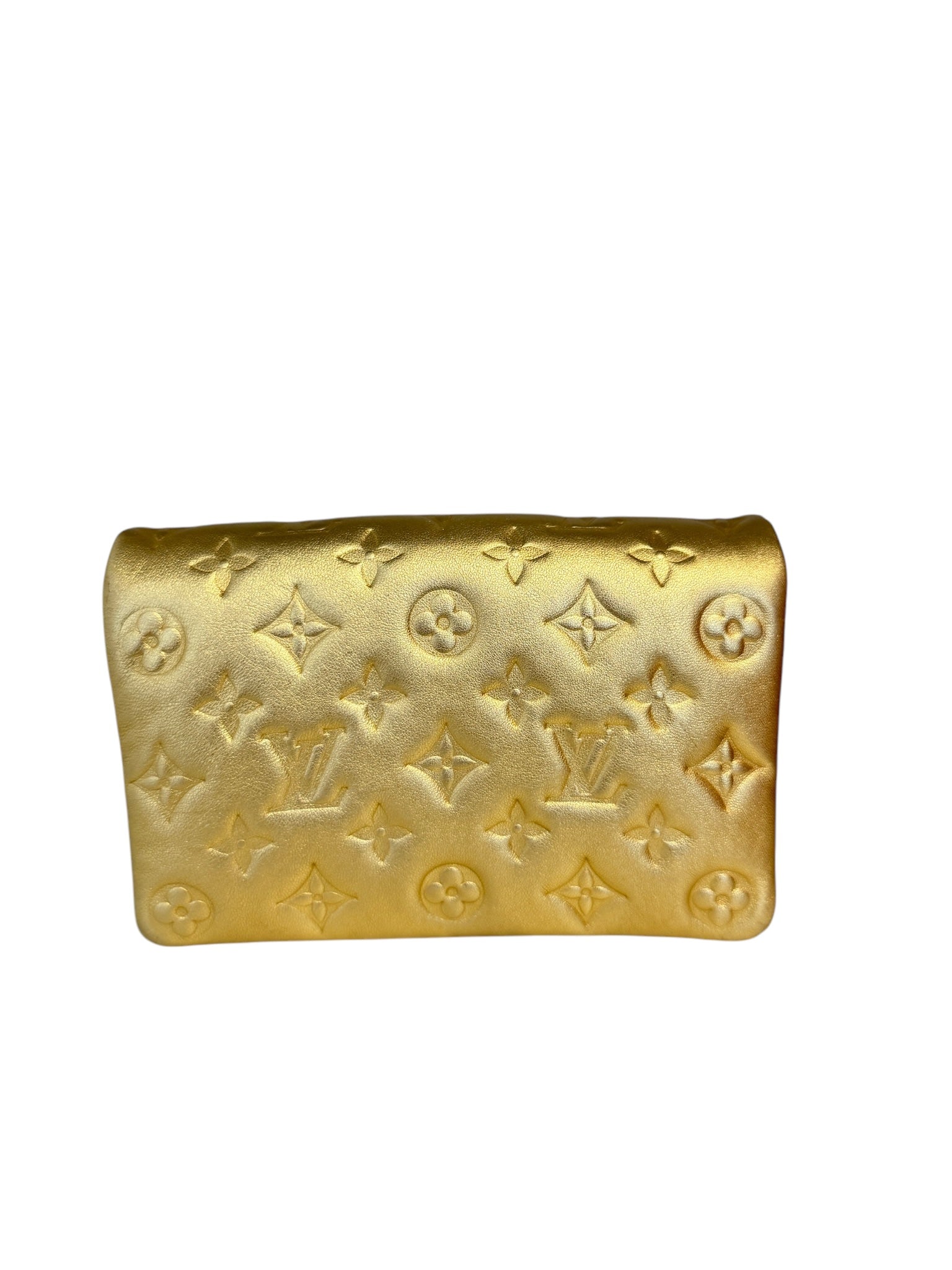 Elevate your style with the luxurious LOUIS VUITTON Pochette Coussin! Made from gold monogram embossed lambskin, this statement piece is complemented by stunning golden toned hardware. Perfect for any occasion, its timeless design and quality craftsmanship will turn heads and make you stand out from the crowd.