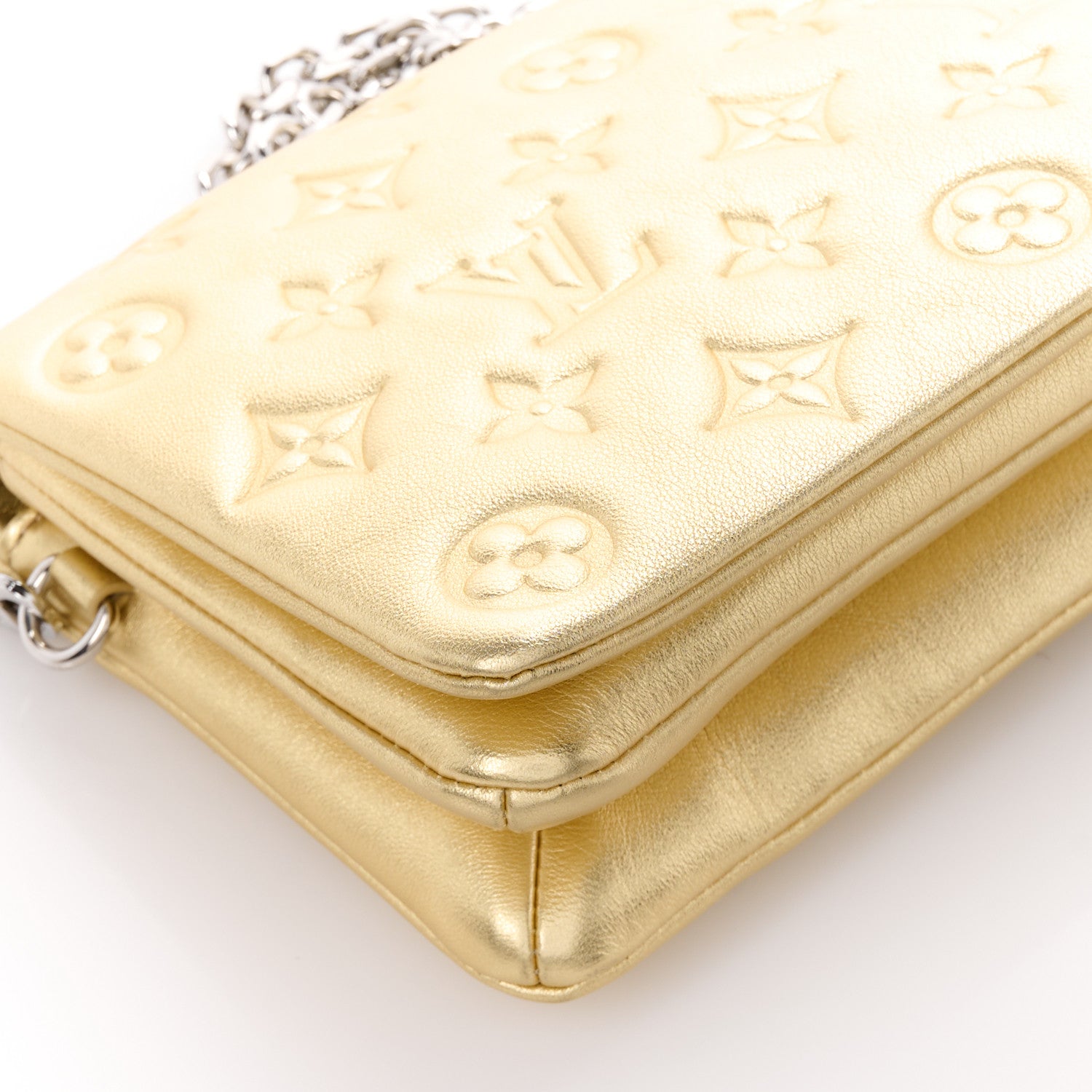Elevate your look with the luxurious LOUIS VUITTON Gold Monogram Embossed Lambskin Pochette Coussin. In like new condition, this bag exudes sophistication and style. Comes with a dust bag for protection and storage. Elevate your wardrobe with this elegant, high-end piece.