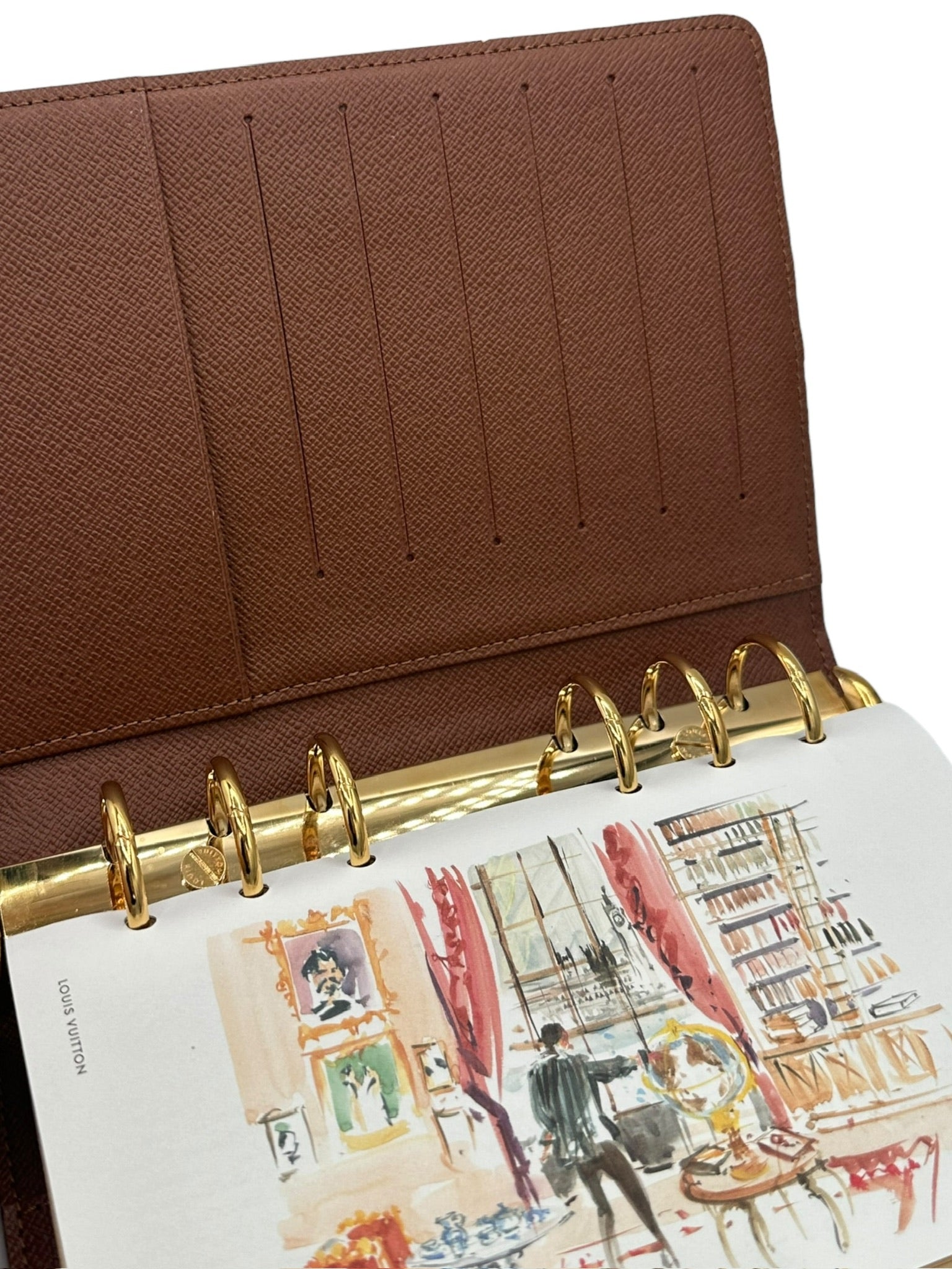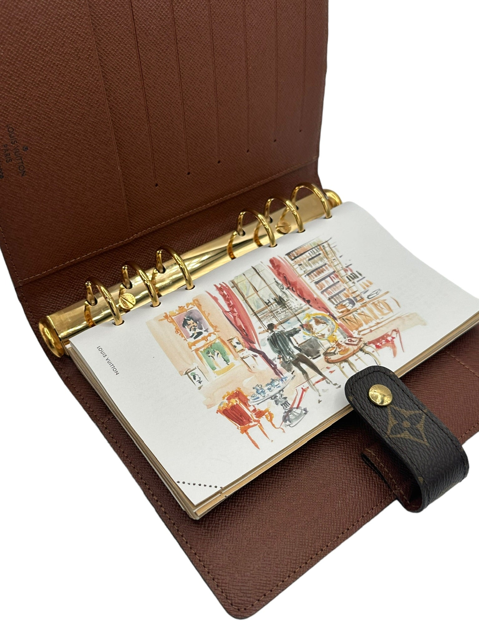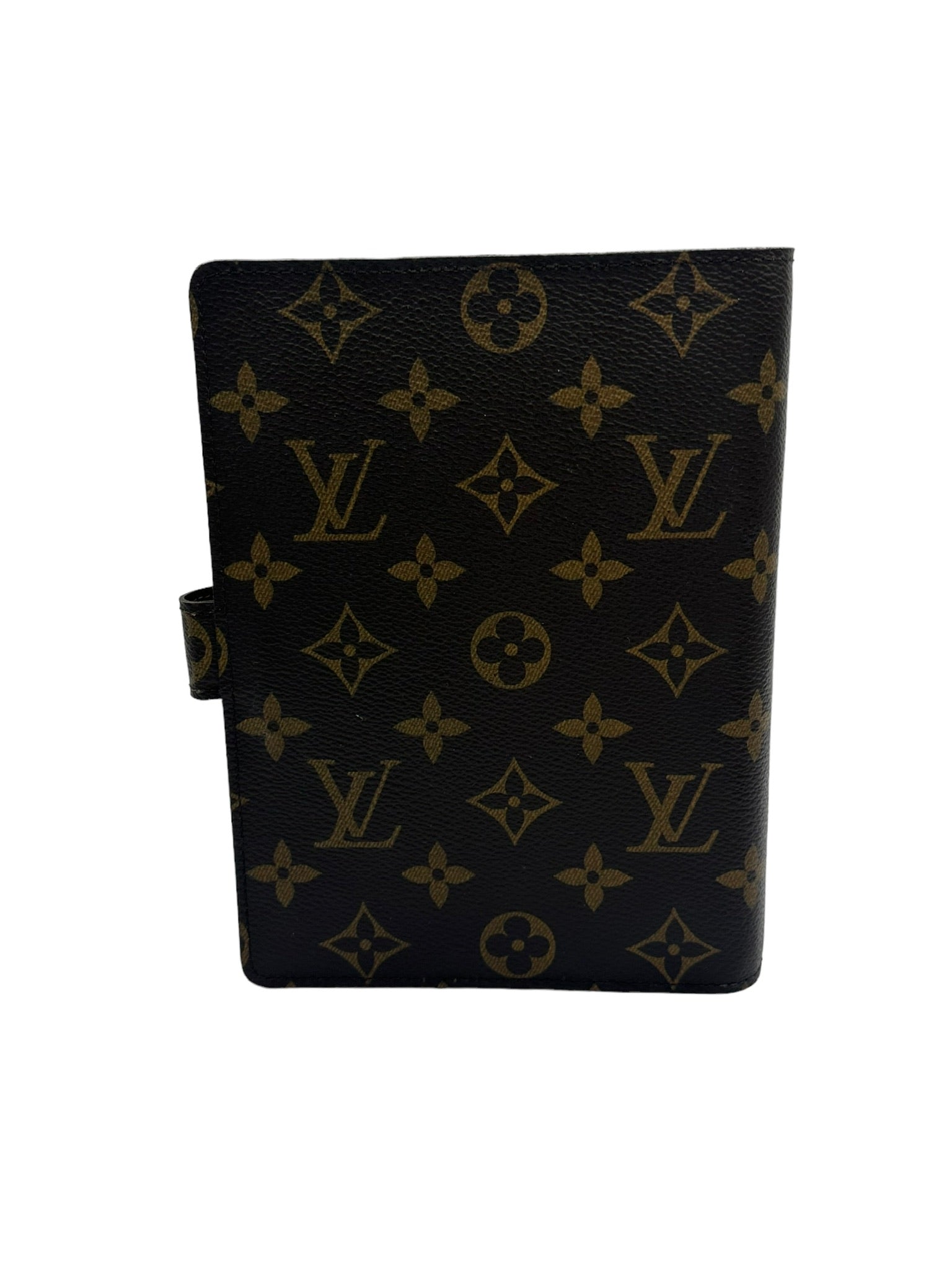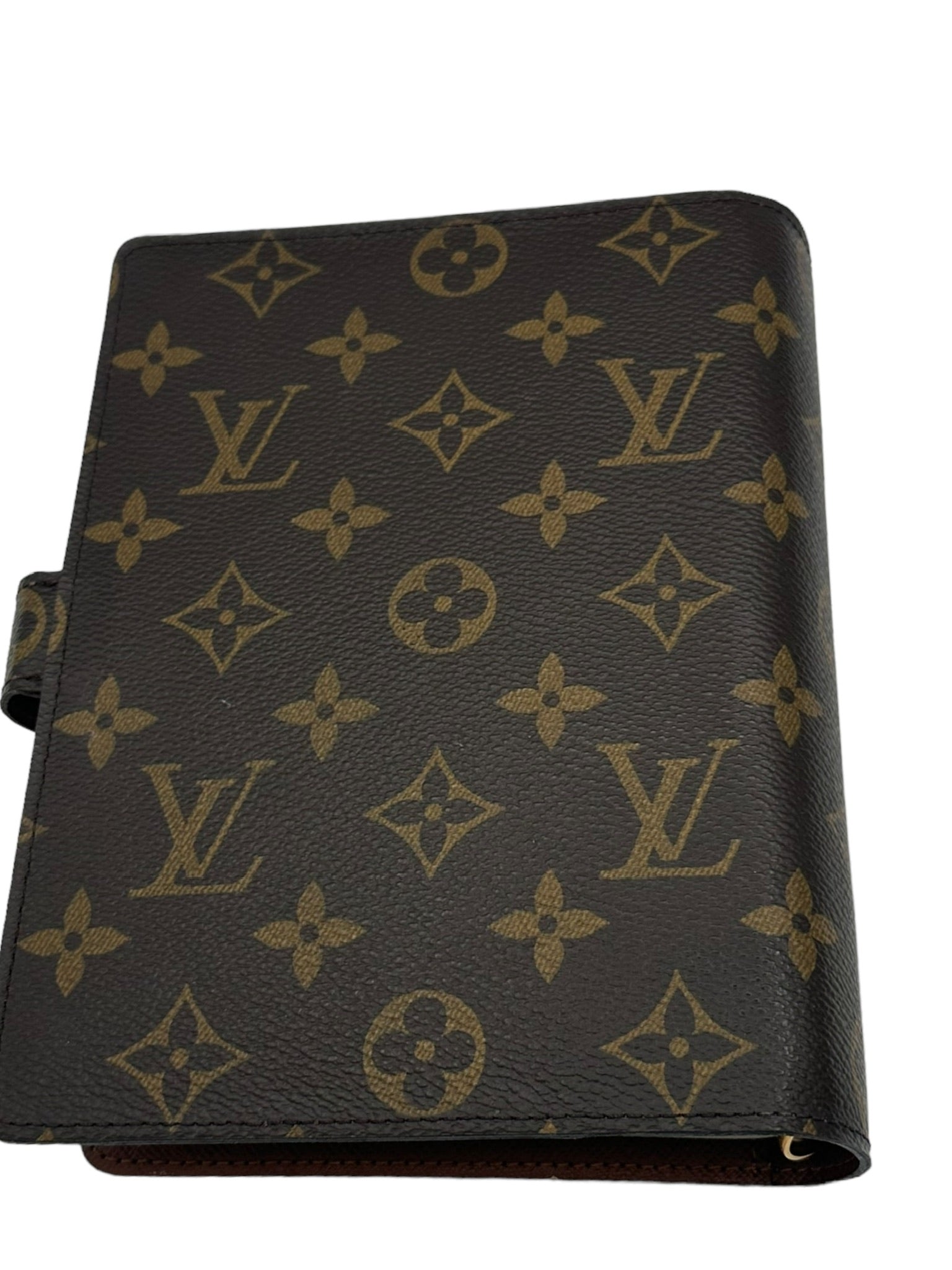 The LOUIS VUITTON Monogram Canvas Medium Ring Agenda features luxurious golden hardware, adding a touch of elegance to your organization. Keep your schedule and notes in style with this timeless piece.