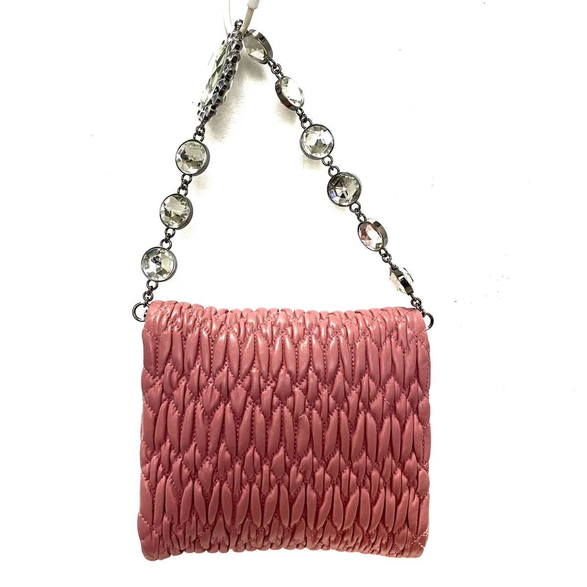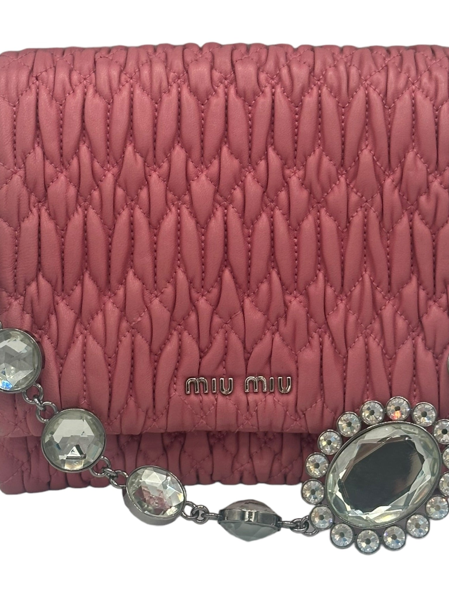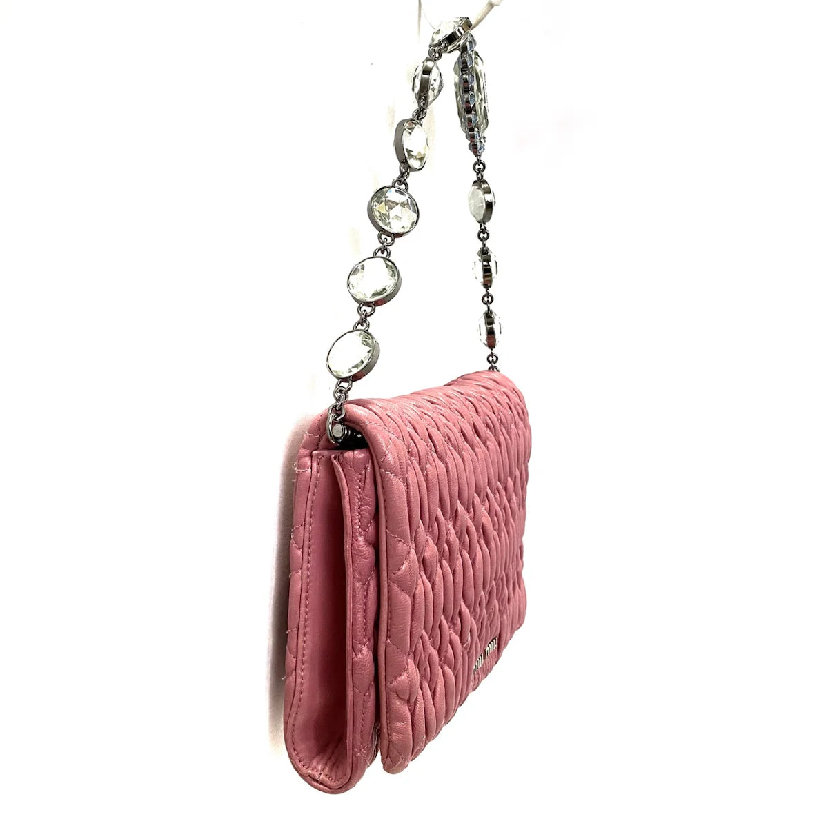 This MIU MIU handbag features delicate pink leather and a detachable hand strap adorned with crystal embellishments. Its compact size and interior pocket provide convenience, while the expert craftsmanship and elegant design make it the perfect accessory for any occasion.