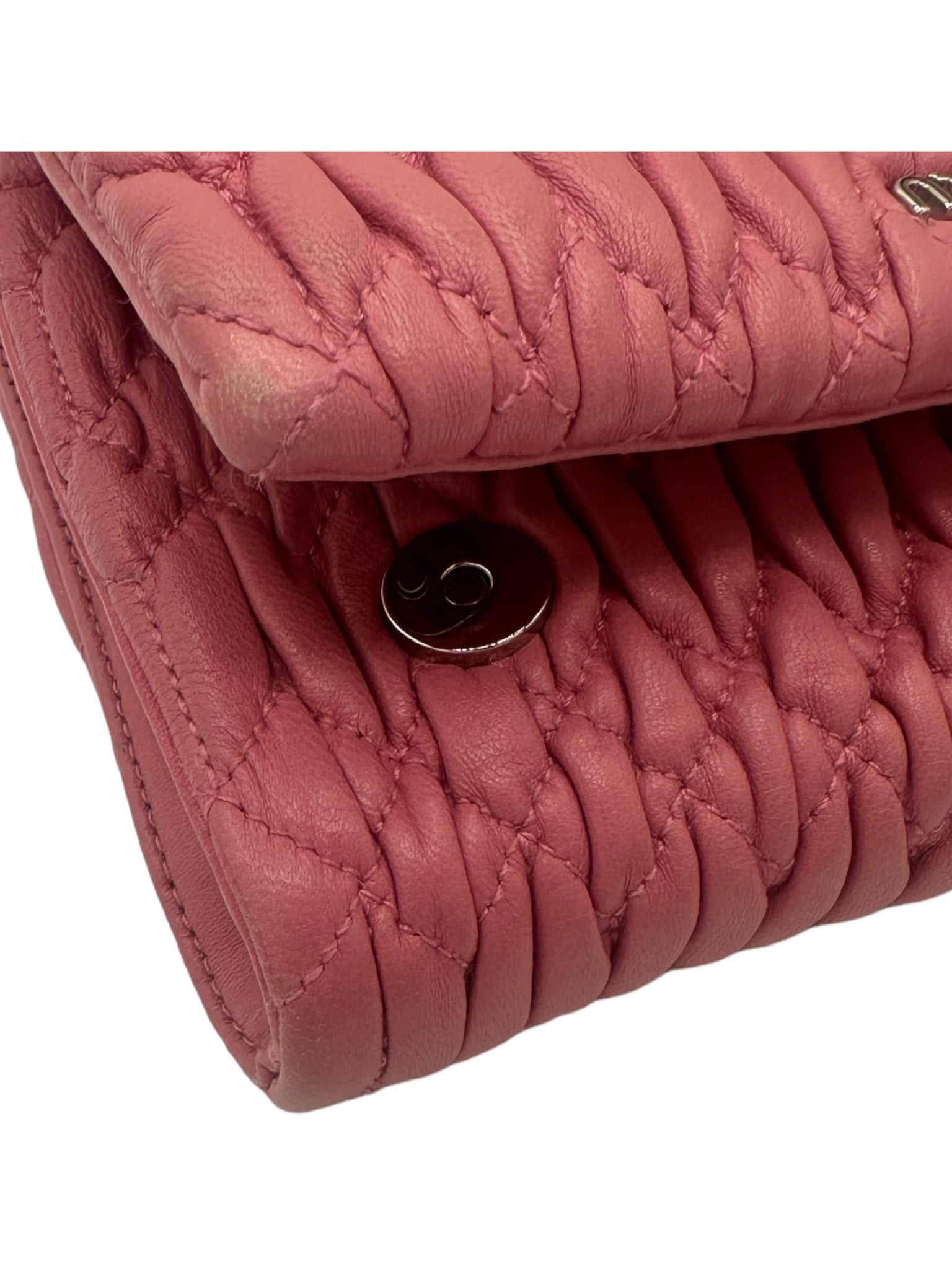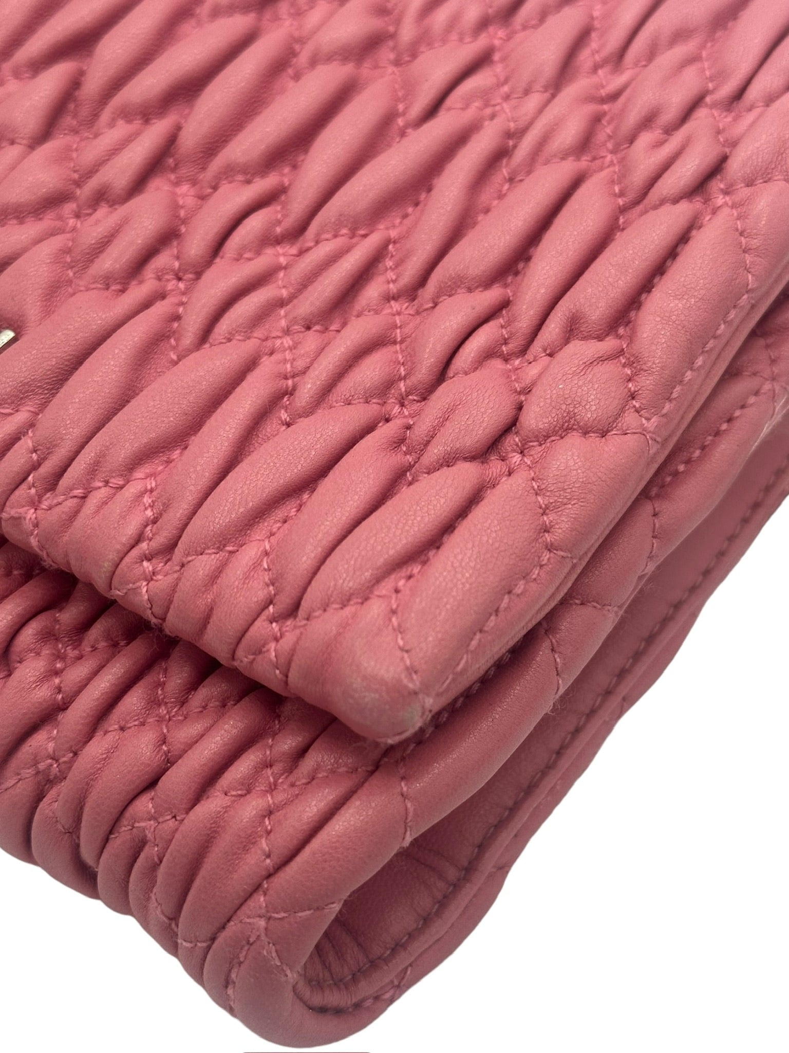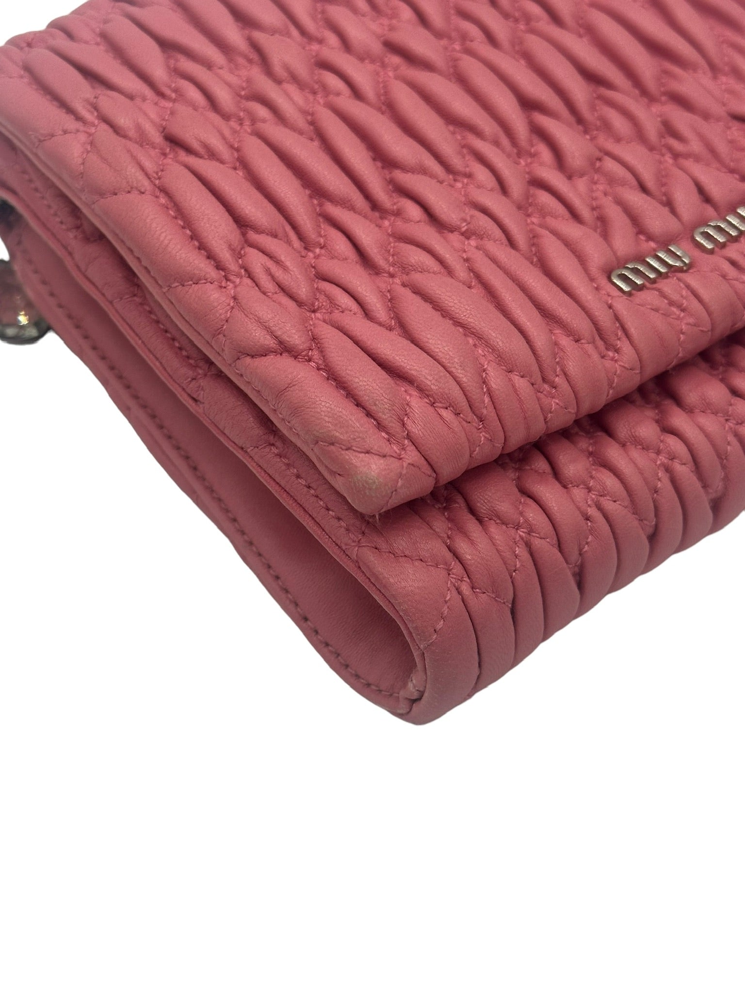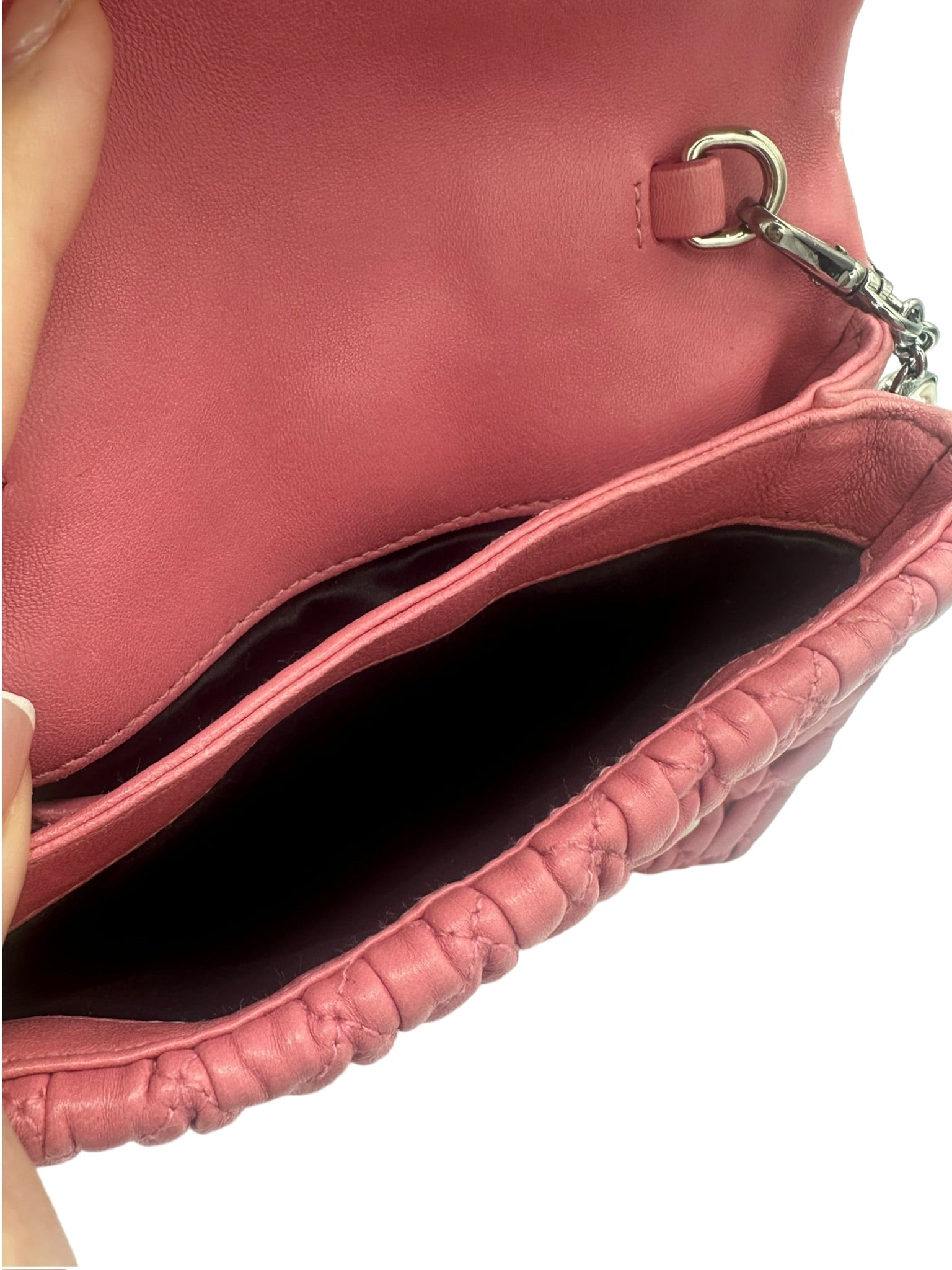 This MIU MIU handbag features delicate pink leather and a detachable hand strap adorned with crystal embellishments. Its compact size and interior pocket provide convenience, while the expert craftsmanship and elegant design make it the perfect accessory for any occasion.
