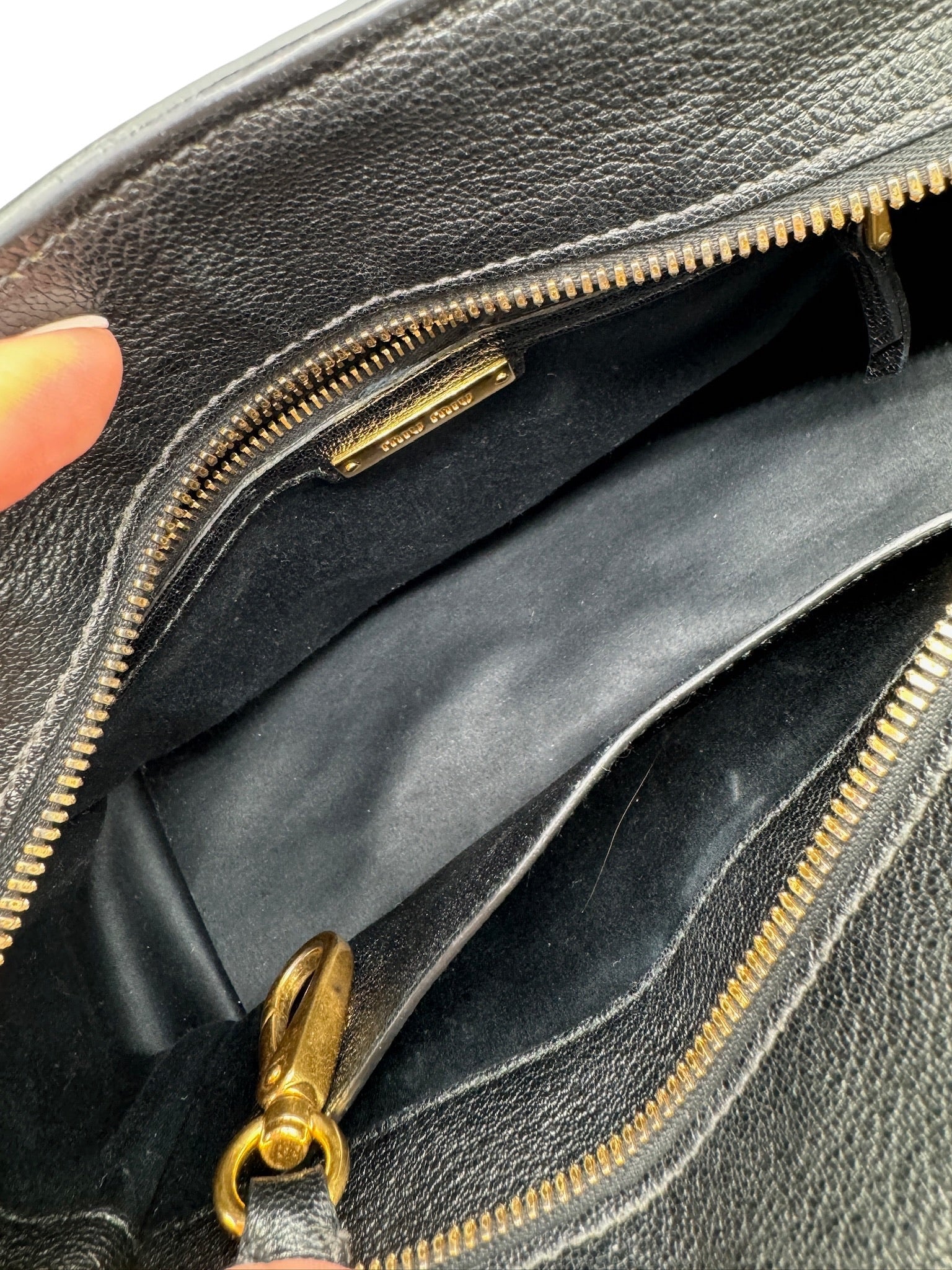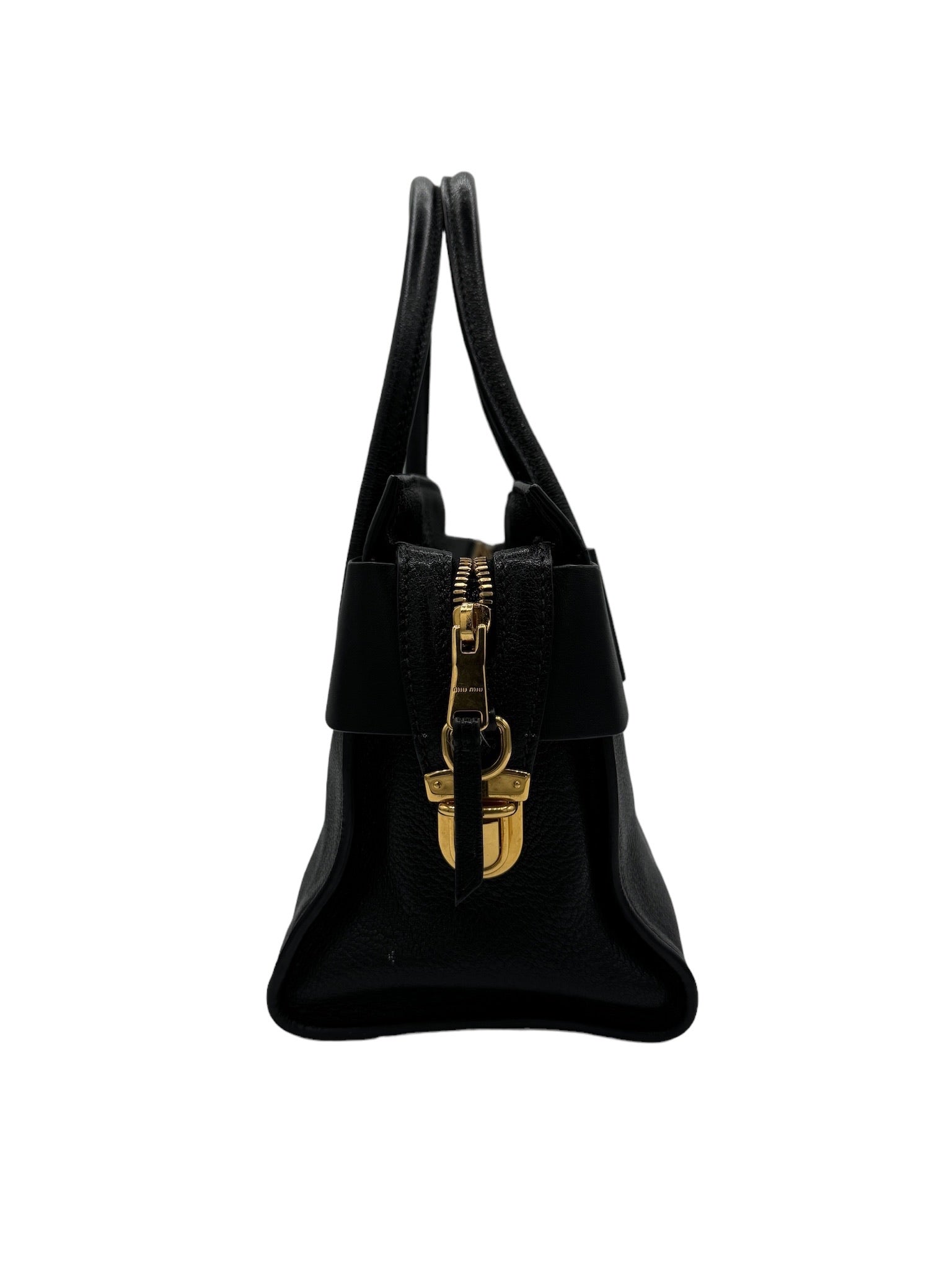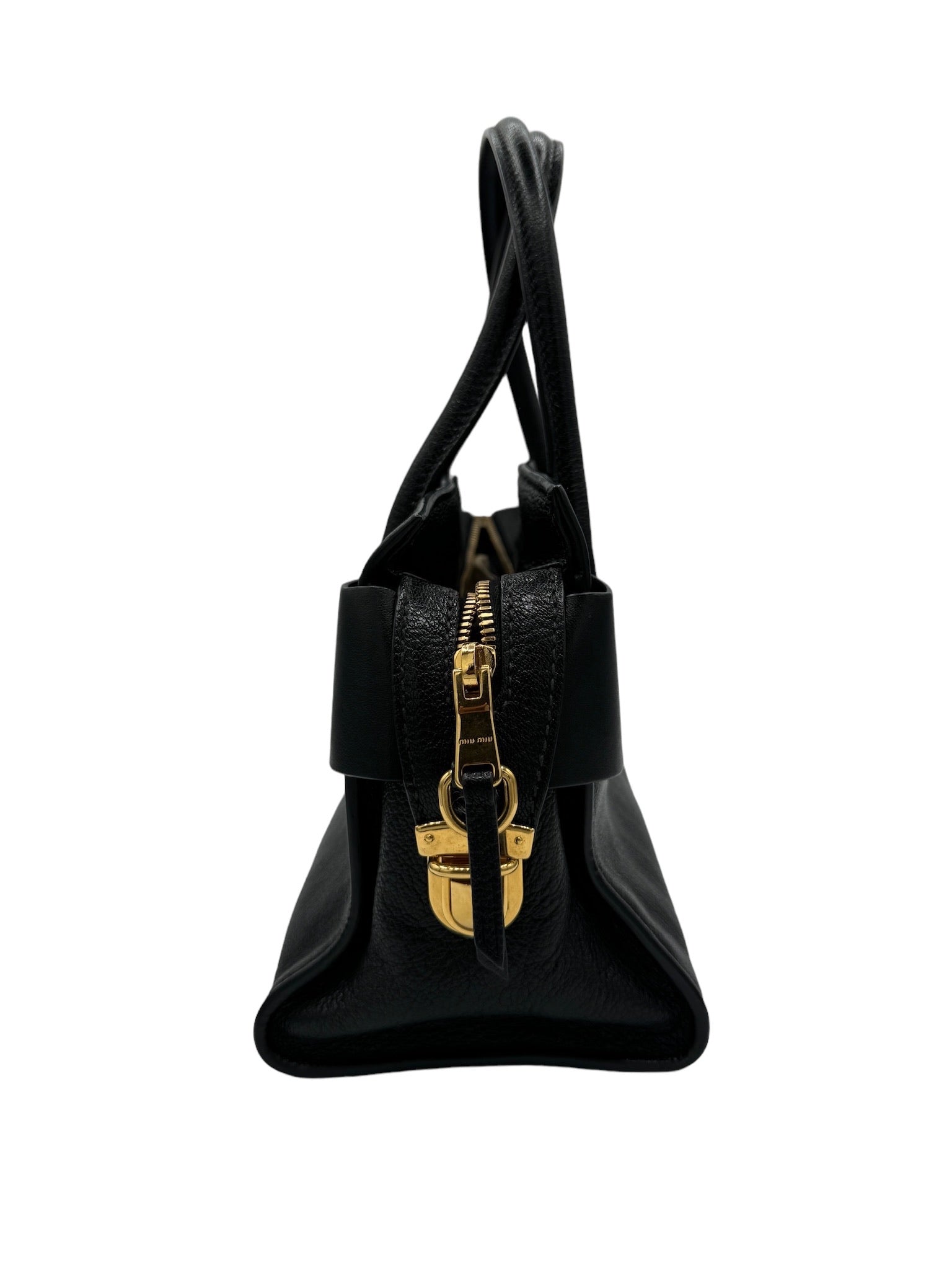 Expertly crafted from black leather, the MIU MIU Fiocco Bow Tote is a stylish and versatile accessory. Its compact size of 25.5cm x 14cm x 17cm makes it perfect for everyday use, while the 11cm handle drop adds convenience. Its gold tone hardware adds a touch of sophistication.