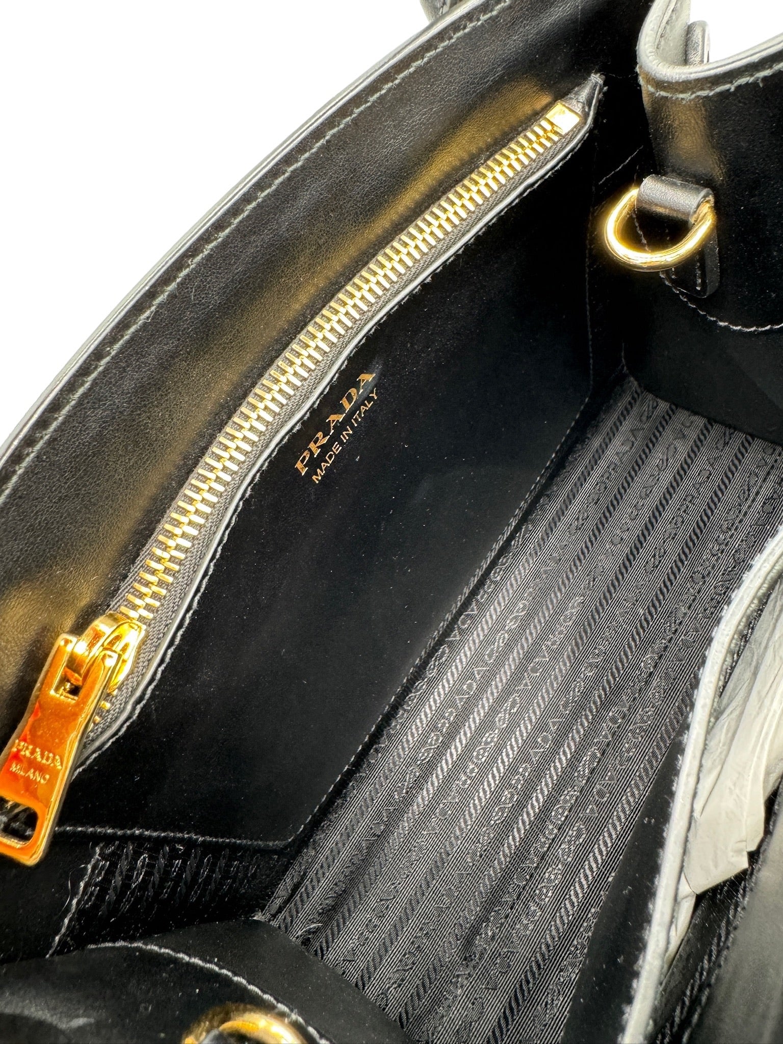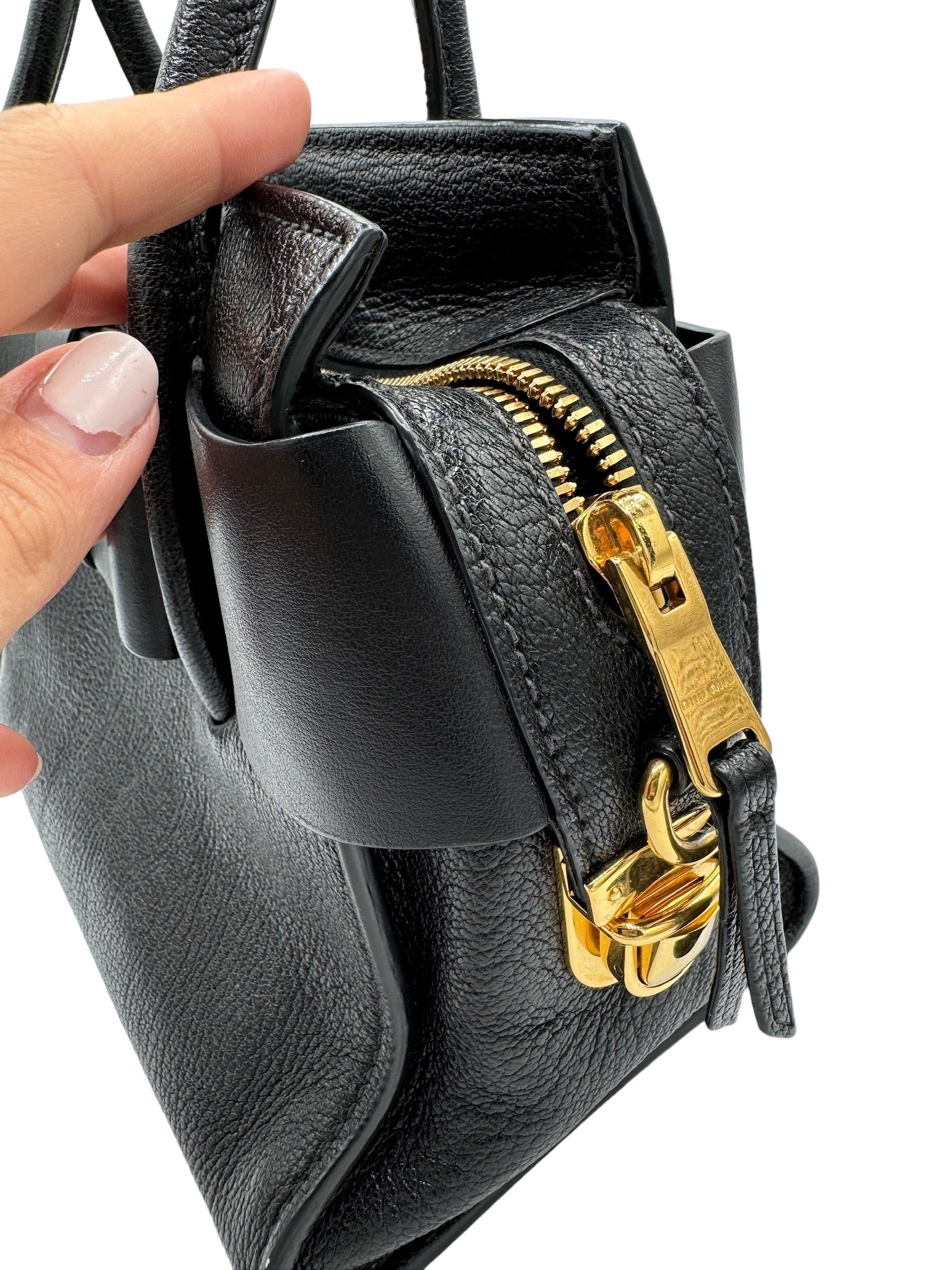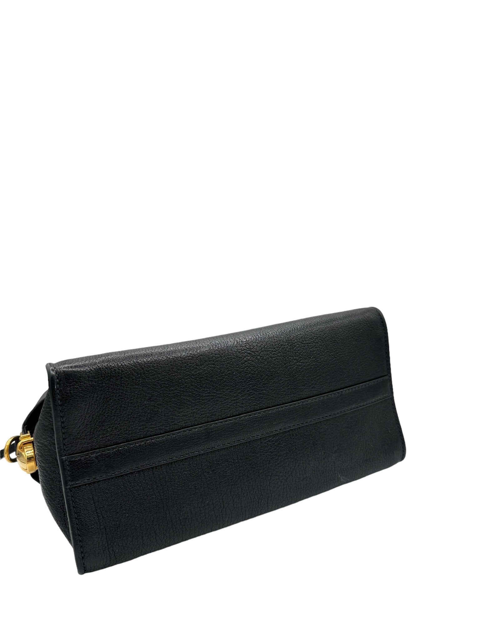 Expertly crafted from black leather, the MIU MIU Fiocco Bow Tote is a stylish and versatile accessory. Its compact size of 25.5cm x 14cm x 17cm makes it perfect for everyday use, while the 11cm handle drop adds convenience. Its gold tone hardware adds a touch of sophistication.