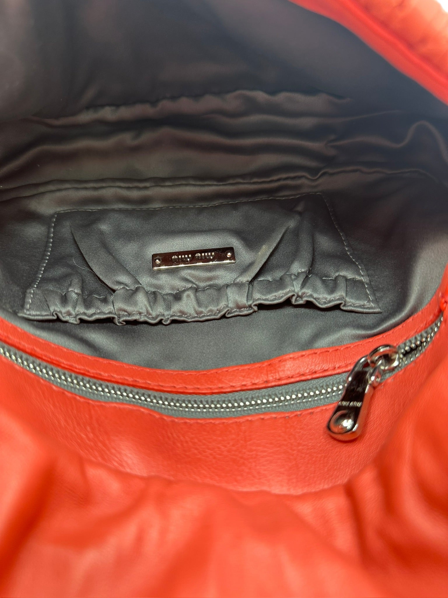 This Pre-Owned MIUMIU shoulder bag is a vintage piece that will add a pop of color to your outfit. The orange leather fabrication and silver hardware make for a stunning combination.