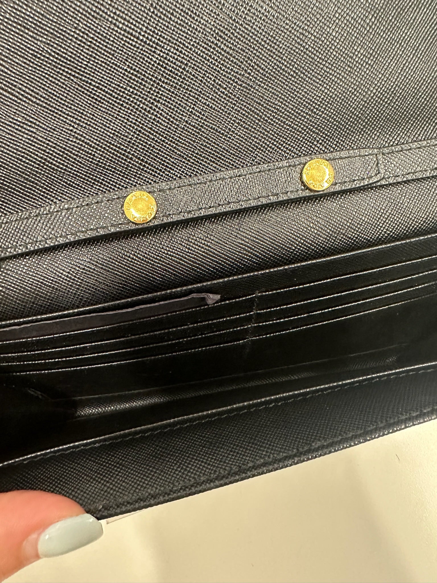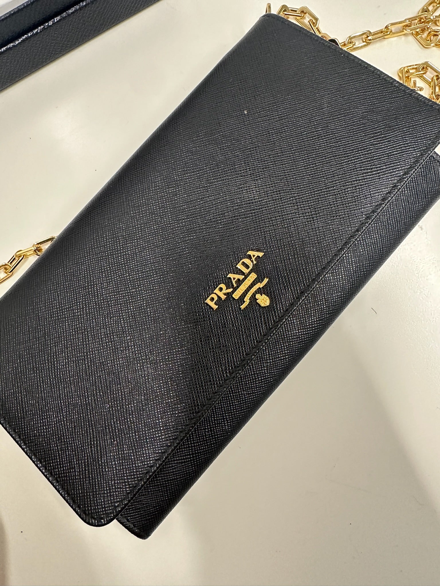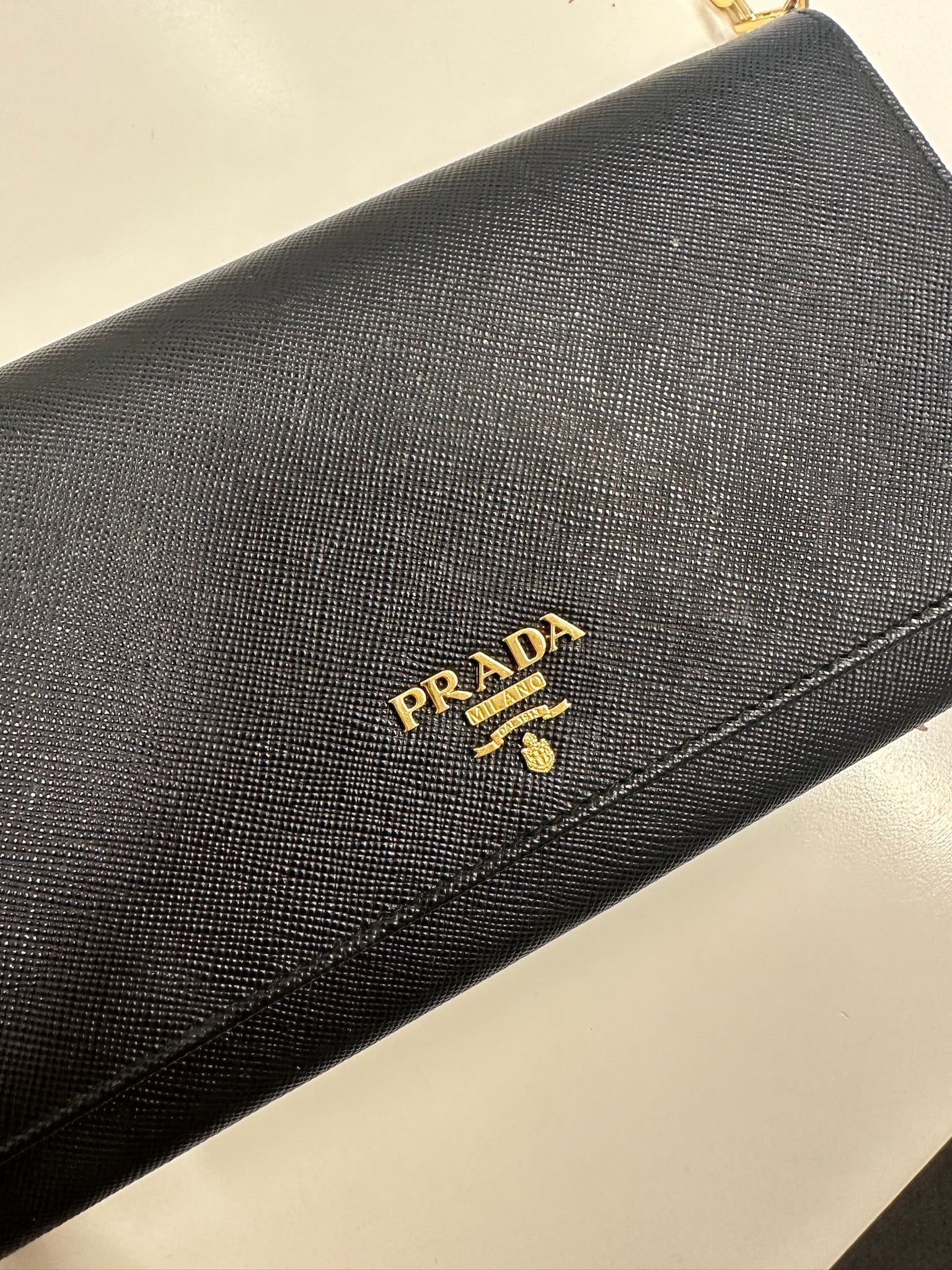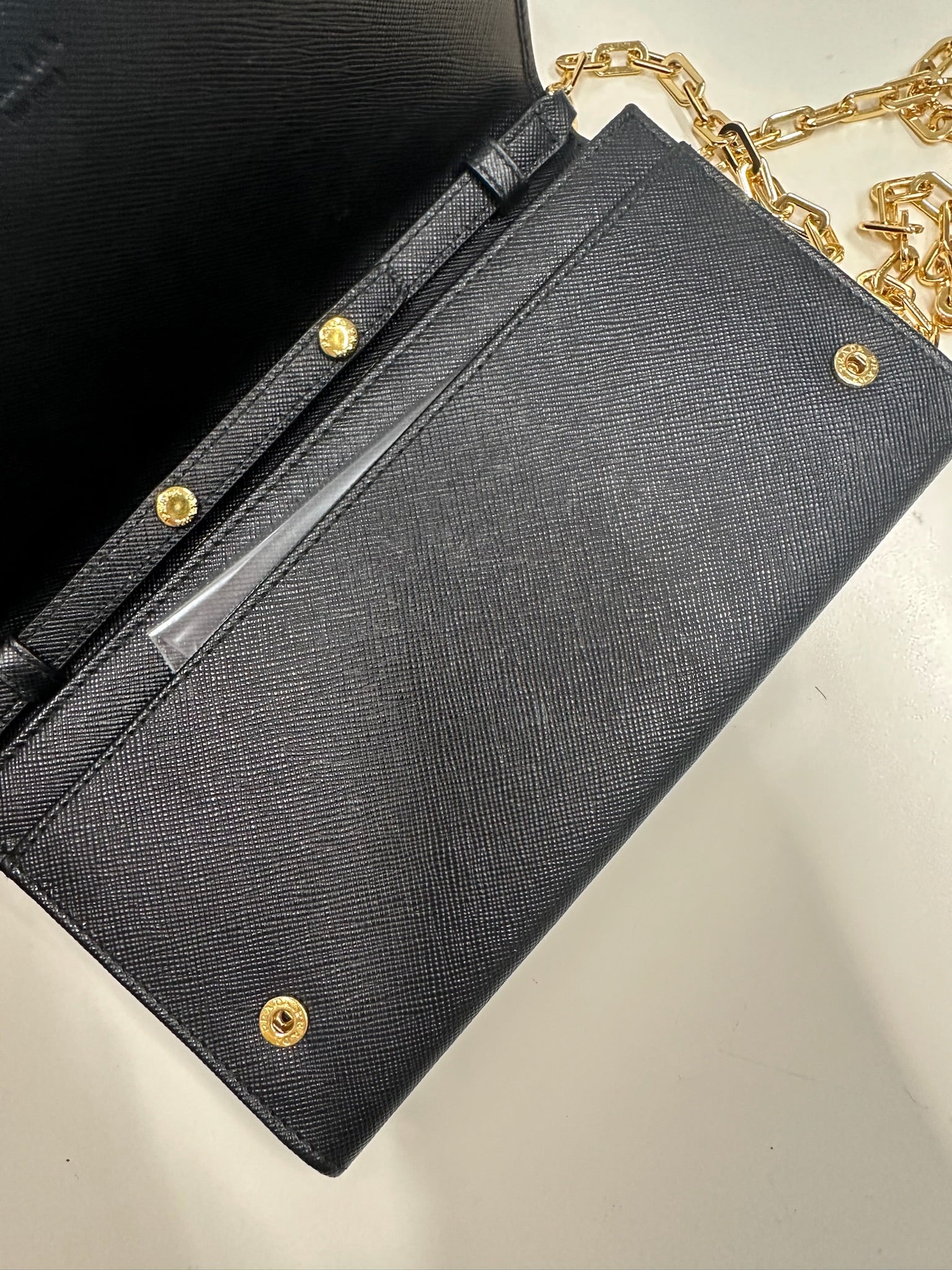 Elevate your style with the PRADA - Black Saffiano WOC. Adorned with golden toned hardware, this chic accessory adds a touch of sophistication to any outfit. Make a statement and command attention with this must-have piece from PRADA.