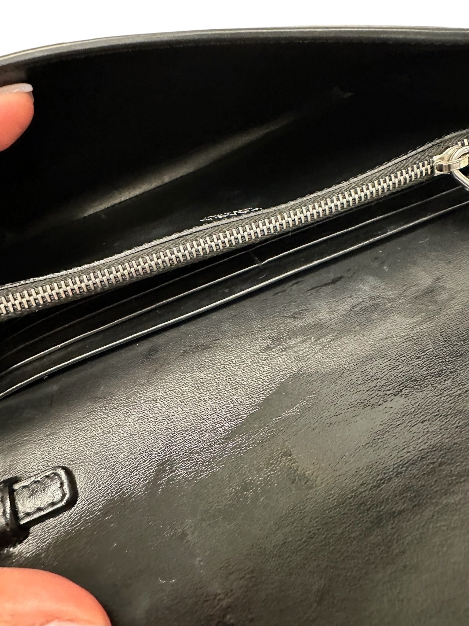 Elevate your style with PRADA's Black Tessuto Nylon Vitello Wallet on Strap! This versatile and sleek wallet features silver toned hardware, adding a touch of elegance to any outfit. Stay organized and chic with this must-have accessory.