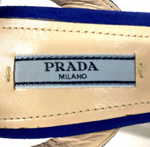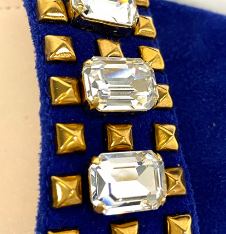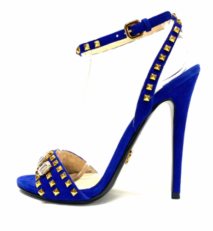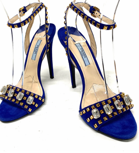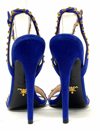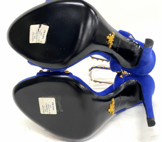 Elevate your shoe collection with these stunning blue and gold Prada sandals adorned with shimmering rhinestones. Crafted from luxurious velour material, these sandals are perfect for adding a touch of glamour to any outfit.