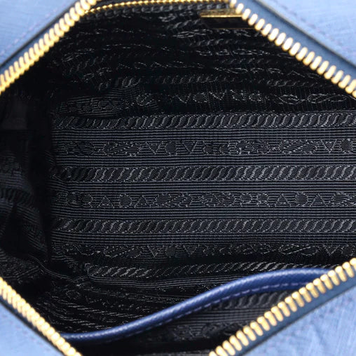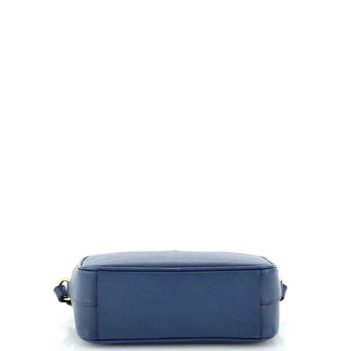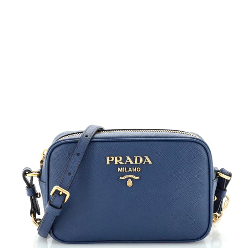Expertly crafted with saffiano leather in Prada's signature blue, this small camera bag is the perfect blend of style and functionality. The luxurious gold hardware adds a touch of elegance, while the detachable strap offers versatile wear options. The spacious fabric interior is perfect for carrying all your essentials with ease.