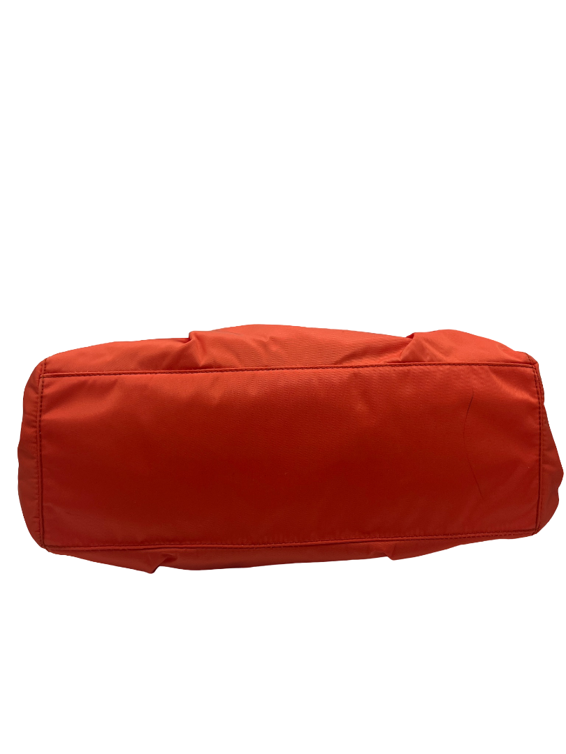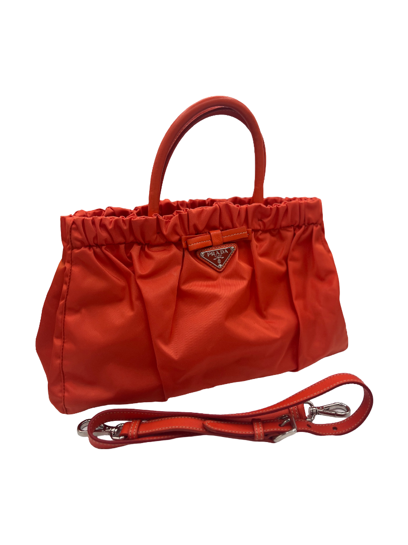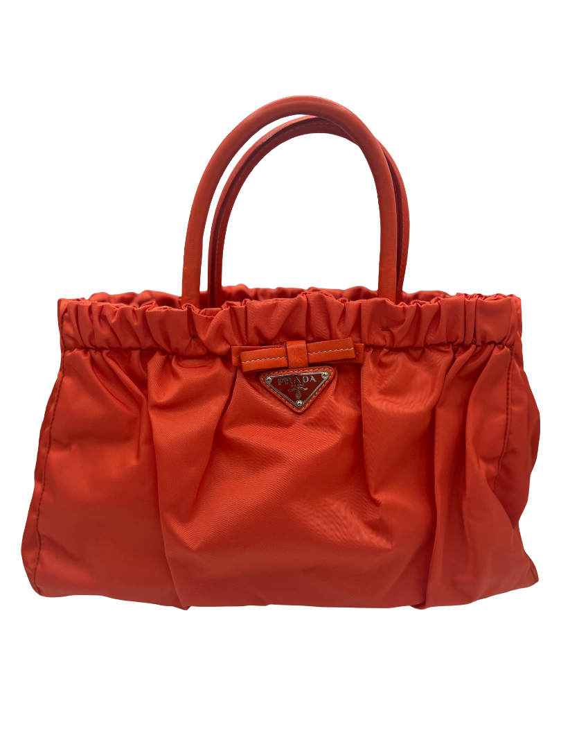This Pre-Owned PRADA Gathered Bag Handbag is a stylish addition to any wardrobe. The vibrant orange color and gathered design make it a standout piece.