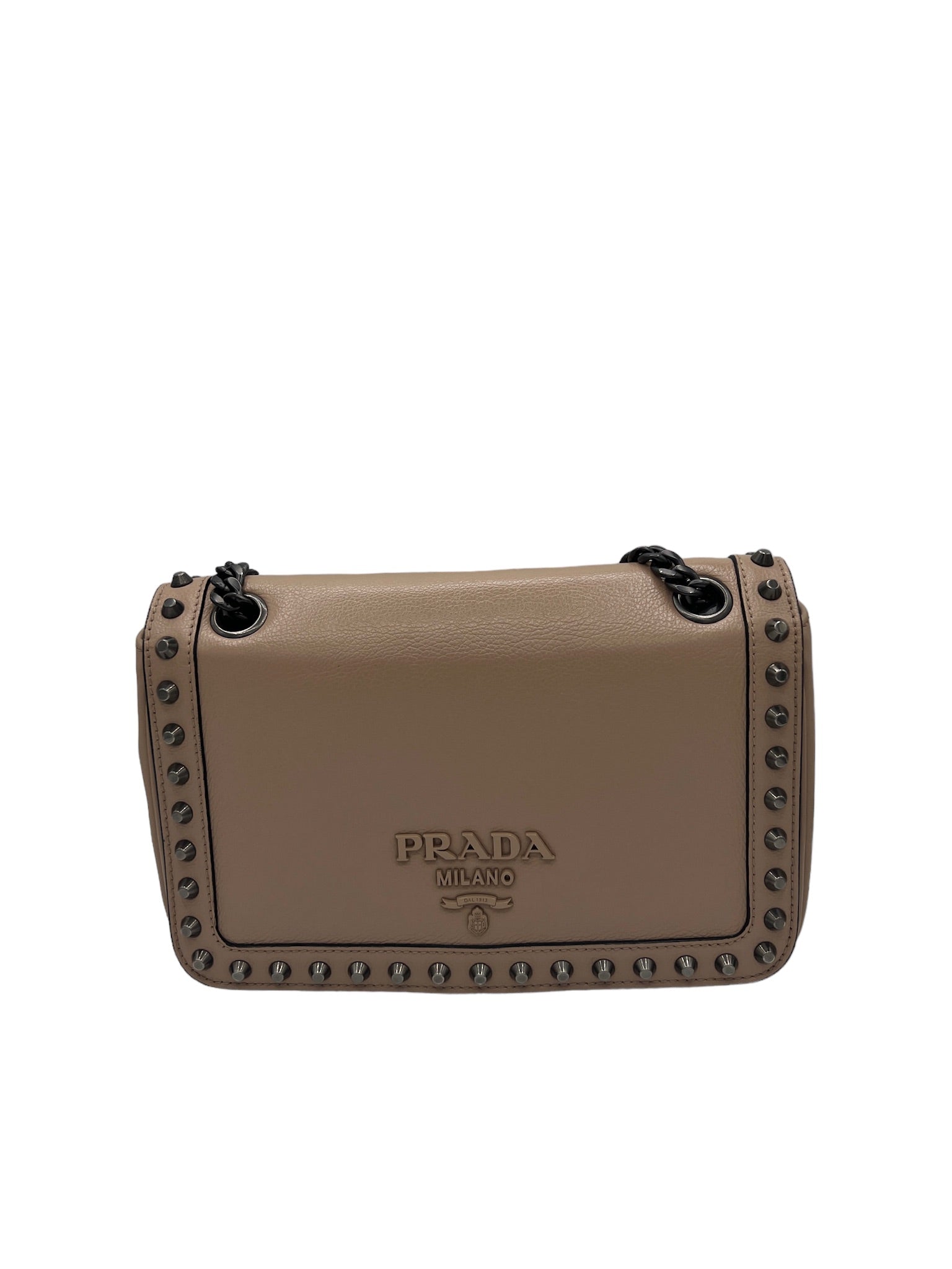 Pre-Owned PRADA Glace Calf Studded Shoulder Bag is a classic silhouette that exudes elegance and sophistication. The beige leather fabrication of the bag gives it a luxurious look and feel.