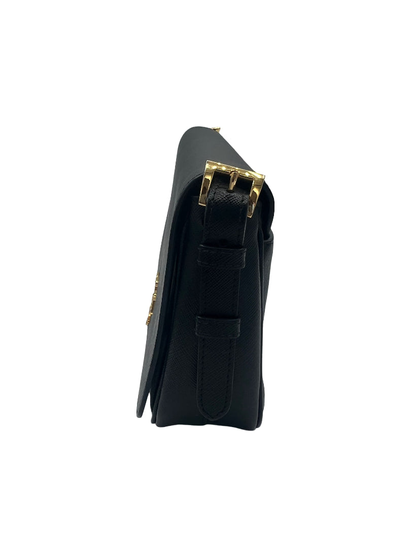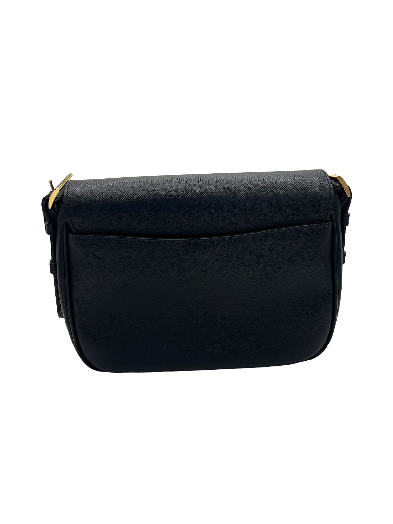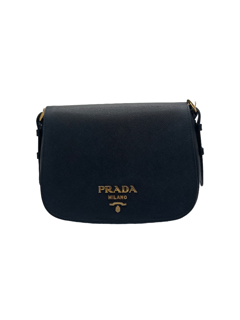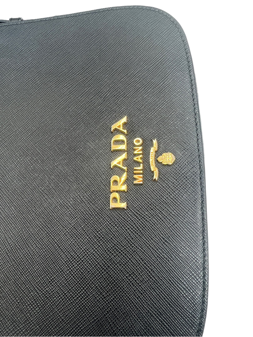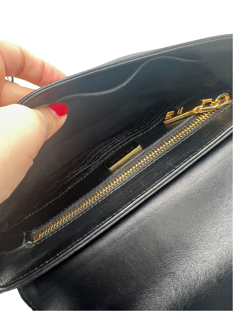 This Pre-owned PRADA Logo Shoulder Bag in black leather is a stylish and practical addition to any outfit.