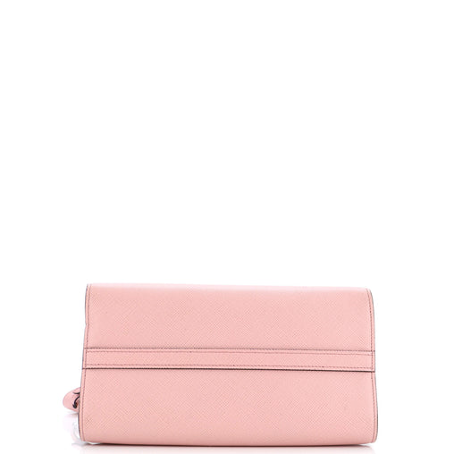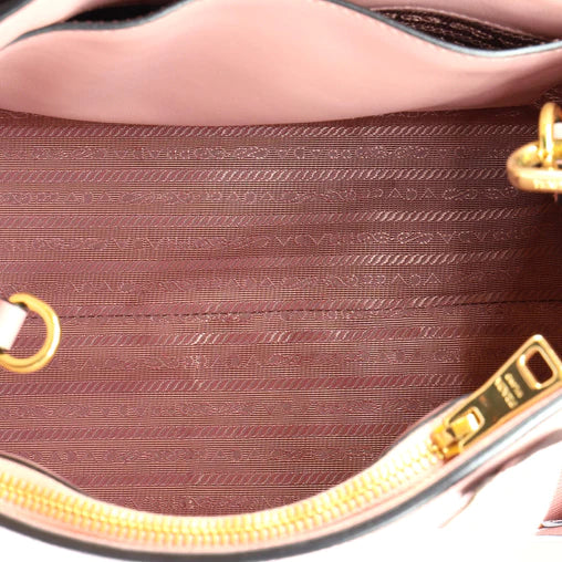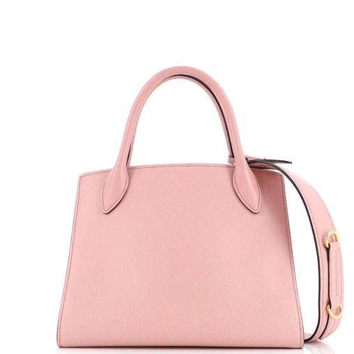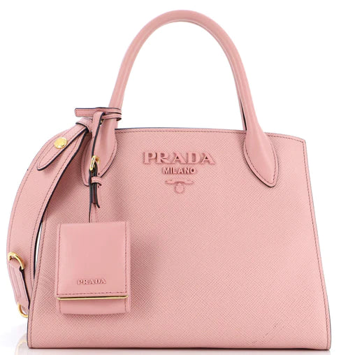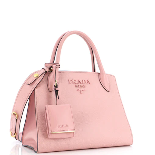 Expertly crafted by PRADA, the Monochrome Tote Saffiano with City Calf Small is a chic and stylish addition to any wardrobe. Made of high-quality leather, its pink exterior and interior provide a touch of luxury. With gold hardware and included accessories such as a clochette and detachable strap, this tote is both functional and fashionable.