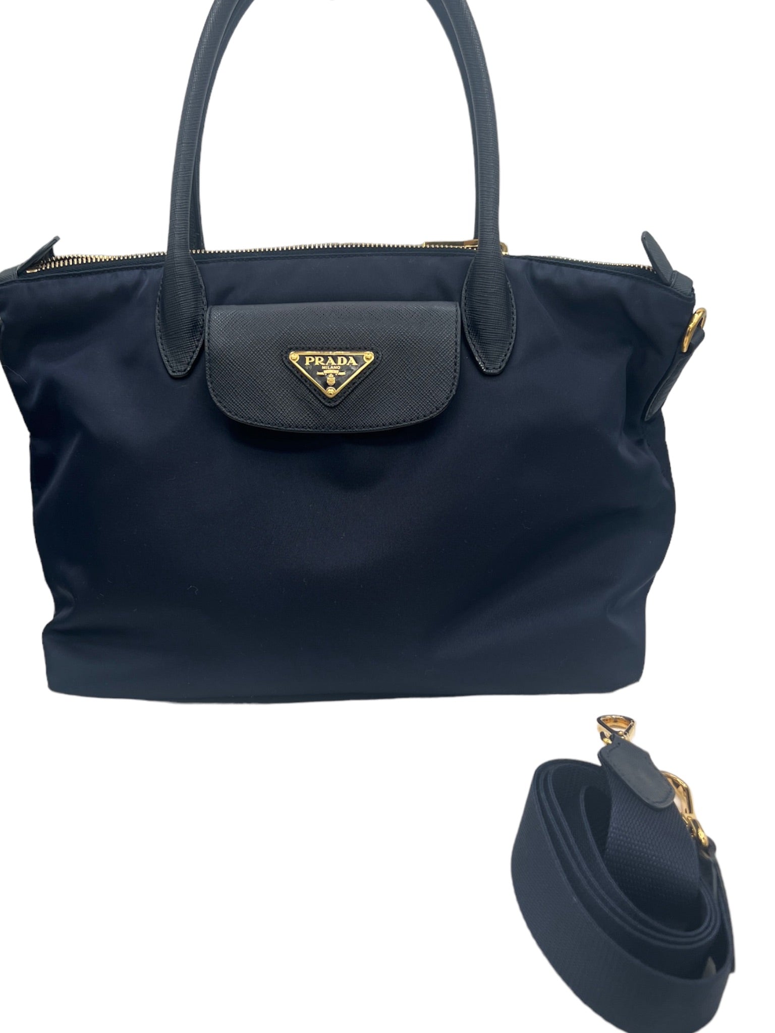This Pre-Owned PRADA shoulder bag comes in a stylish navy blue Tessuto and nylon leather fabrication that adds a chic touch to any outfit. The golden toned hardware provides a luxurious accent to the bag and enhances its overall look.