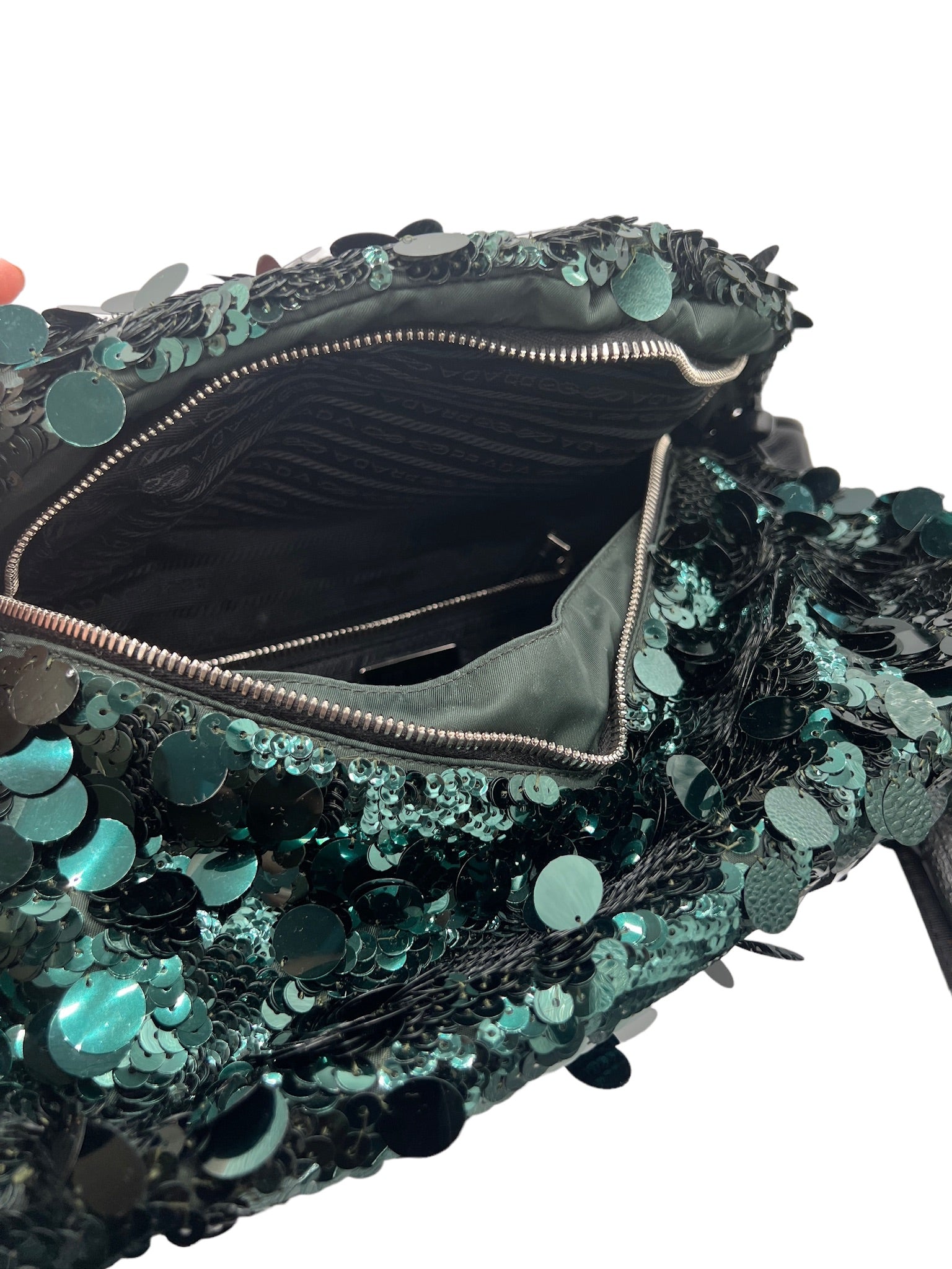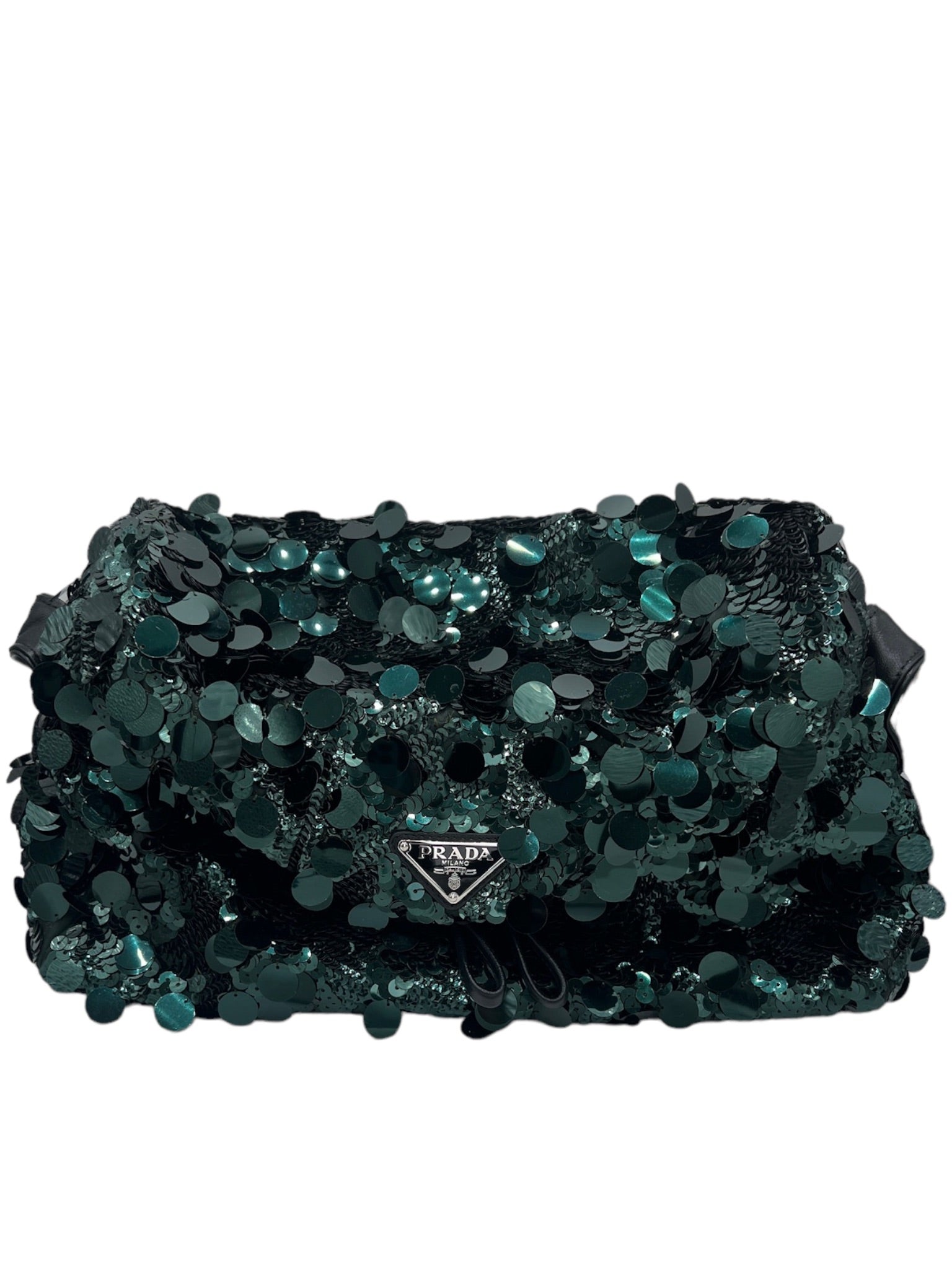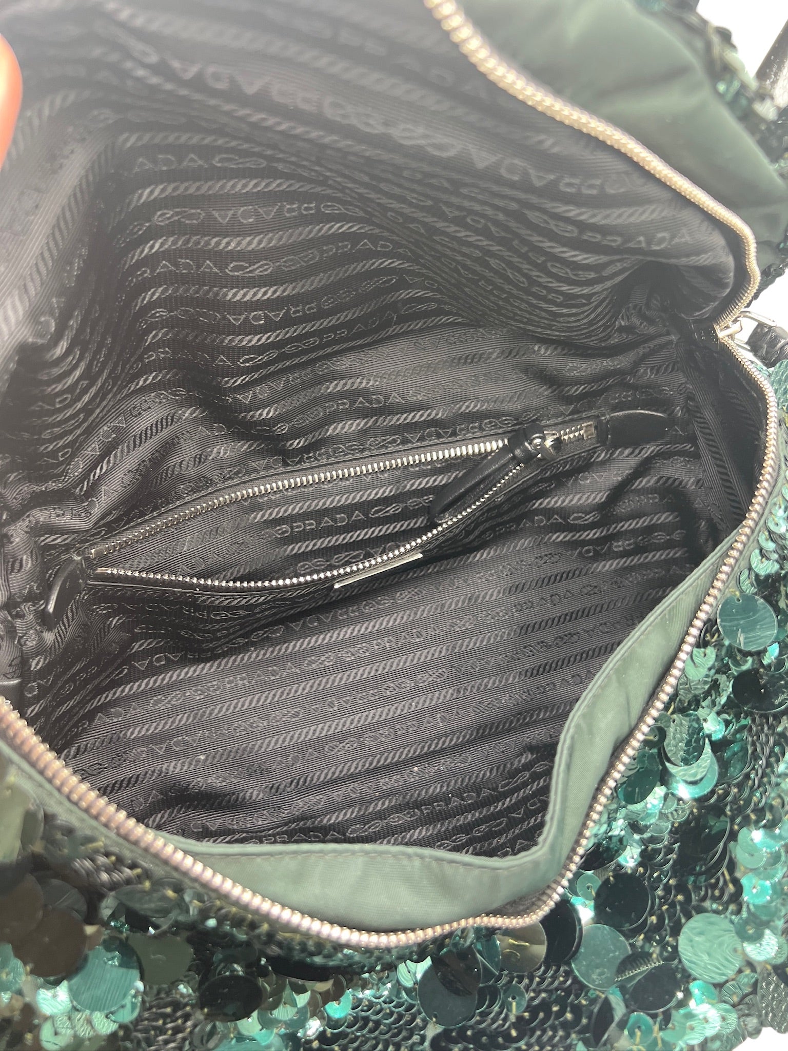 This PRADA Sequin Signaux Shoulder Bag is a perfect addition to your collection. The Bag Silhouette is shoulder bag, which makes it comfortable to carry around. The beautiful green color and leather fabrication make it an eye-catching piece.