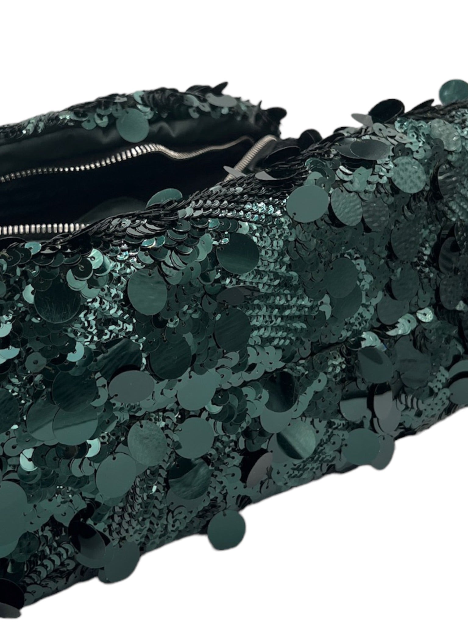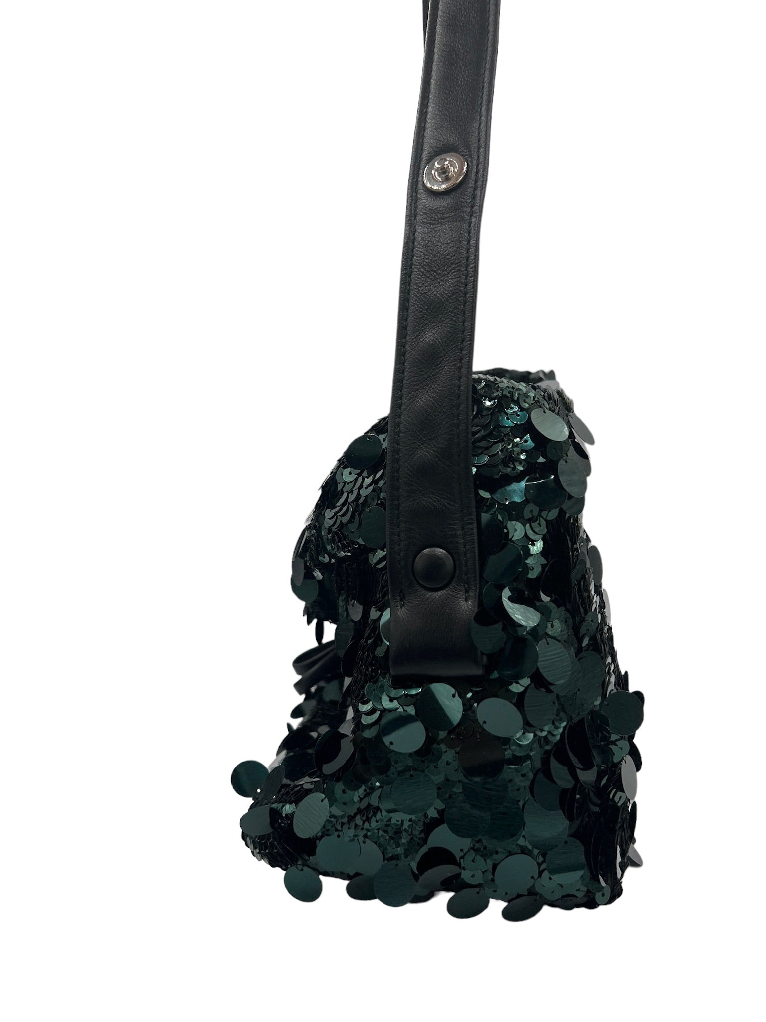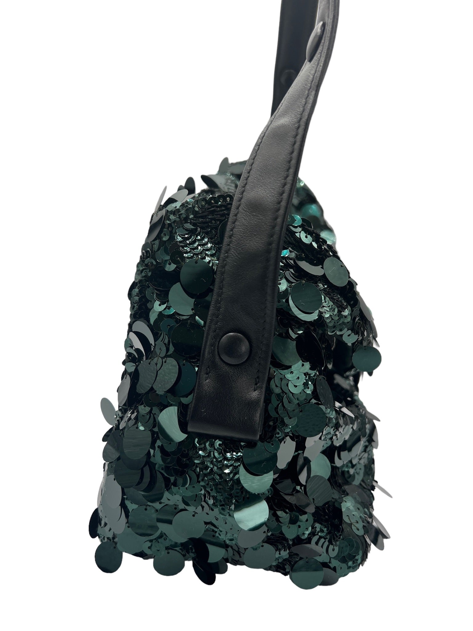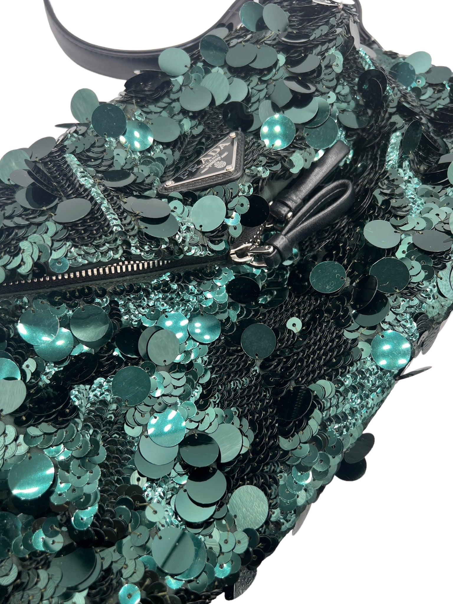 This PRADA Sequin Signaux Shoulder Bag is a perfect addition to your collection. The Bag Silhouette is shoulder bag, which makes it comfortable to carry around. The beautiful green color and leather fabrication make it an eye-catching piece.