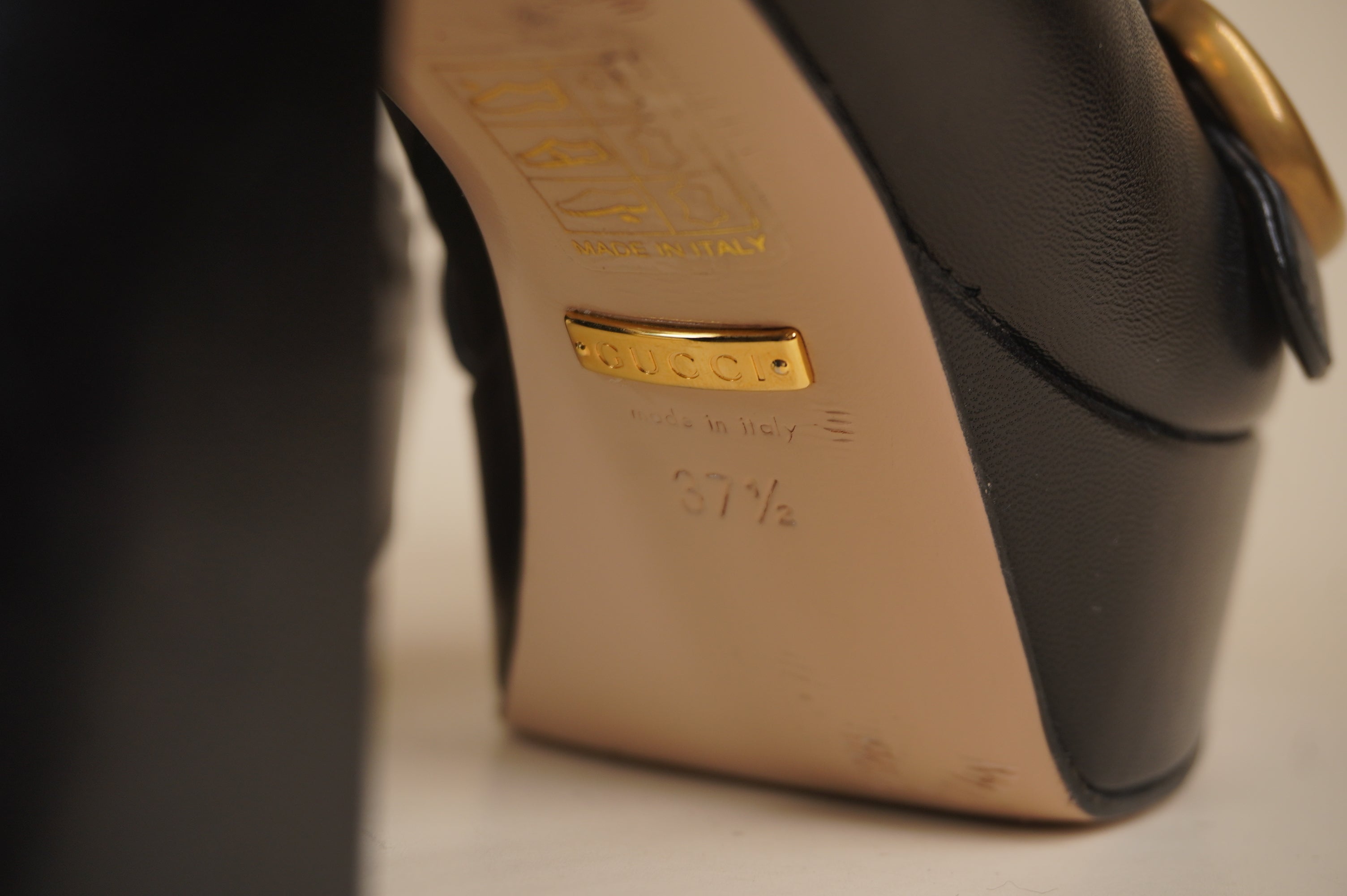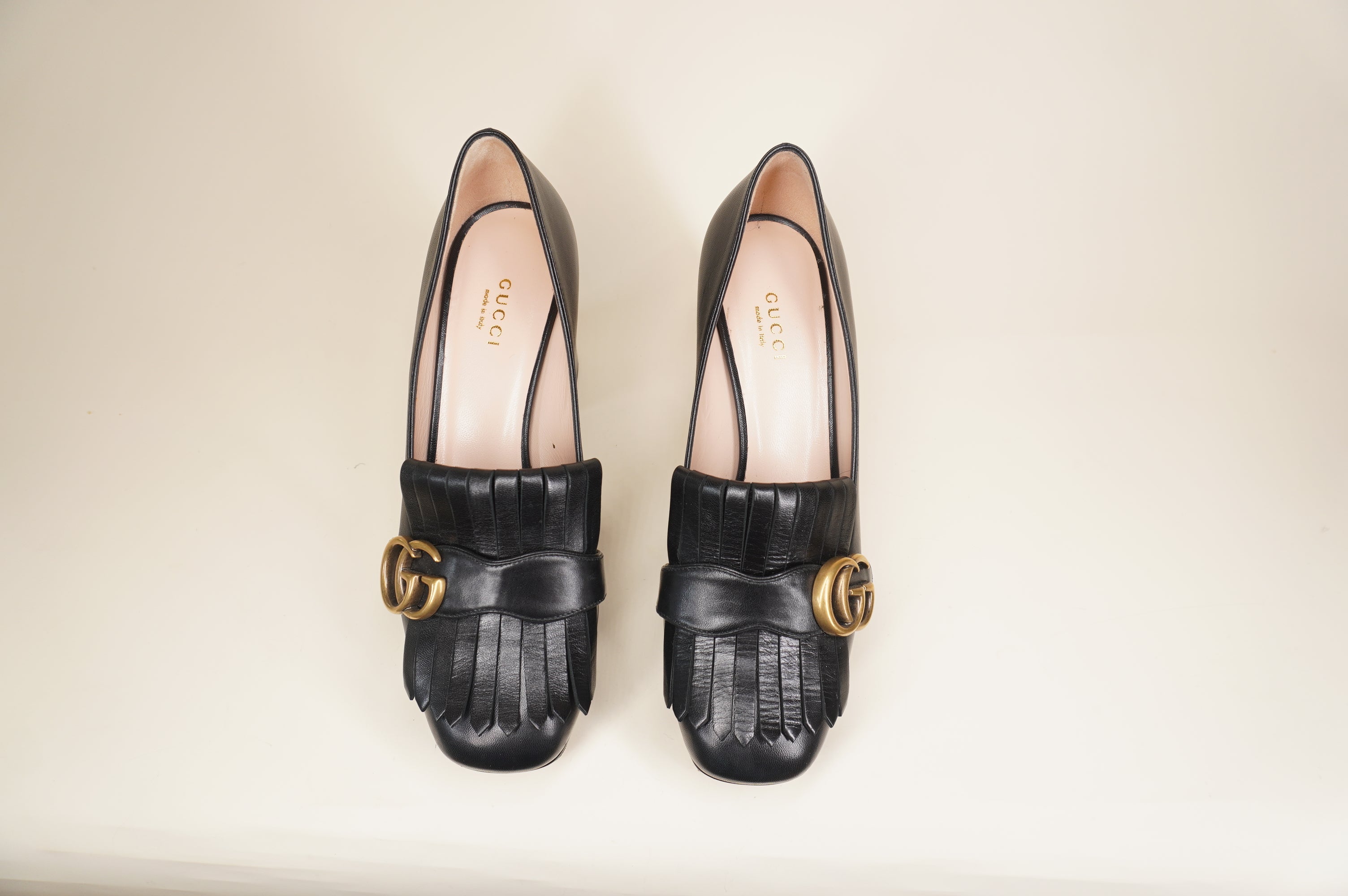 Step into timeless elegance with these Black Leather GG Marmont Fringe Platform Pumps. Crafted from luxurious black leather, they feature the iconic GG Marmont design and stylish fringe detailing, adding a bold touch to any outfit. The platform sole provides comfortable height, making them perfect for all-day wear.