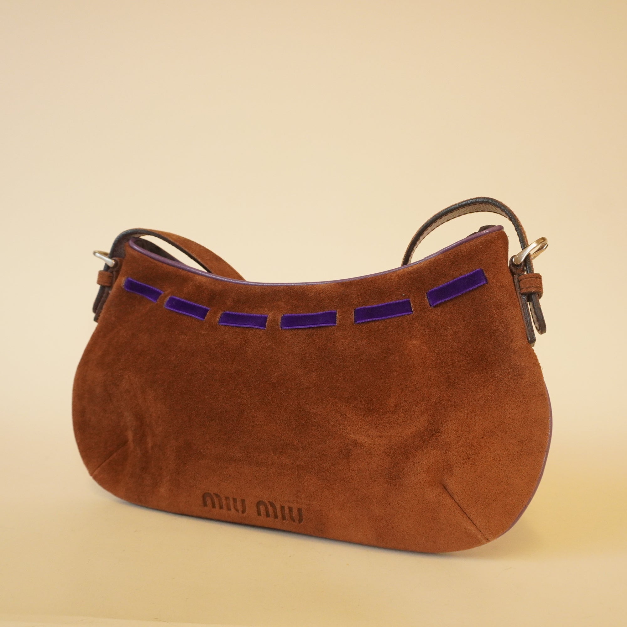This pre-owned Miu Miu handbag in dark brown and purple features a unique combination of suede, leather, and velour fabrication. The bag silhouette is mini, making it perfect for carrying essentials in style.