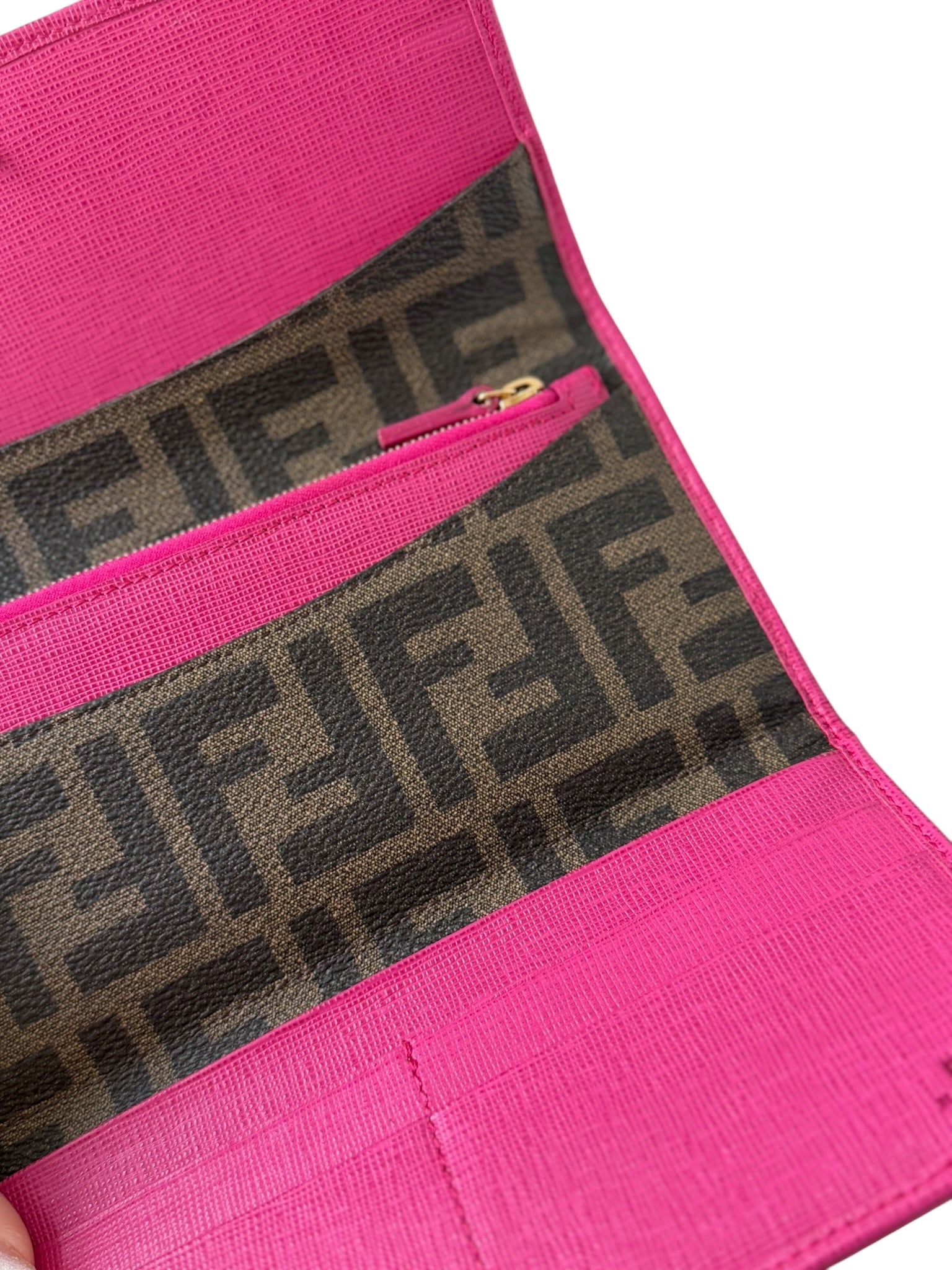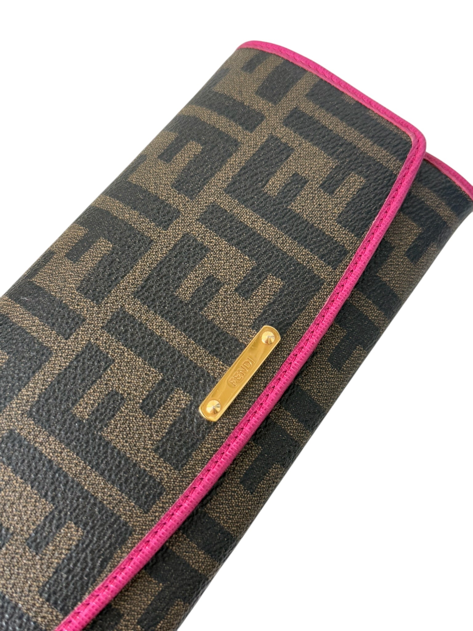 This PRE-OWNED FF Vitello Elite Zucca Tobacco Wallet is a classic accessory that exudes luxury with its golden toned hardware and pink lining. With a size of 7.5''x1''x3.5'', it provides ample space for all your essentials while adding a touch of elegance to your outfit. Elevate your style today!