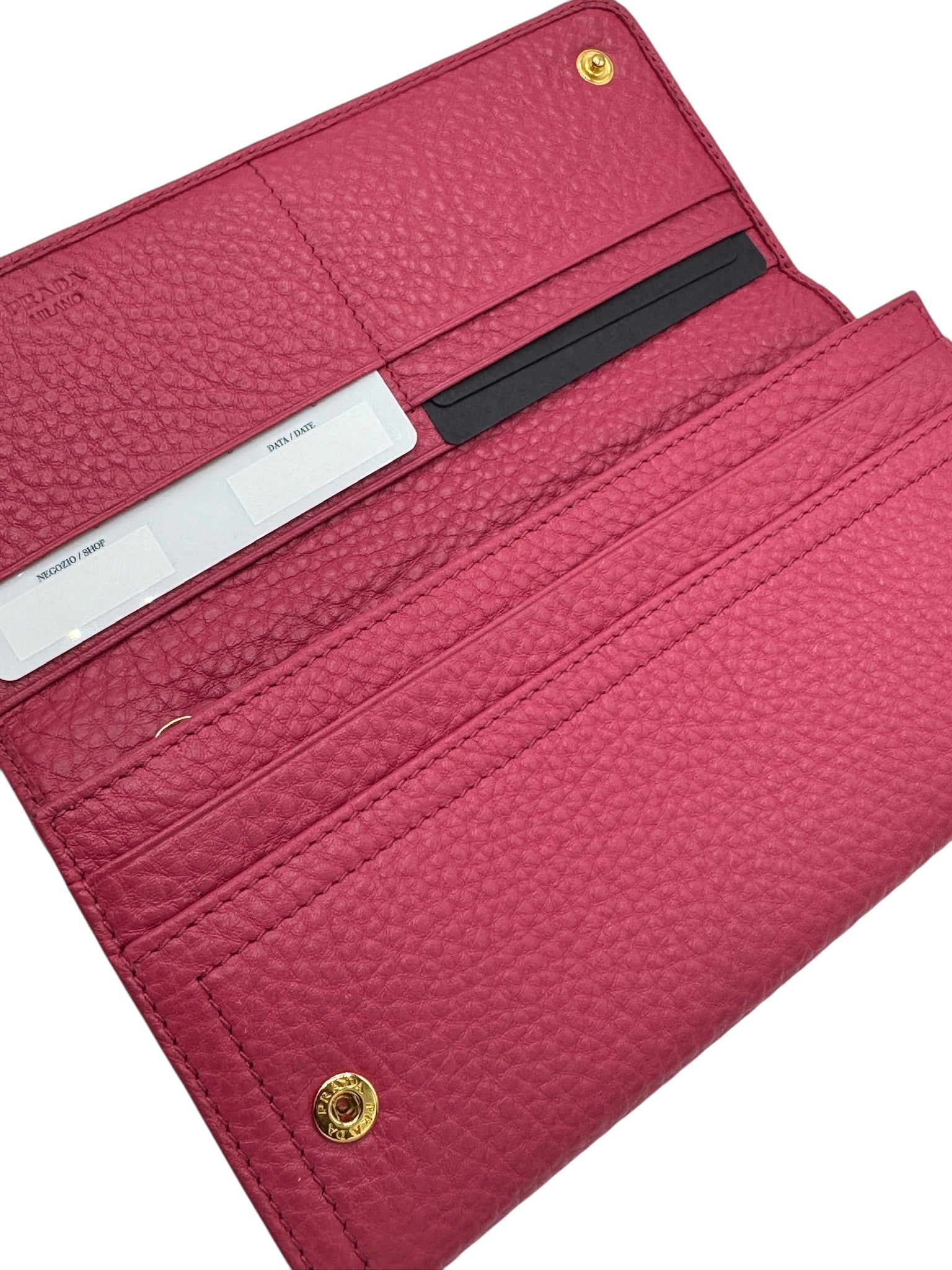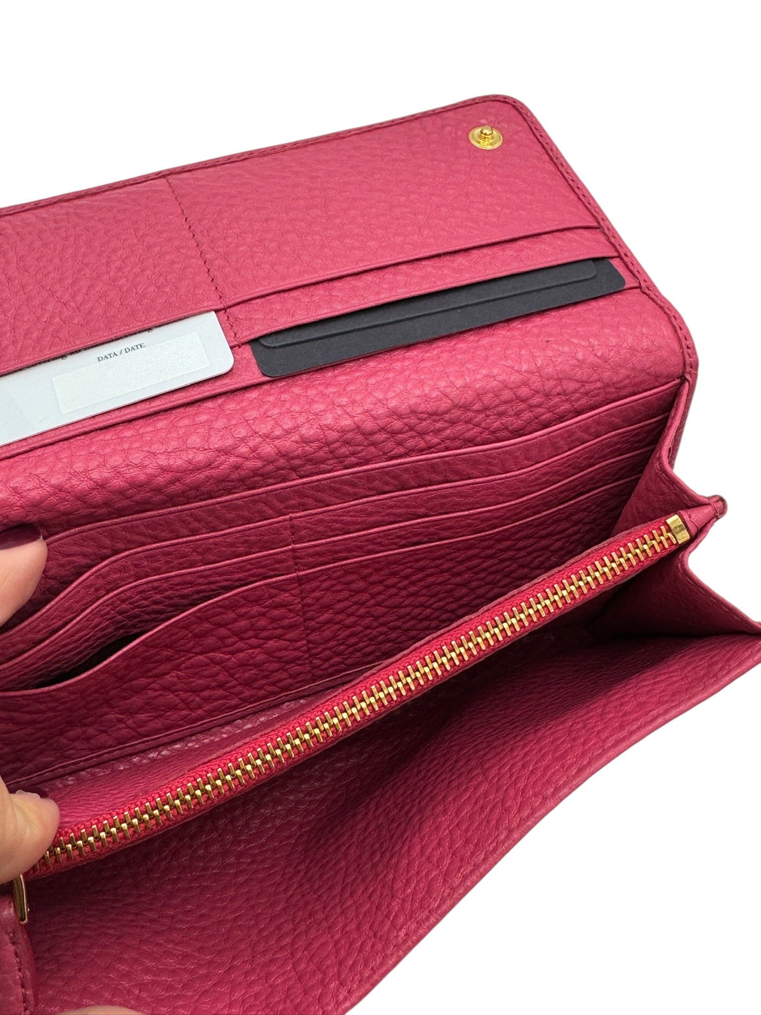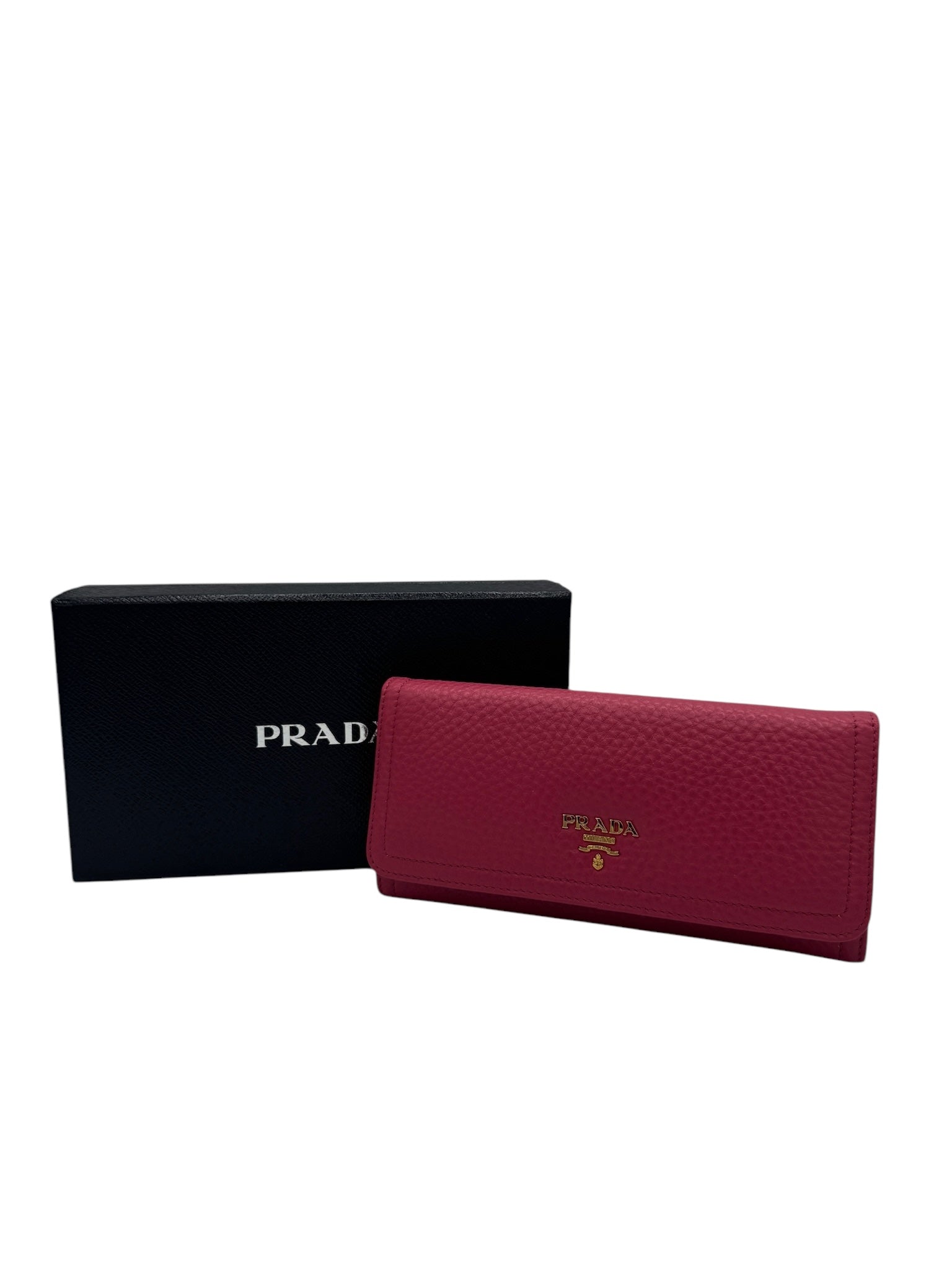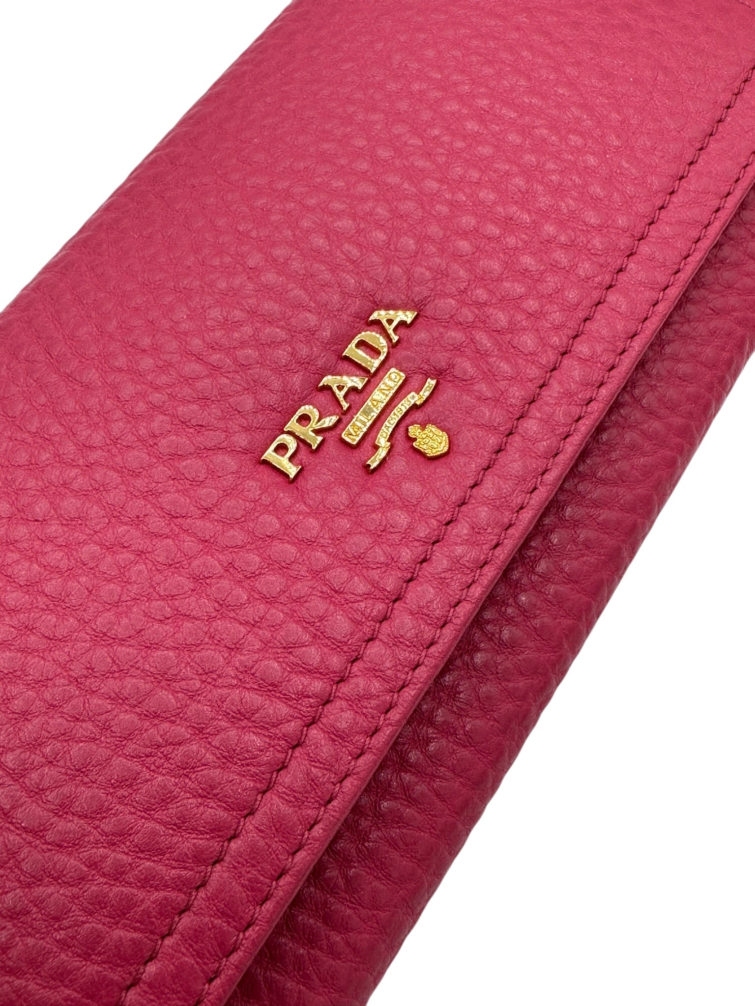 This pre-owned Prada Fucsia Leather Long Wallet is in excellent condition, with only slight scratches on the hardware. Embrace the stunning color and luxurious feel of this wallet, the perfect accessory for any outfit. Keep your essentials organized and make a statement with this wallet in your hand!