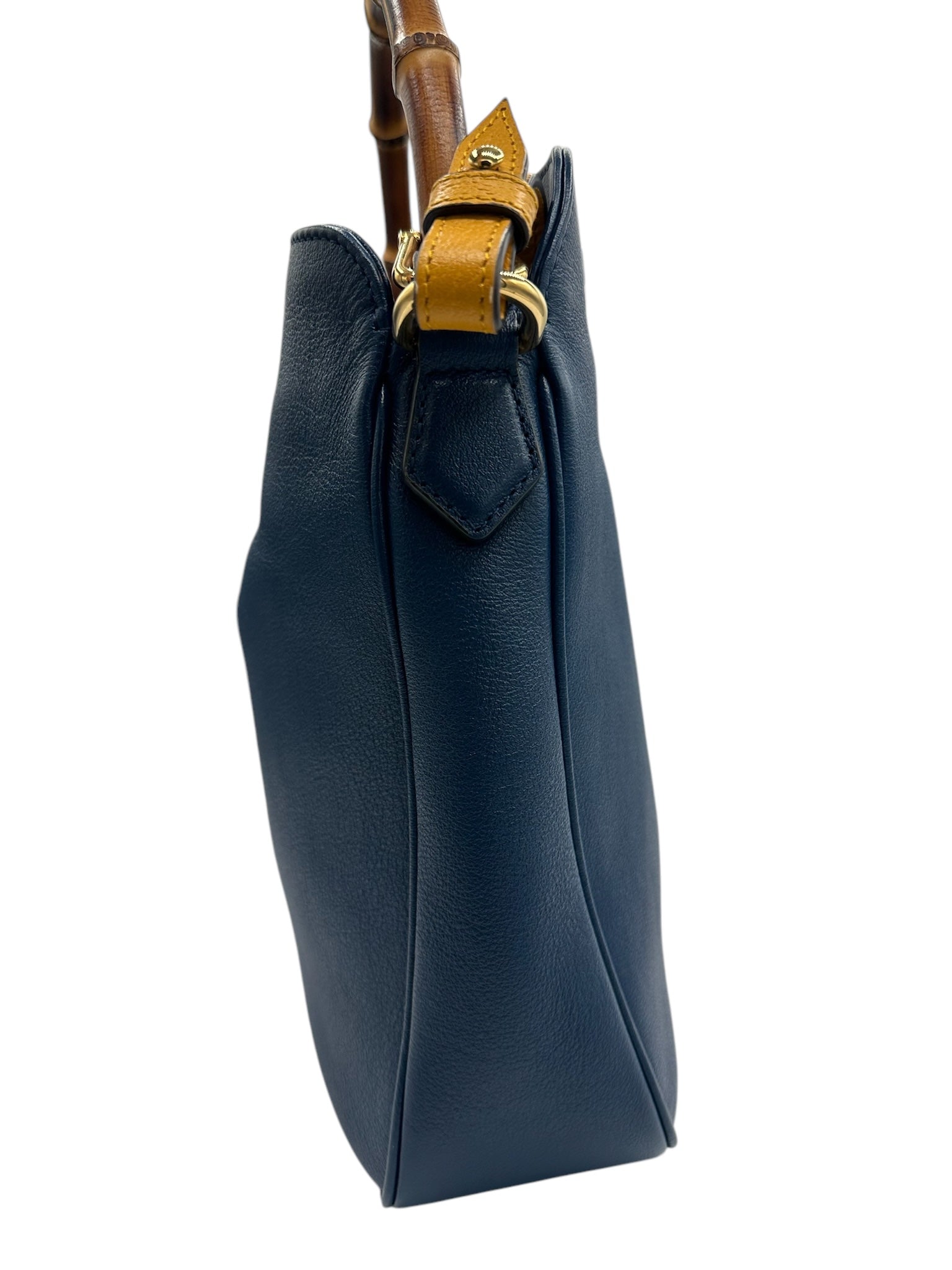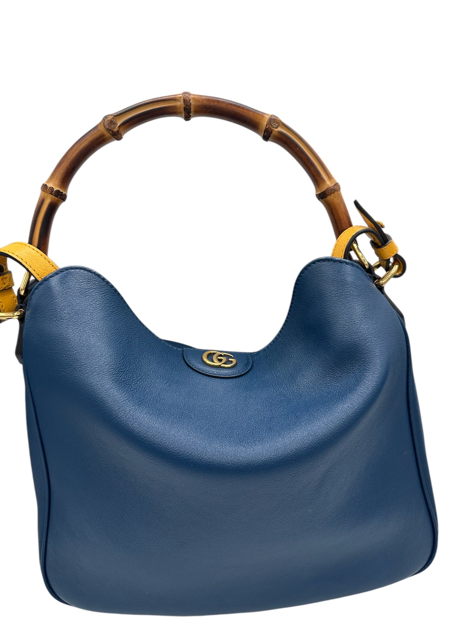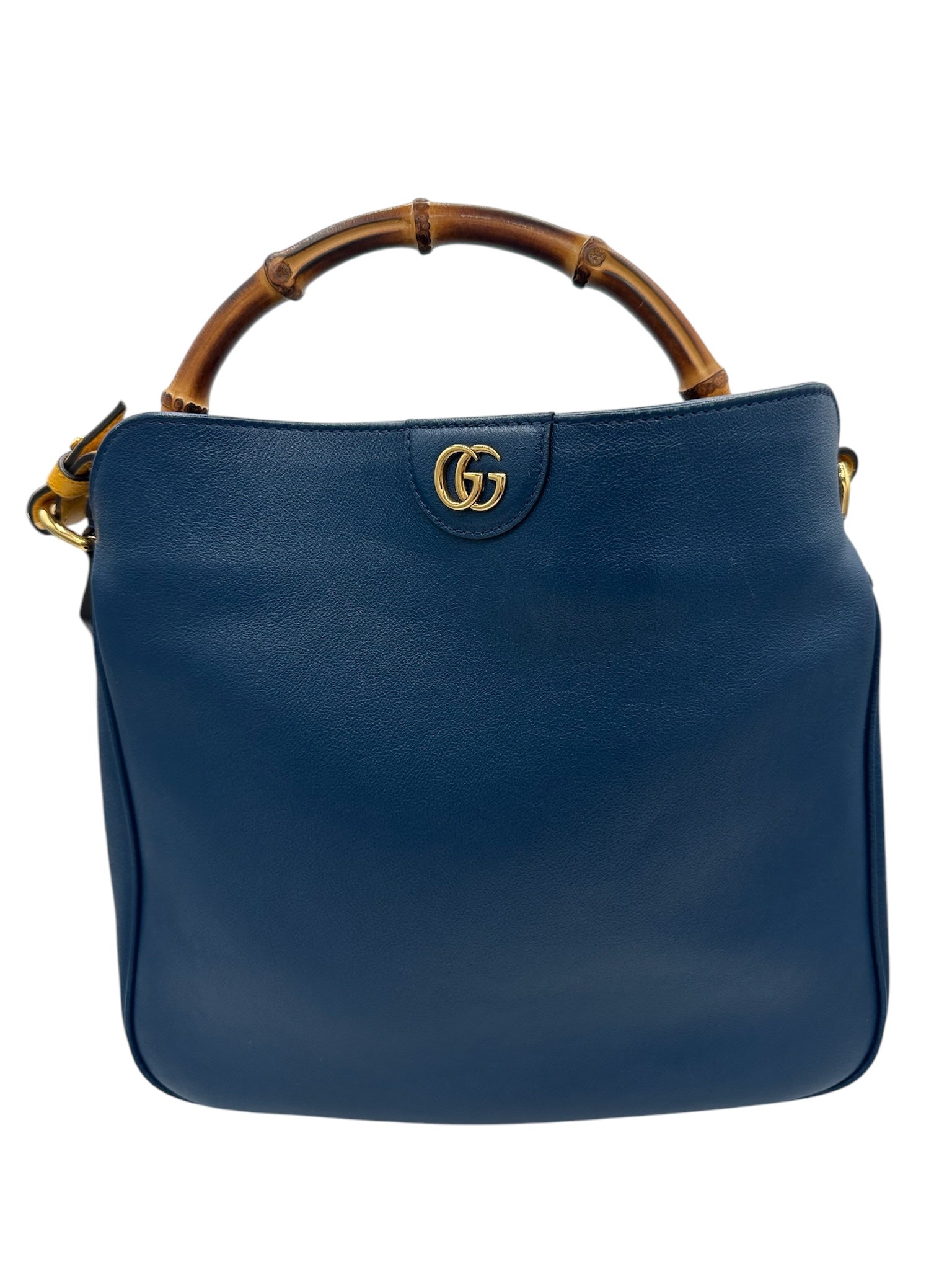 Elevate your style with the PRE-OWNED GG Bamboo Navy Blue Diana Tote. Crafted from high-quality materials, this shoulder bag boasts a golden toned hardware and a striking navy color. The bag silhouette of this shoulder bag exudes sophistication and luxury, making it a versatile accessory for any outfit. The entrupy agency has authenticated this exquisite piece.