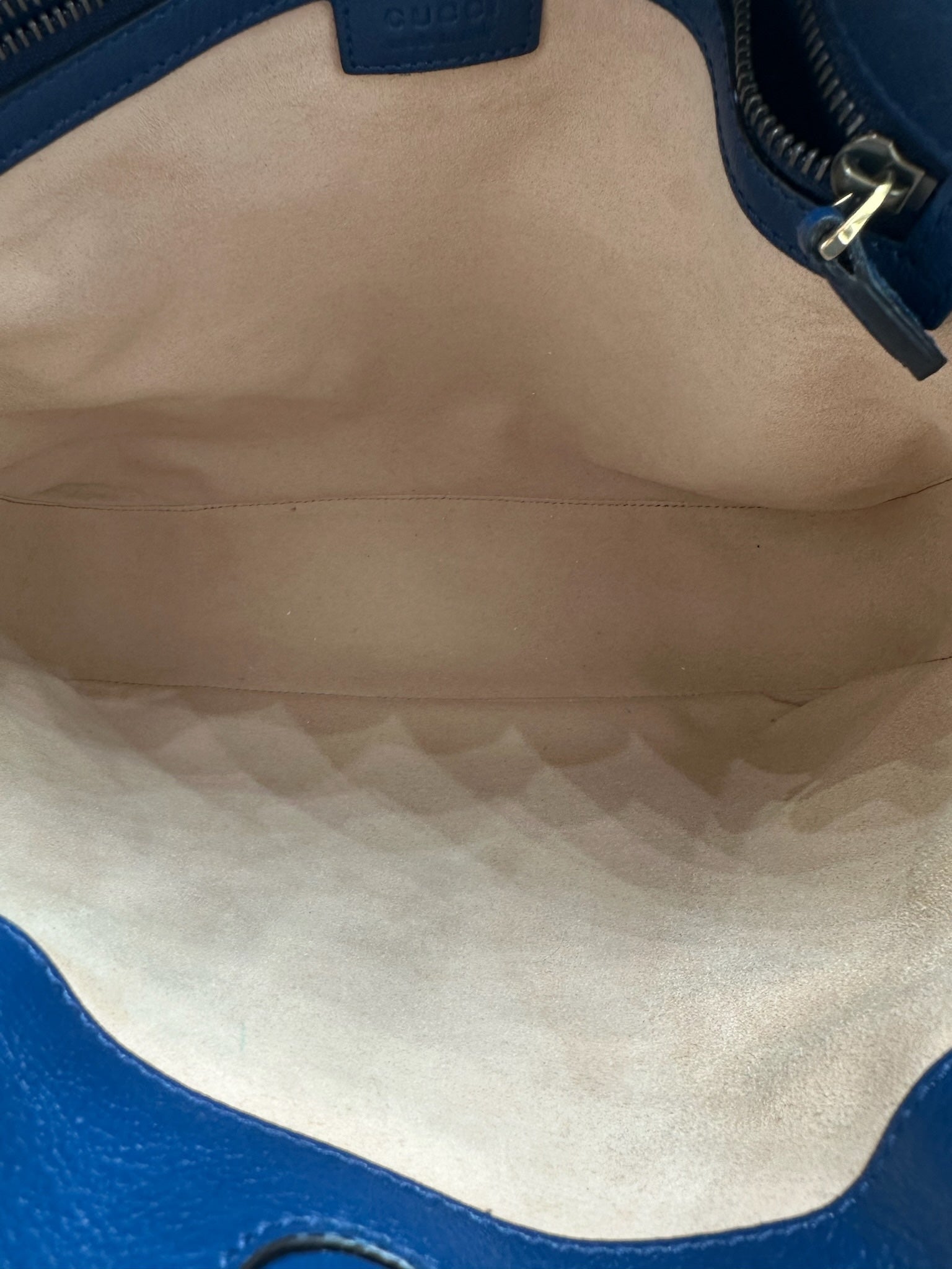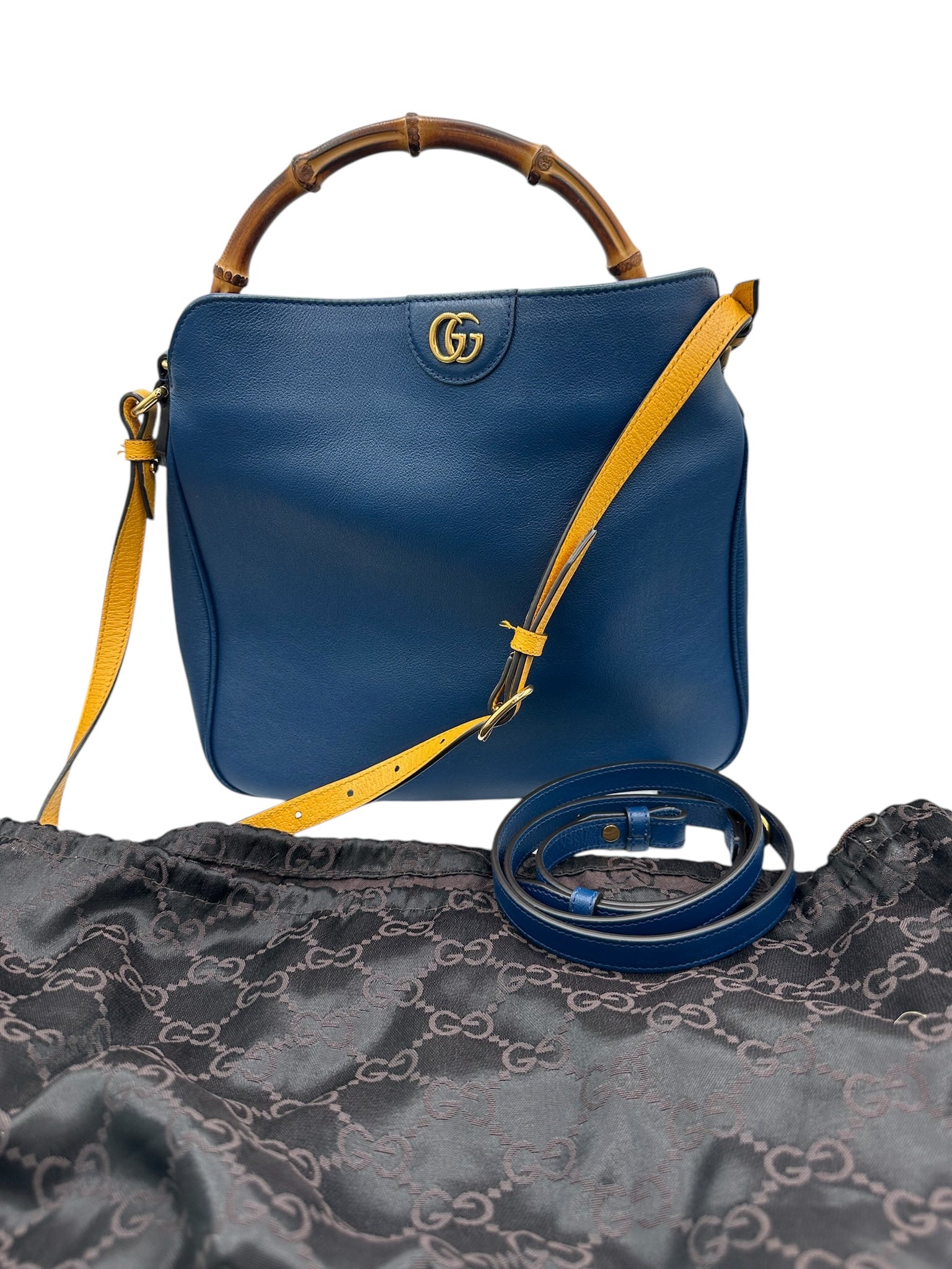 This pre-owned GUCCI GG Bamboo Navy Blue Diana Tote Shoulder Bag features golden toned hardware and is in excellent condition, with only a small scratch on the front. It comes with a dustbag for safekeeping.
