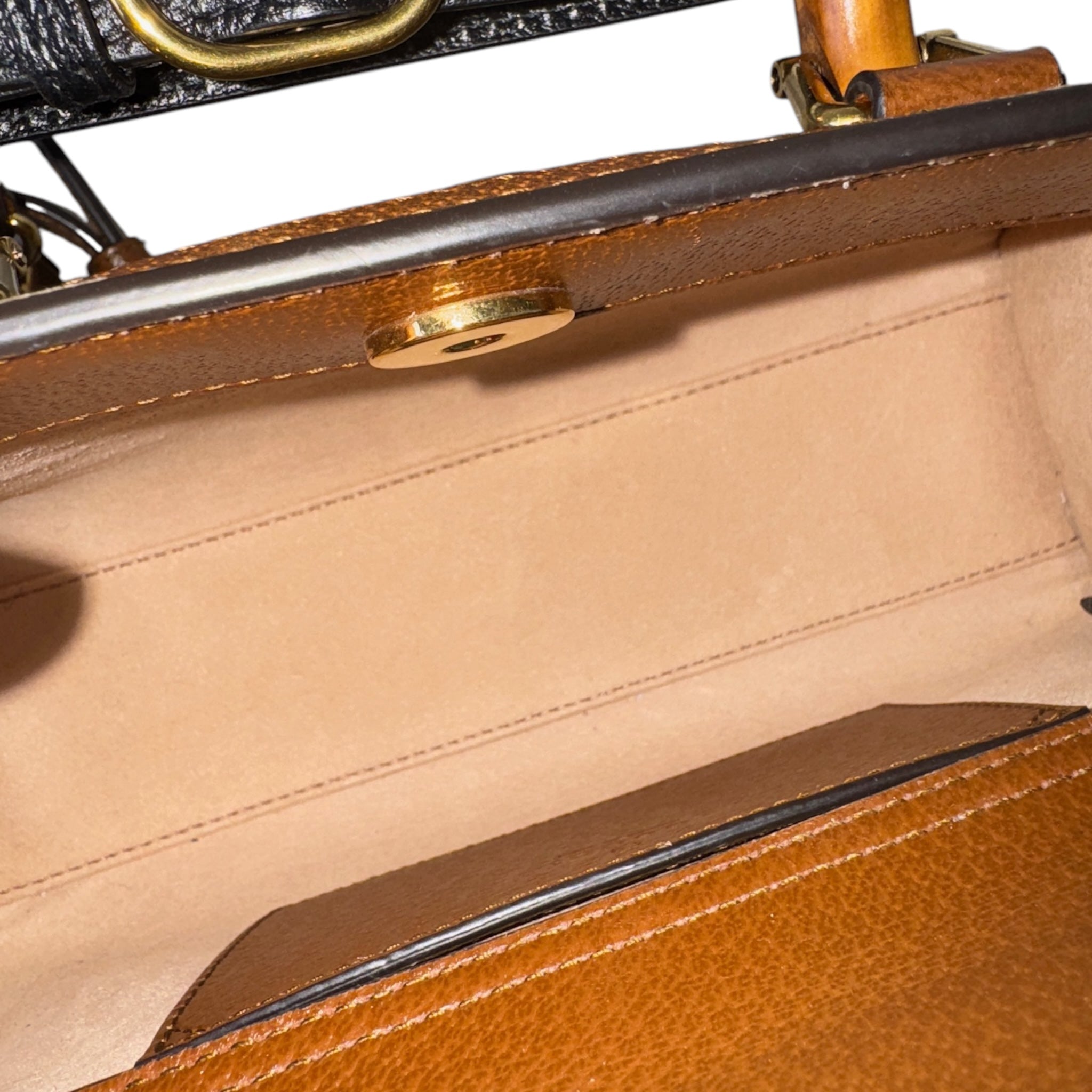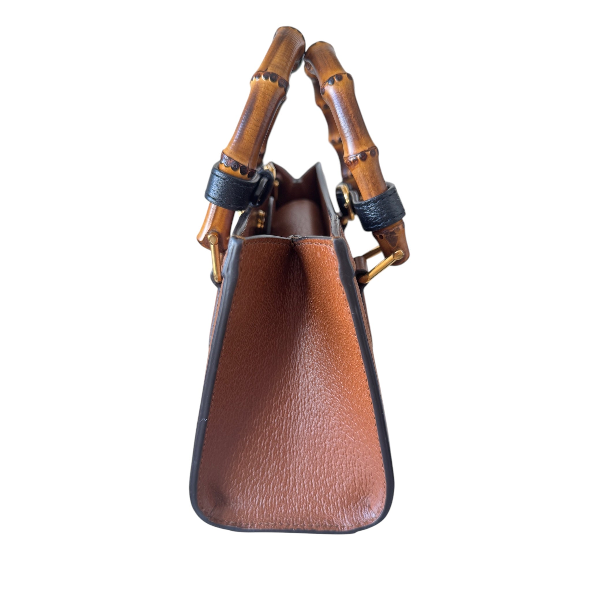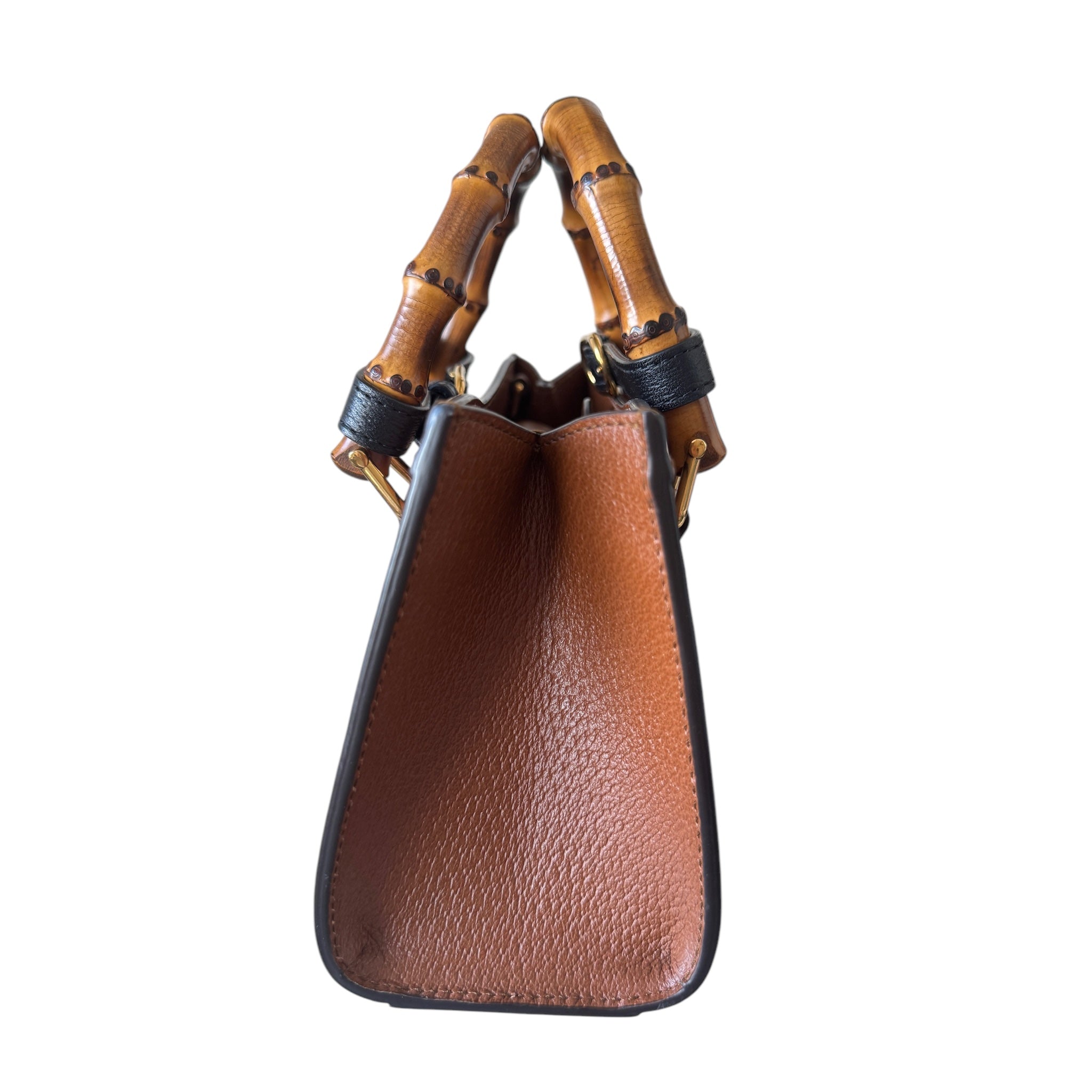 This luxurious tote features a golden toned hardware that adds a touch of elegance and sophistication to any outfit. Made with high-quality leather, the chain bamboo handle provides a comfortable and stylish way to carry this small tote. Complete your look with this pre-owned GG Diana NM tote. Dimensions: 10"W x 6"H x 3.5"D