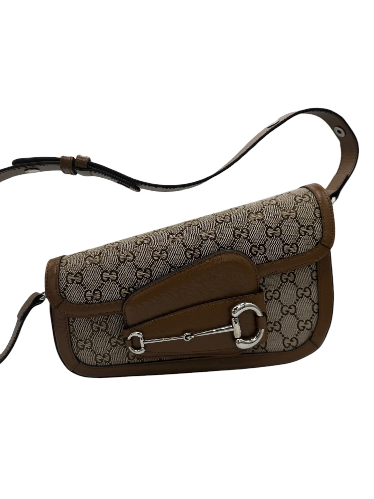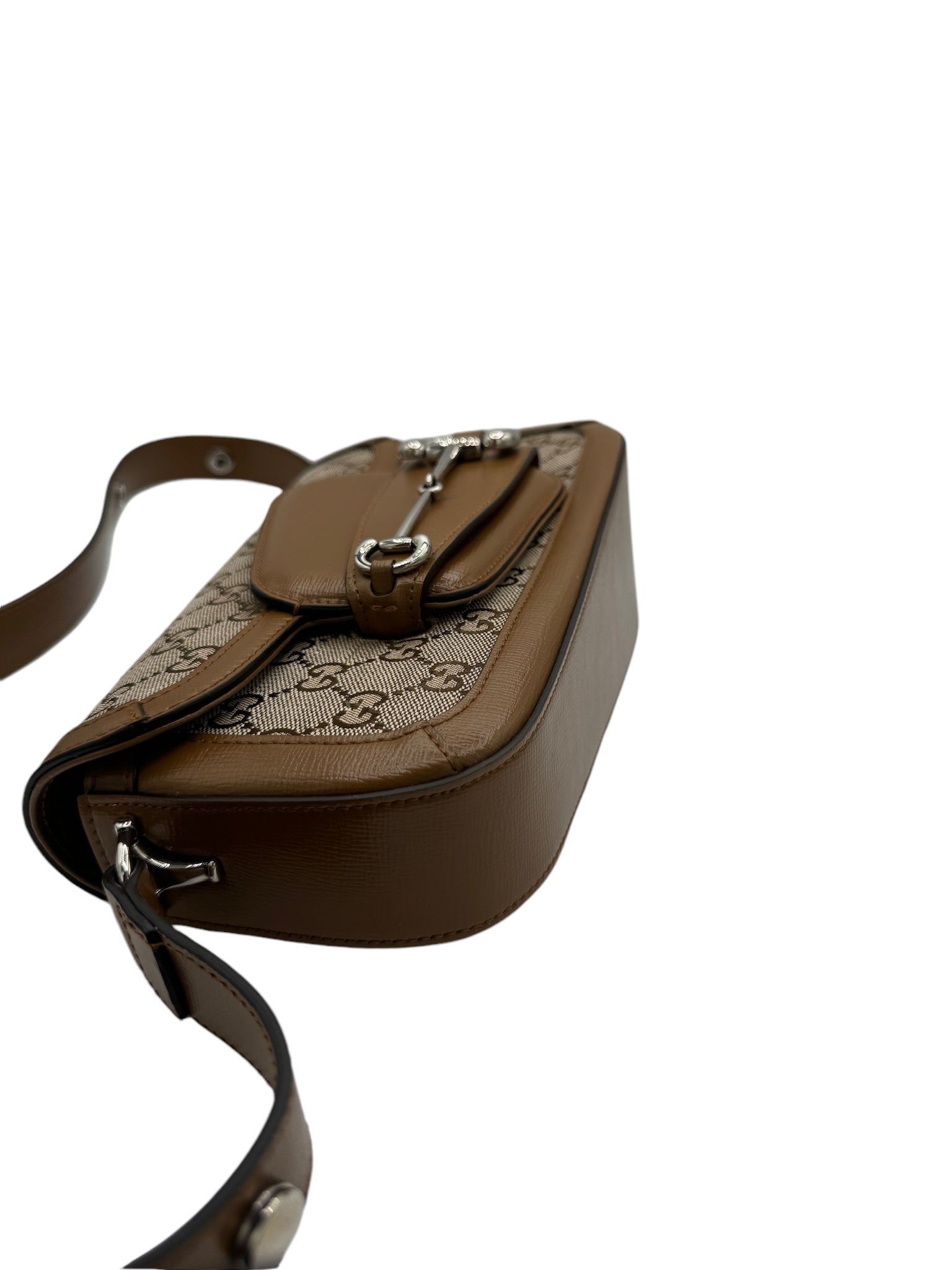 PRE-OWNED GG Horsebit 1955 Small Beige Khaki Jacquard Leather Shoulder Bag