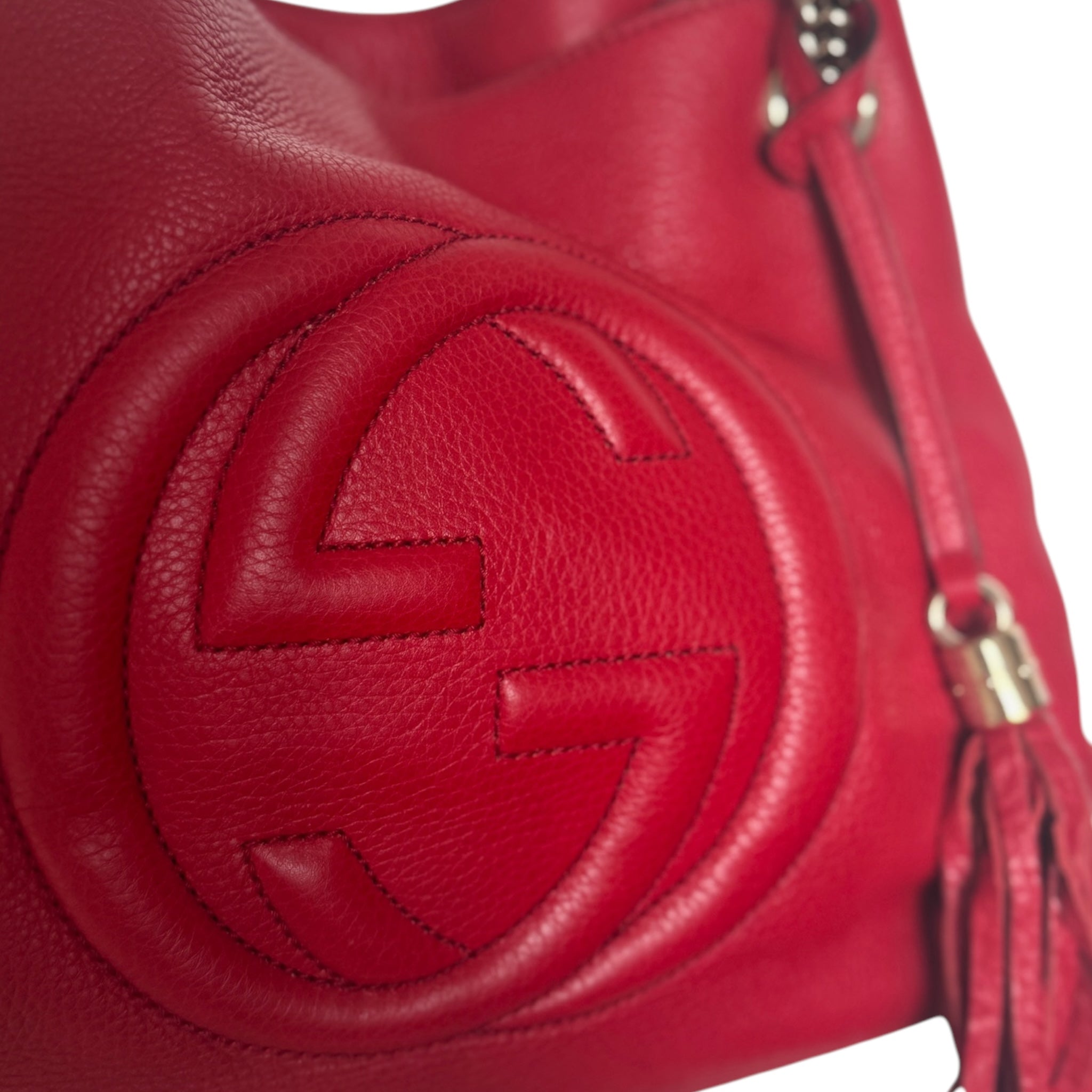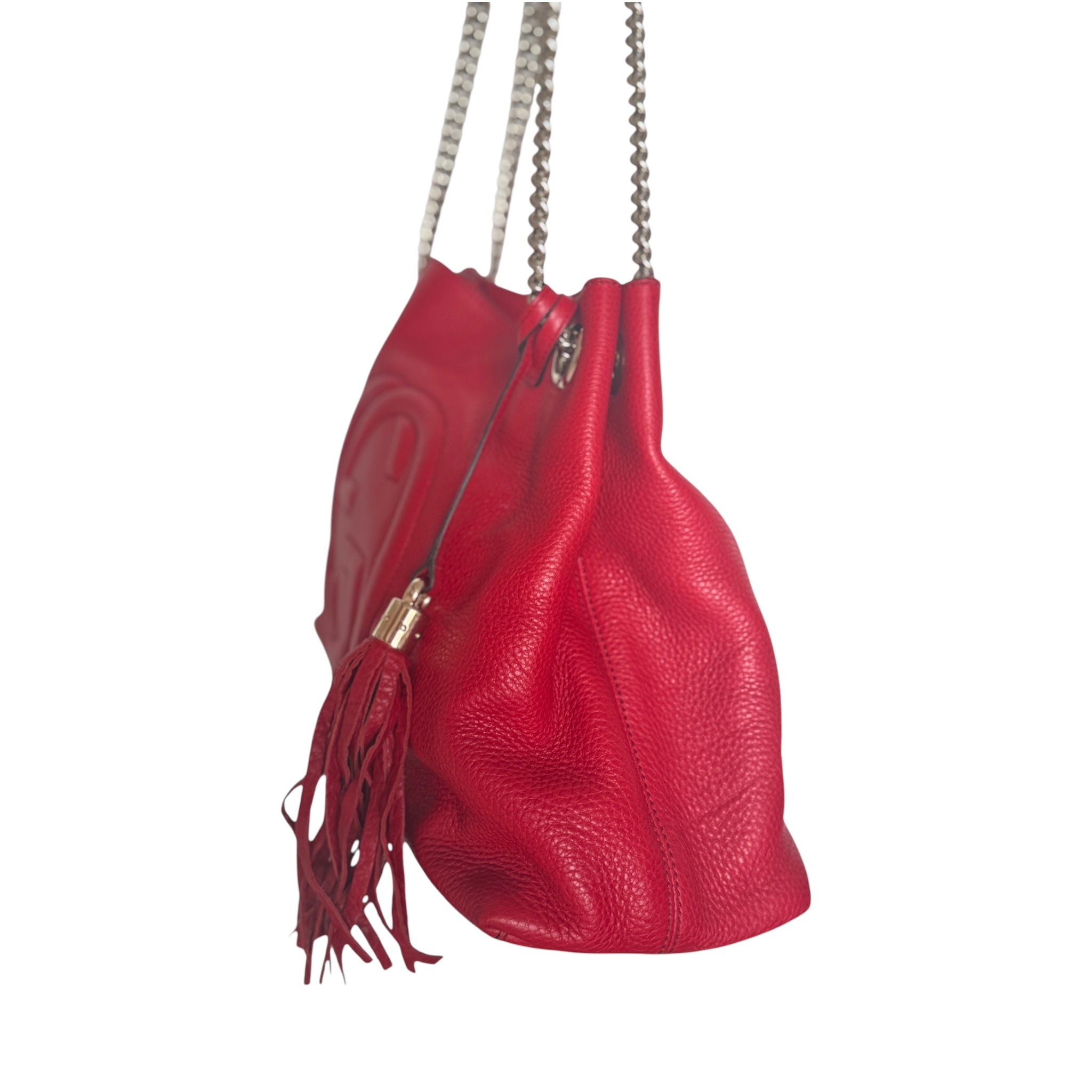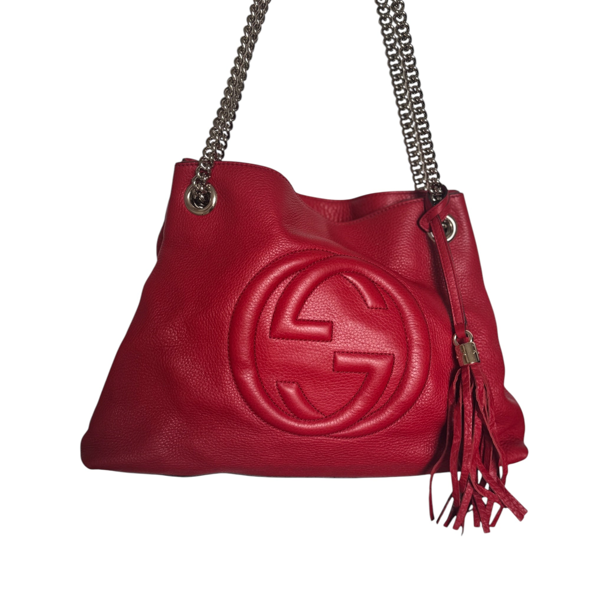 Discover the perfect blend of style and functionality with the GUCCI Red Leather Soho Chain Shoulder Bag. This versatile accessory is designed to elevate your everyday look.