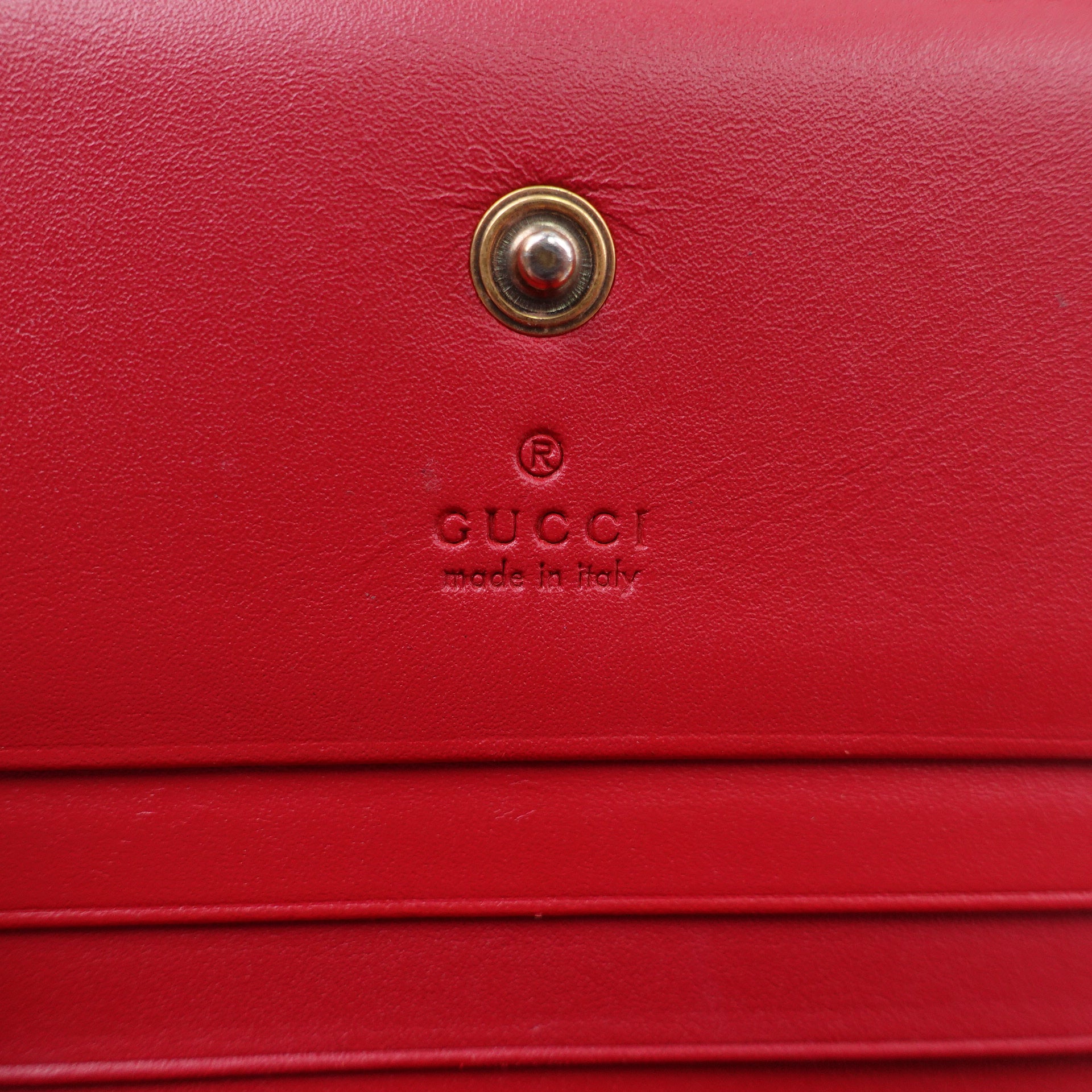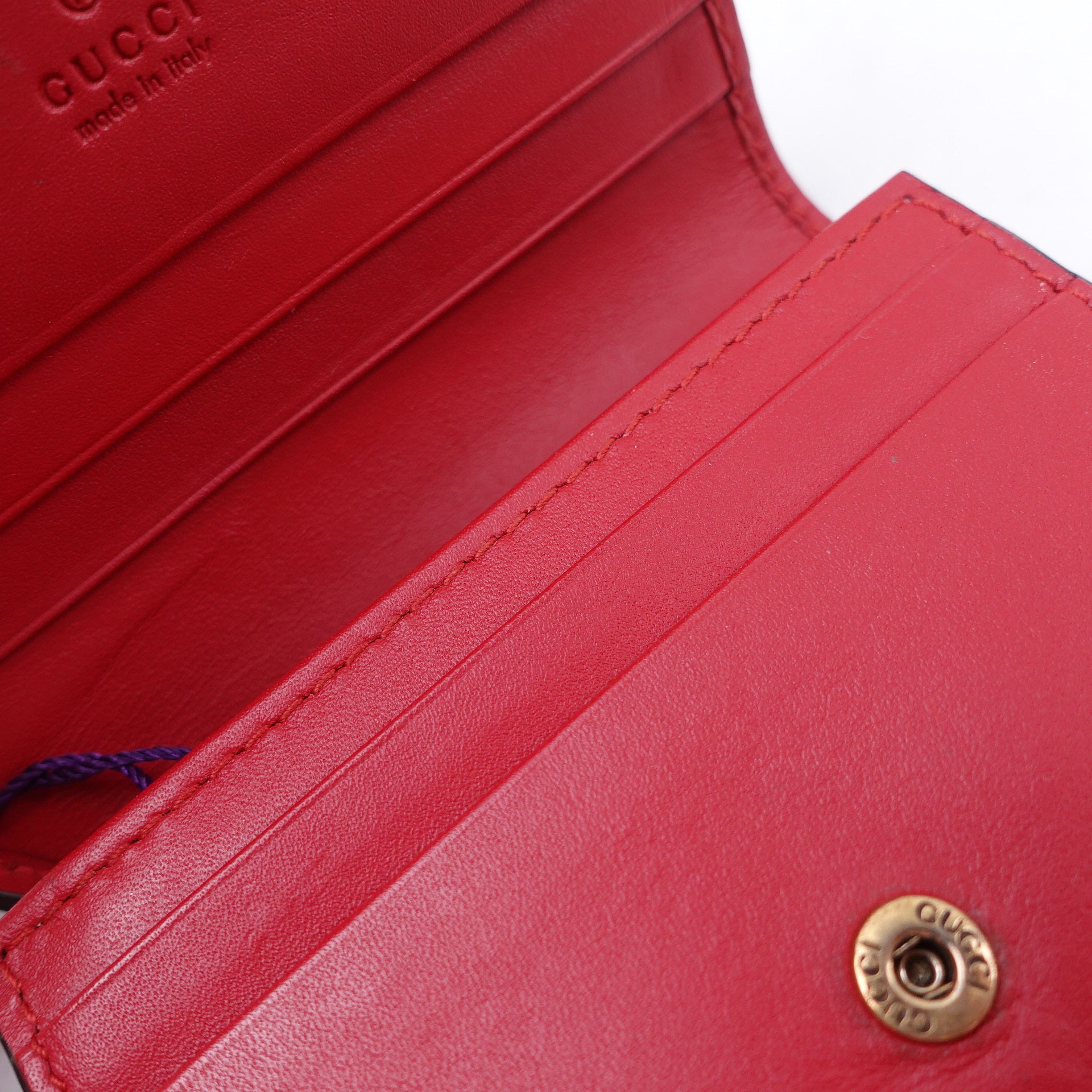 This PRE-OWNED GG Supreme Cherries Card Case Wallet boasts stunning gold toned hardware, adding a touch of elegance to your everyday essentials. The perfect combination of style and practicality, it's the ideal choice for the fashion-forward individual looking to make a statement. Treat yourself to this luxurious upgrade to your accessory game today! Dimensions: 4.25'' x 1'' x 3.25''