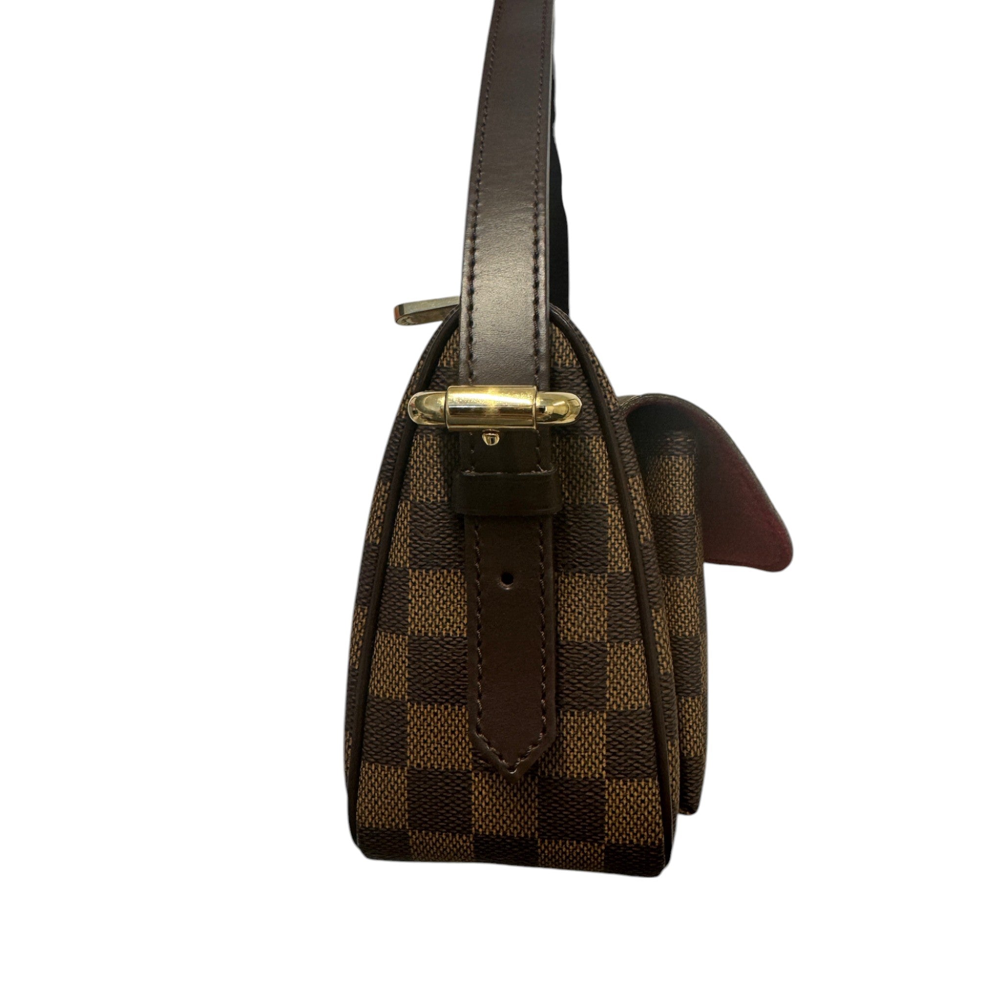 Upgrade your style game with this PRE-OWNED LV Damier Ebene Canvas Ravello GM Shoulder Bag. Complete with golden toned hardware, this bag adds a touch of elegance to any outfit. The perfect accessory for the fashion-forward individual. Measures: Length: 26 cm. Width: 8 cm. Height: 16 cm