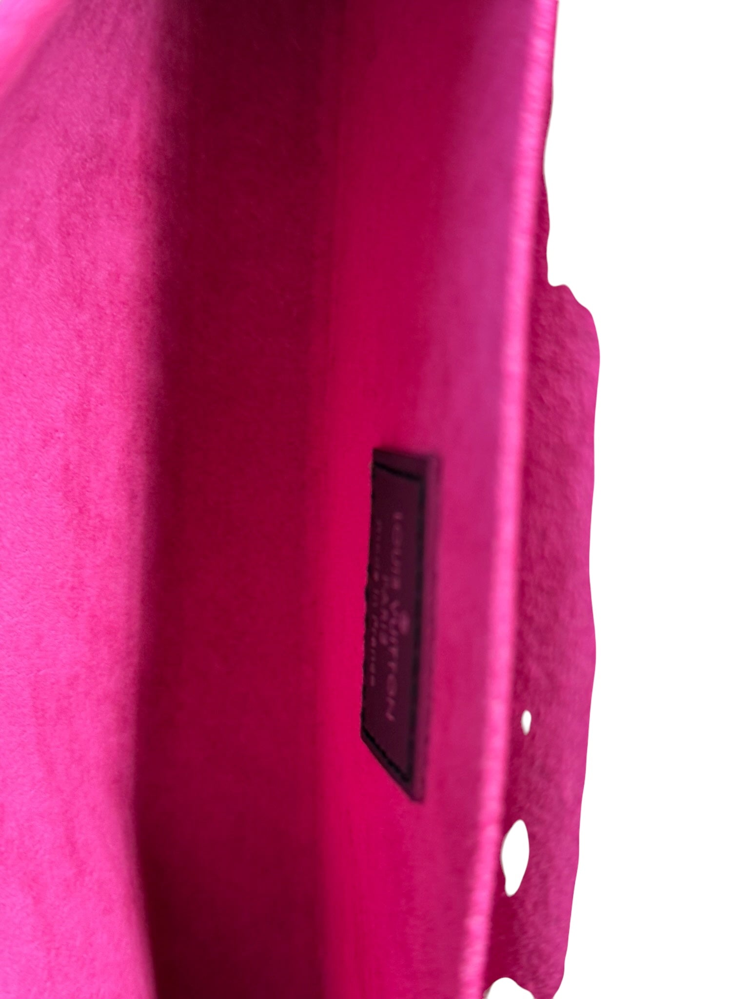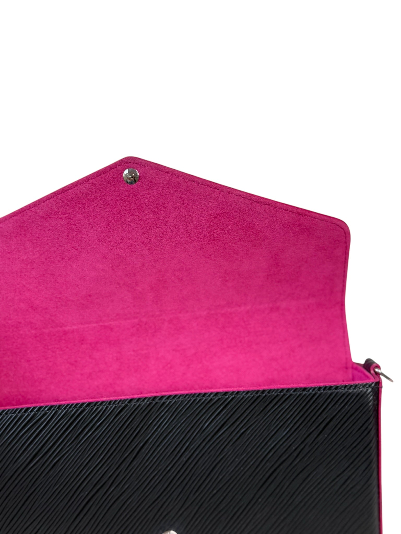 This PRE-OWNED LV Felicie Epi Crossbody Bag is a must-have for any fashionista! The silver toned hardware adds a touch of luxury while the pink lining adds a pop of color. It comes all set and measures 8.25''x1.25''x4.5'', making it the perfect size for all your essentials on the go. Elevate your style with this stunning crossbody bag!