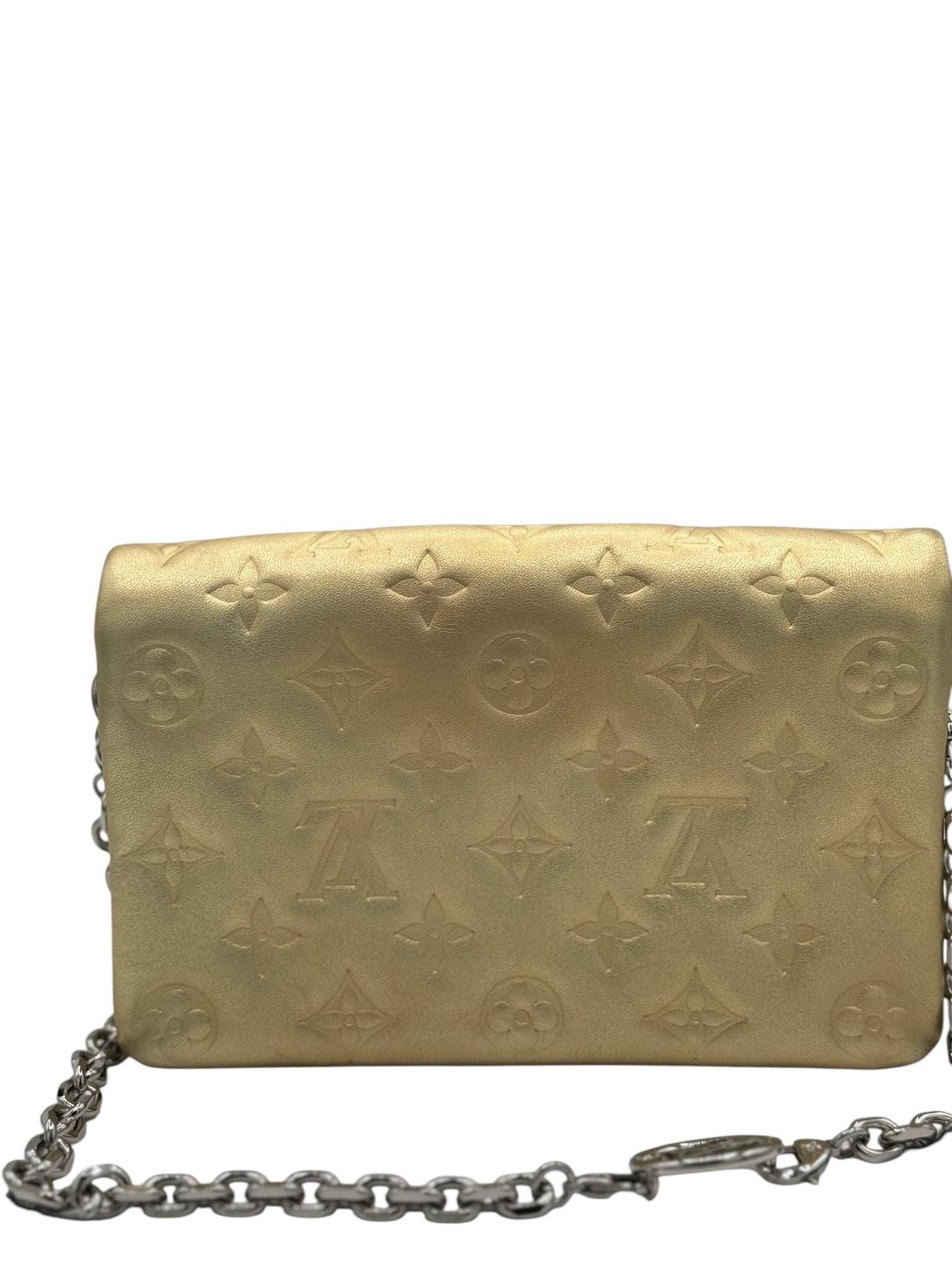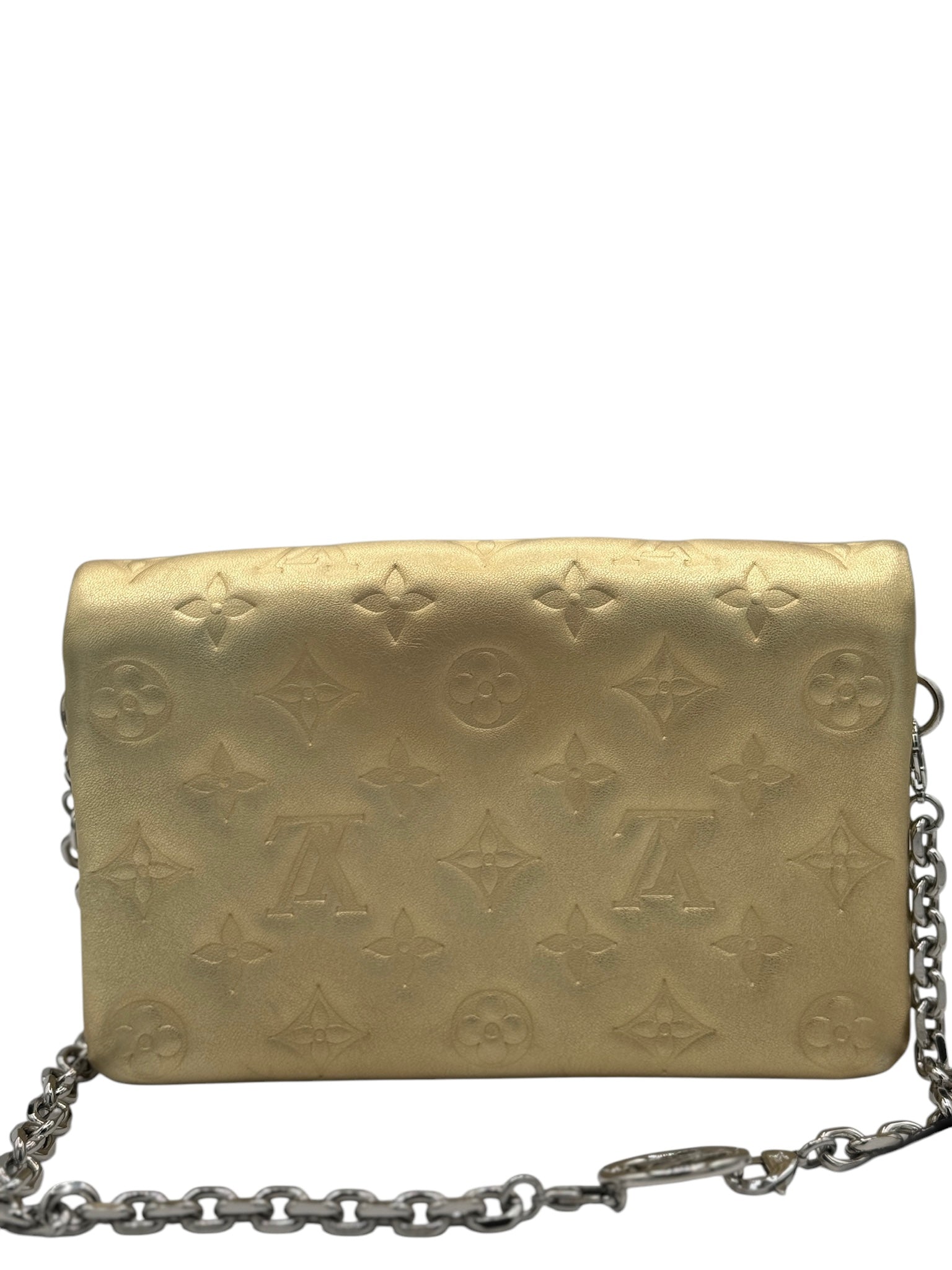 This bag is a versatile accessory that can complement various outfits and occasions. Enjoy the combination of quality and style with the pre-owned Louis Vuitton Pochette Coussin Gold Lambskin Leather Crossbody Bag.