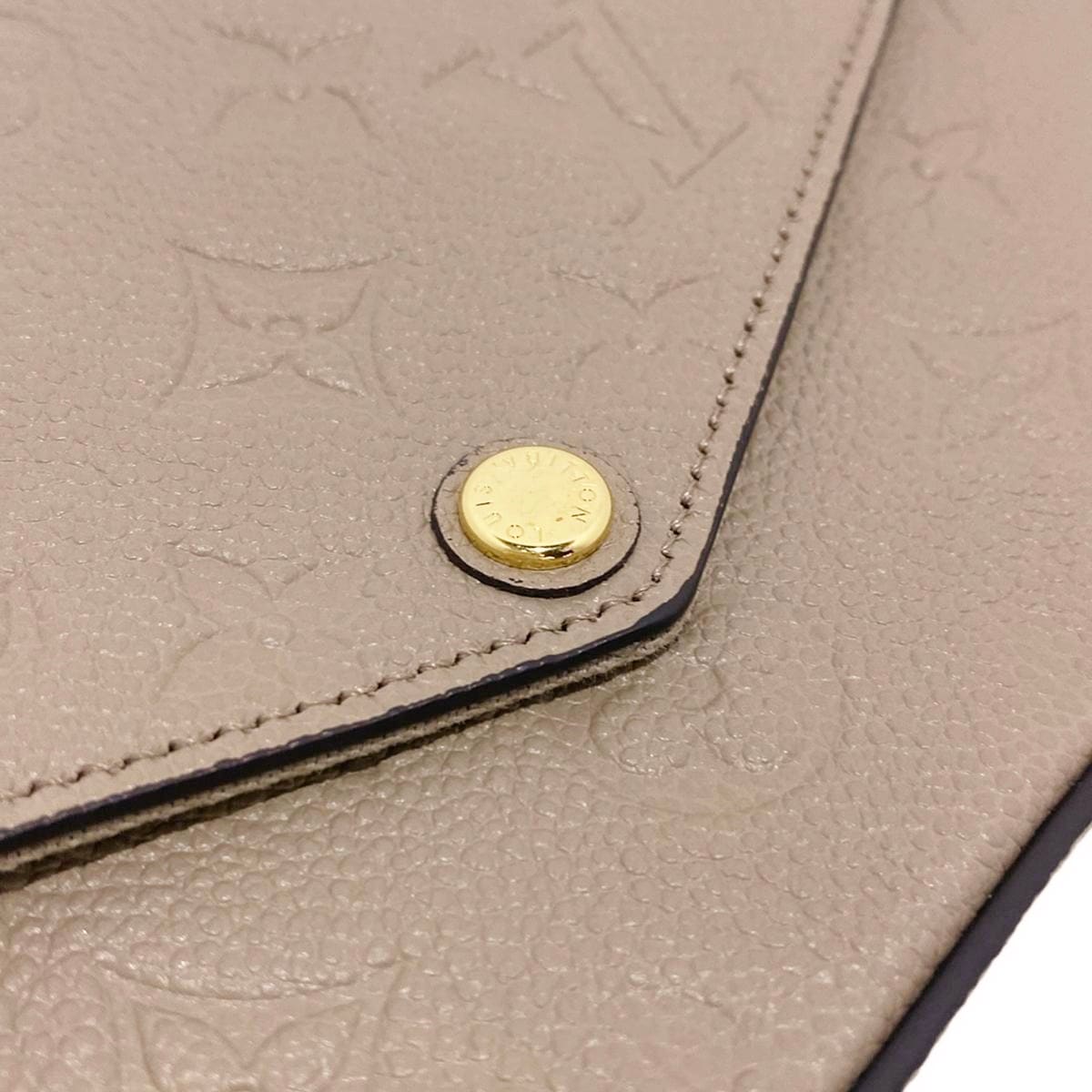 This pre-owned Louis Vuitton Pochette Felice Monogram Empreinte Tourterelle Crossbody Bag comes in a beautiful beige color, crafted from luxurious leather.