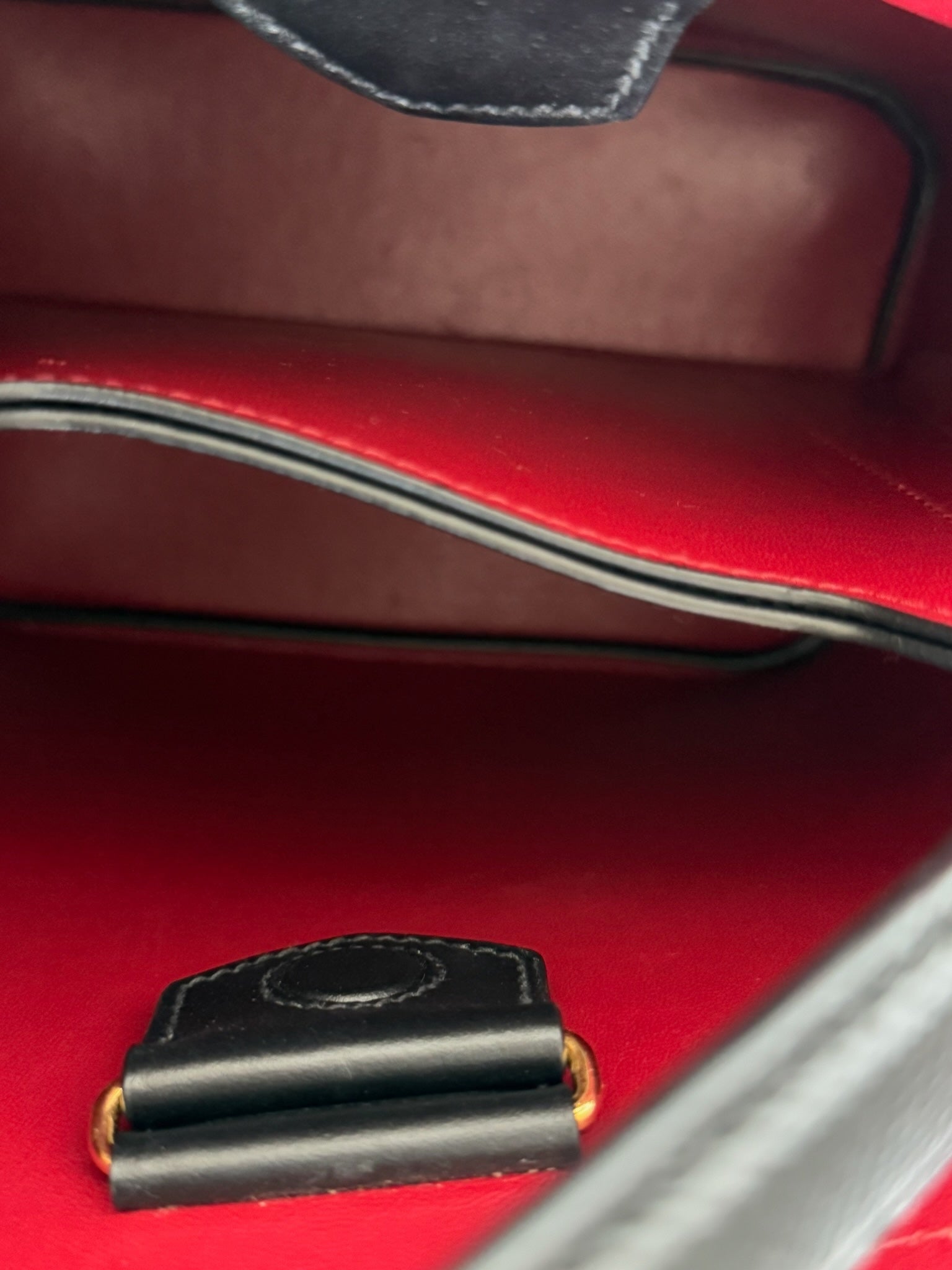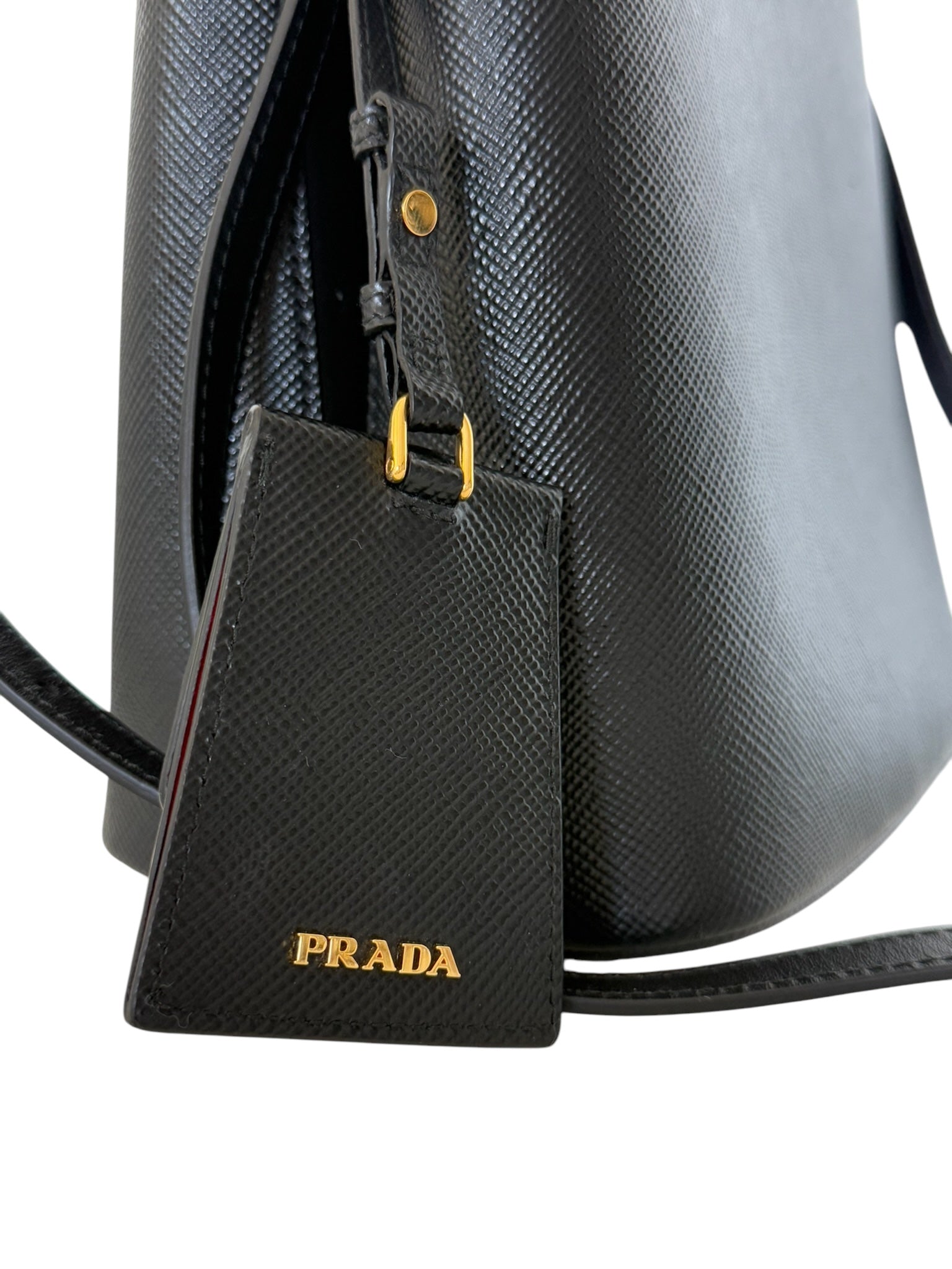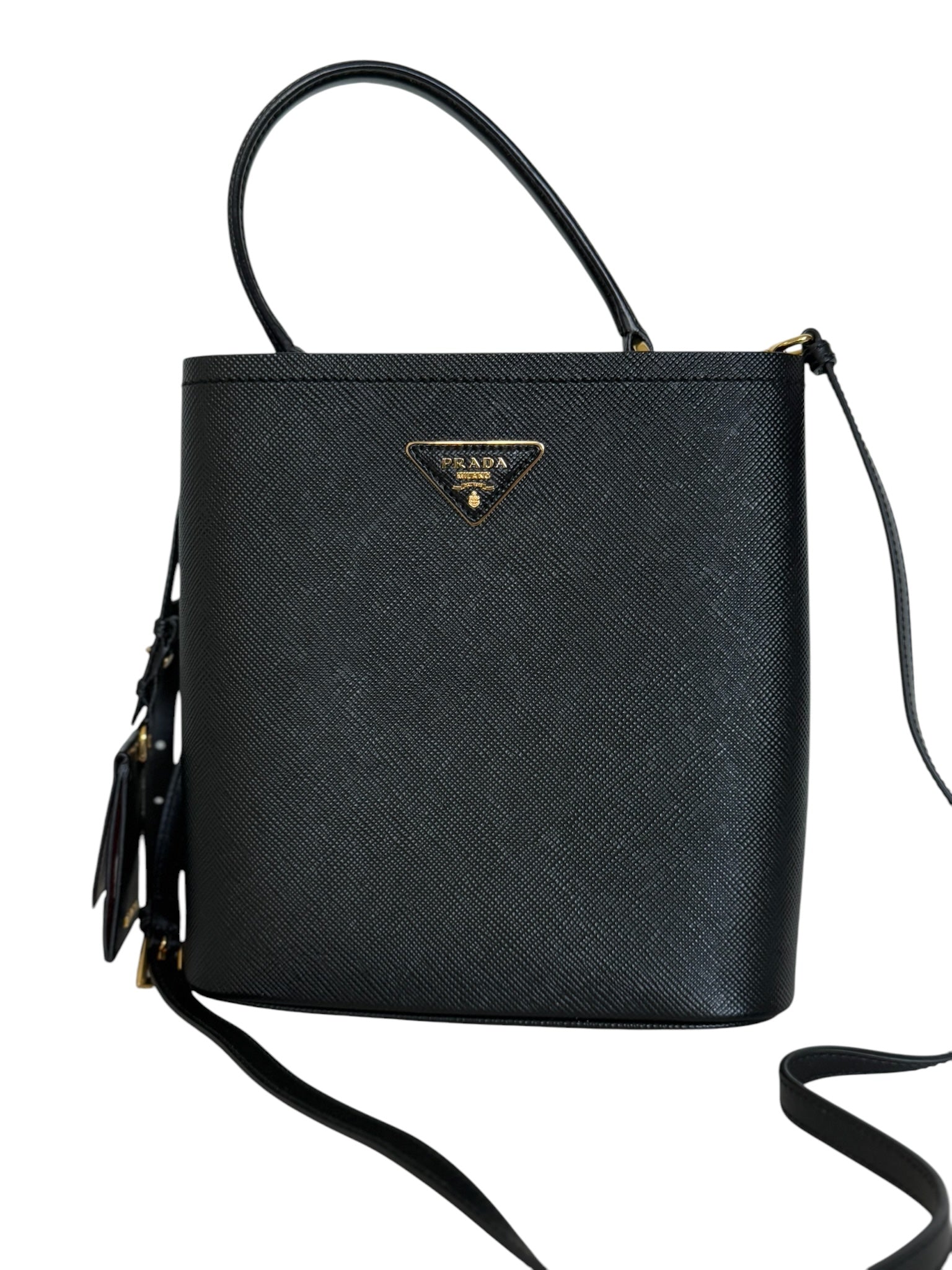 Carry your essentials in style with this PRE-OWNED Panier Black Saffiano Shoulder Bag. The luxurious golden toned hardware adds a touch of elegance, while the vibrant red lining adds a pop of color. Compact yet spacious, measuring 8.5''x5.25''x9'', it's the perfect accessory for any occasion!