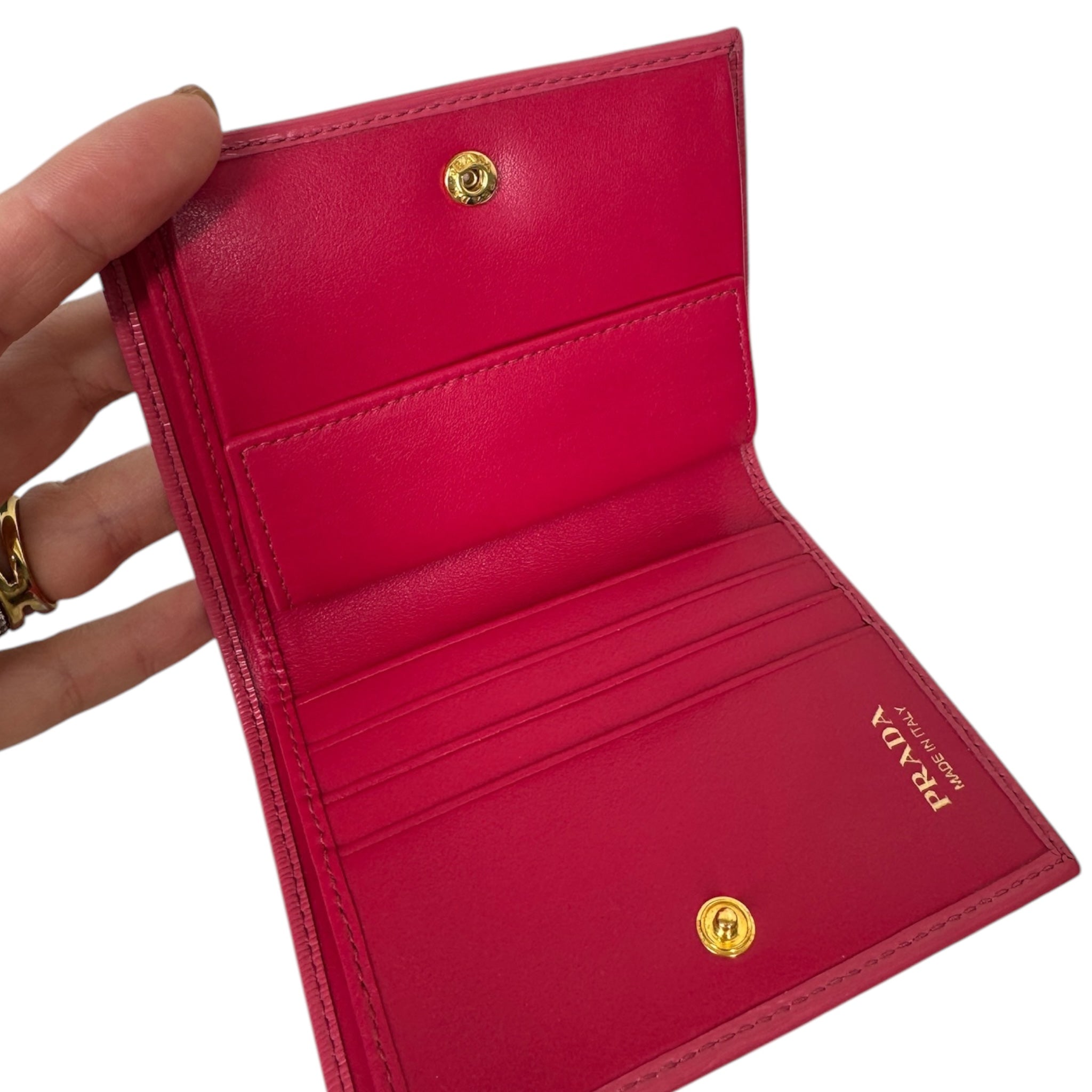 - Material: Crafted from high-quality pink Saffiano leather, this wallet offers a luxurious feel and a sophisticated look.